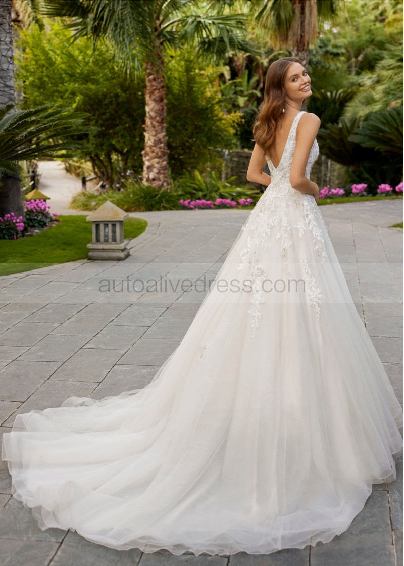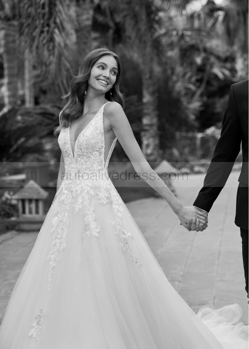 Beaded Plunging Neck Ivory Lace Tulle Exclusive Wedding Dress