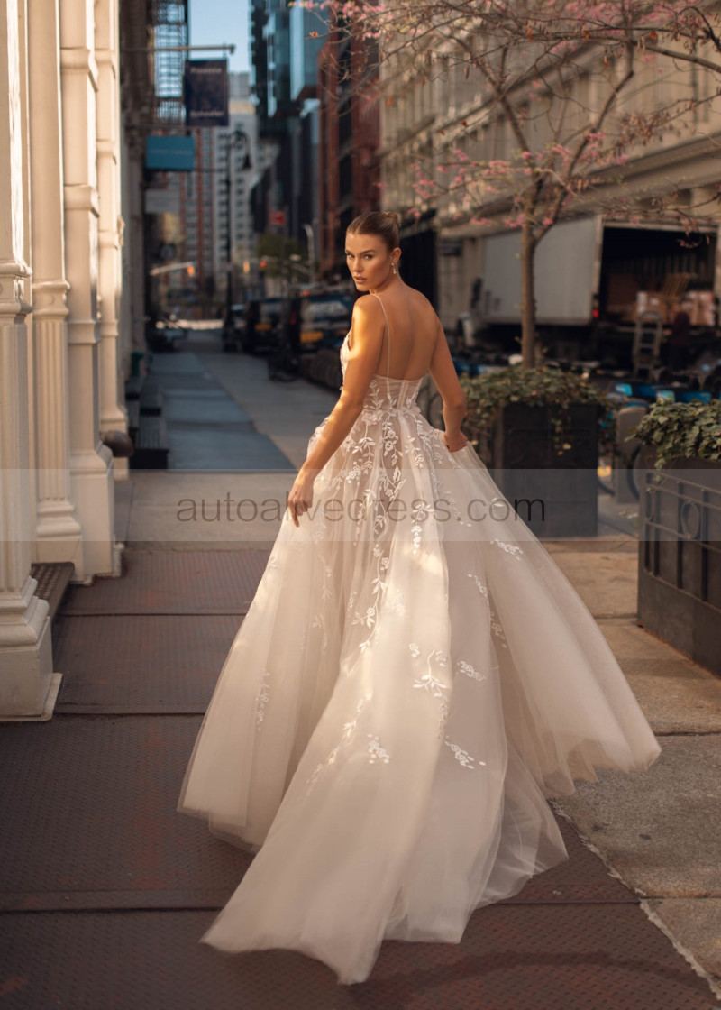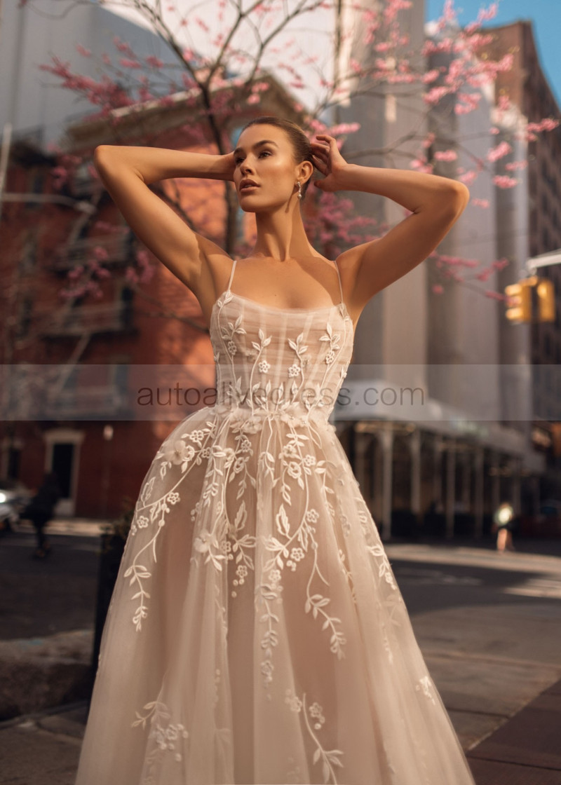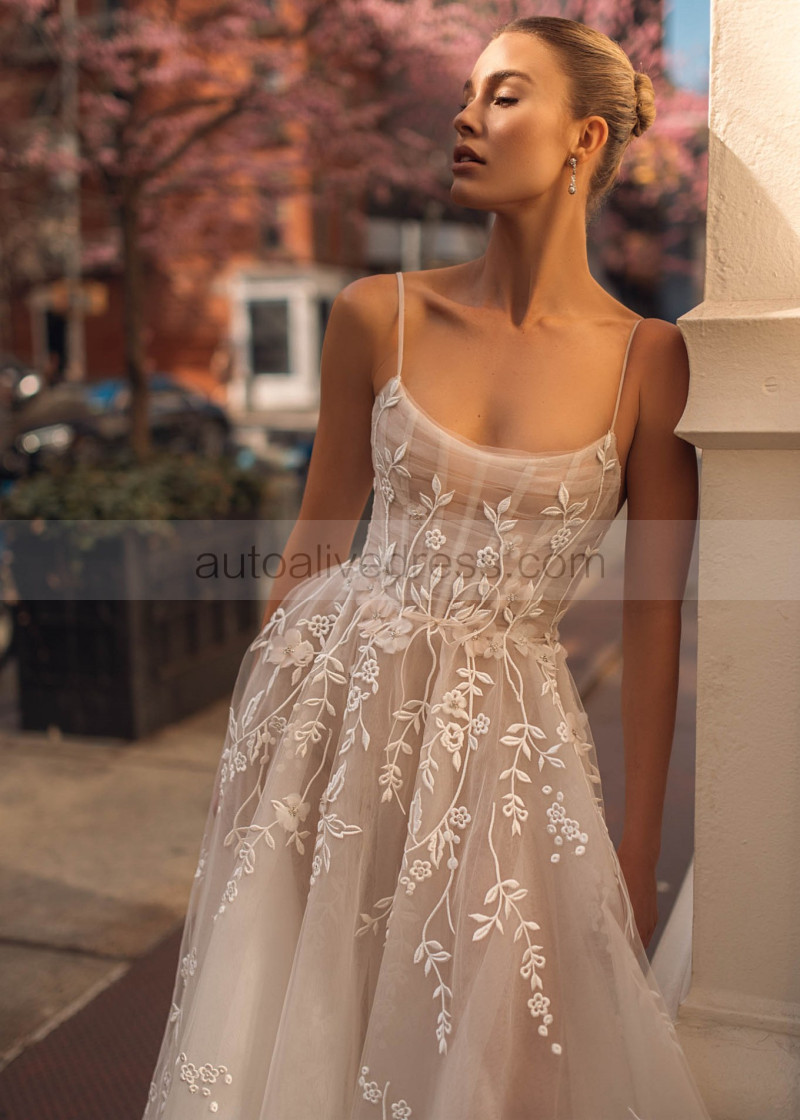 Beaded Spaghetti Straps Ivory 3D Lace Tulle Floral Wedding Dress