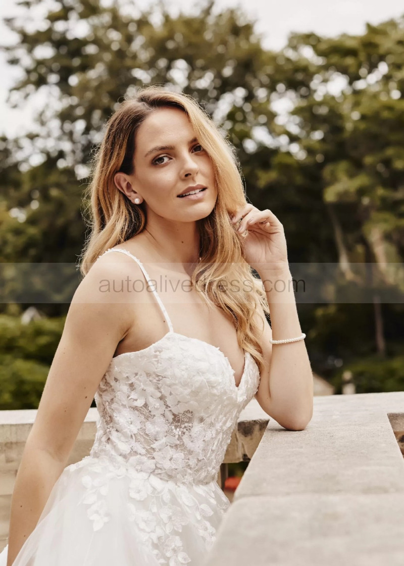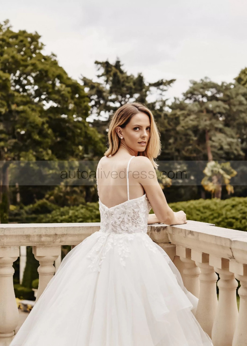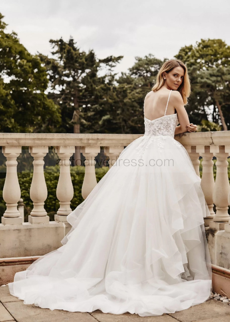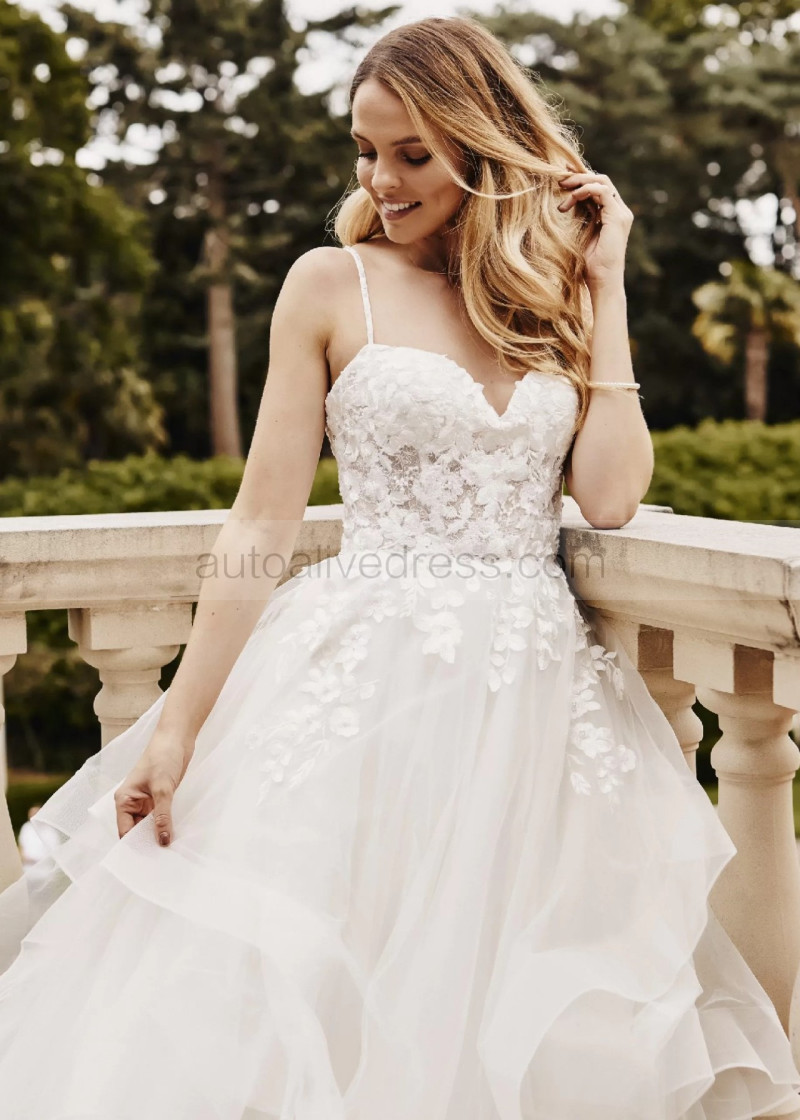 Beaded Spaghetti Straps Ivory Lace Tulle Ruffled Wedding Dress