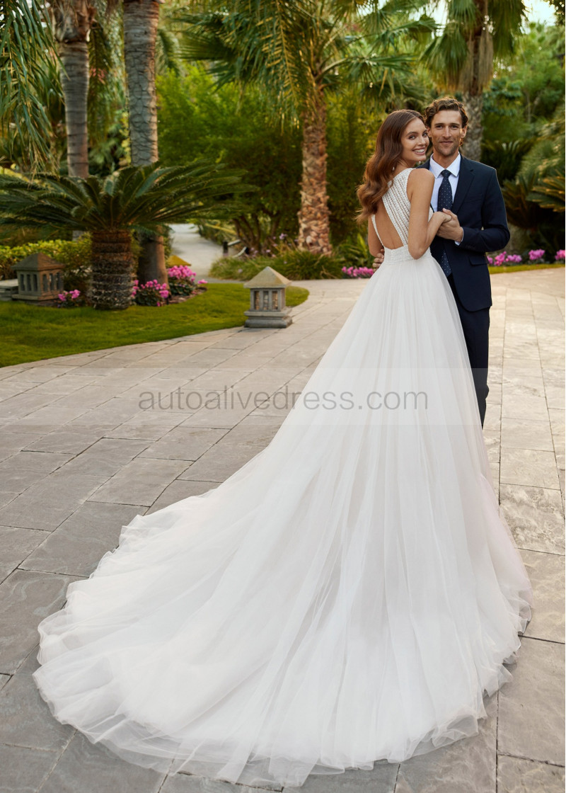 Beaded V Neck Ivory Lace Tulle Keyhole Back Dreamy Wedding Dress
