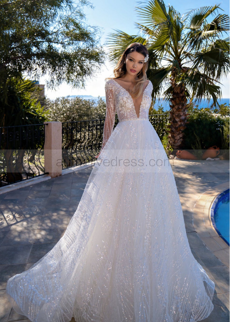 Beaded V Neck Ivory Sparkly Tulle Wedding Dress