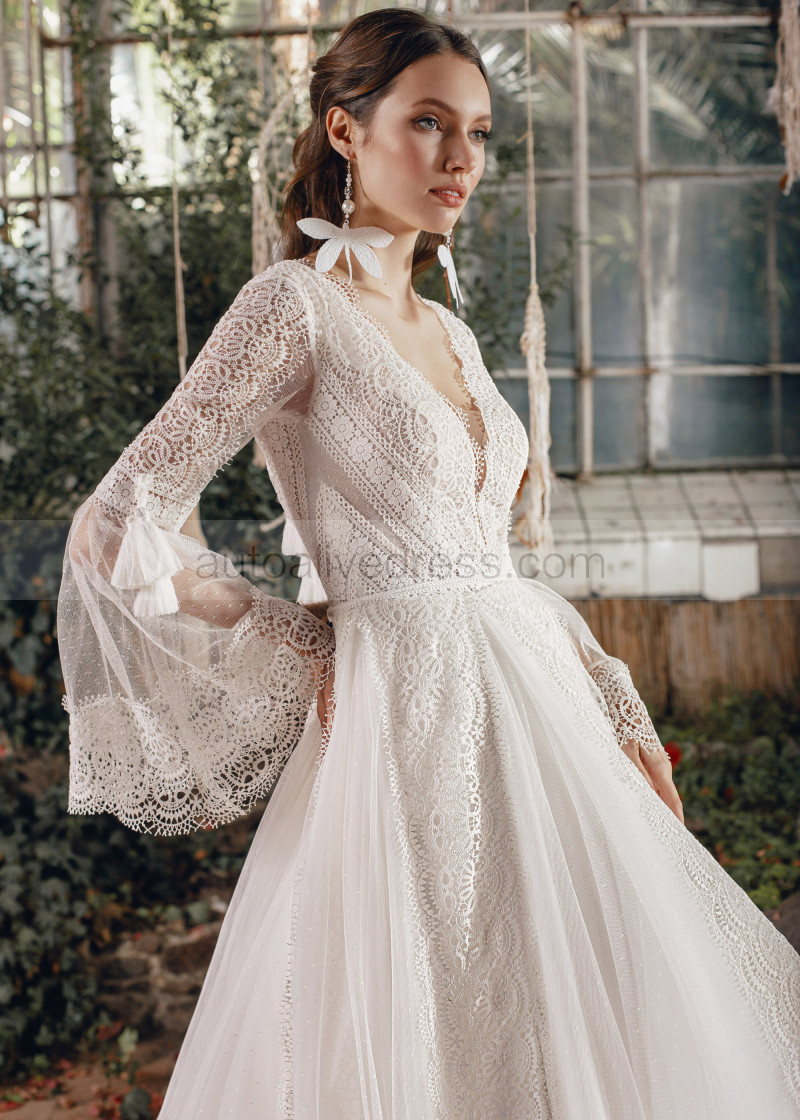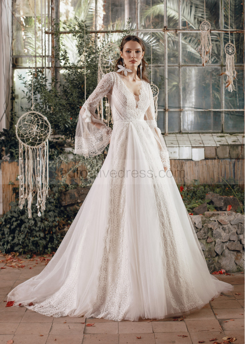 Bell Sleeves Ivory Lace Tulle Boho Wedding Dress