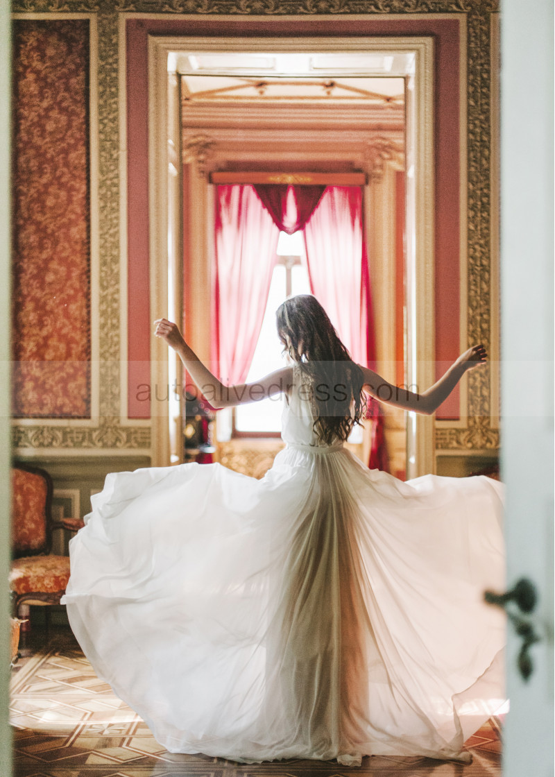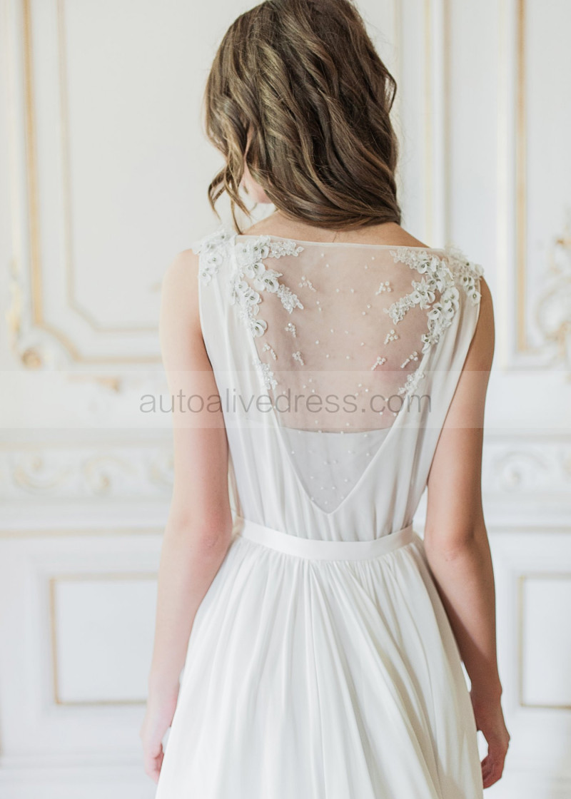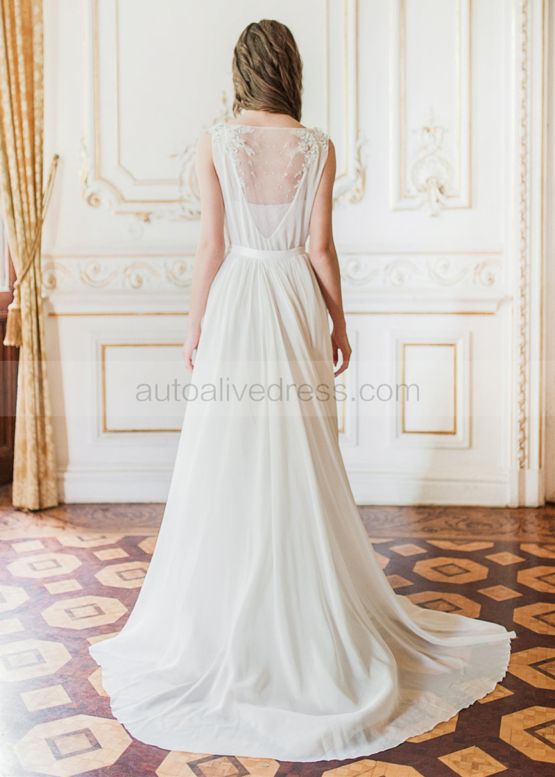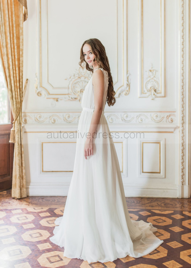 Boat Neck Beaded Ivory Lace Chiffon Wedding Dress