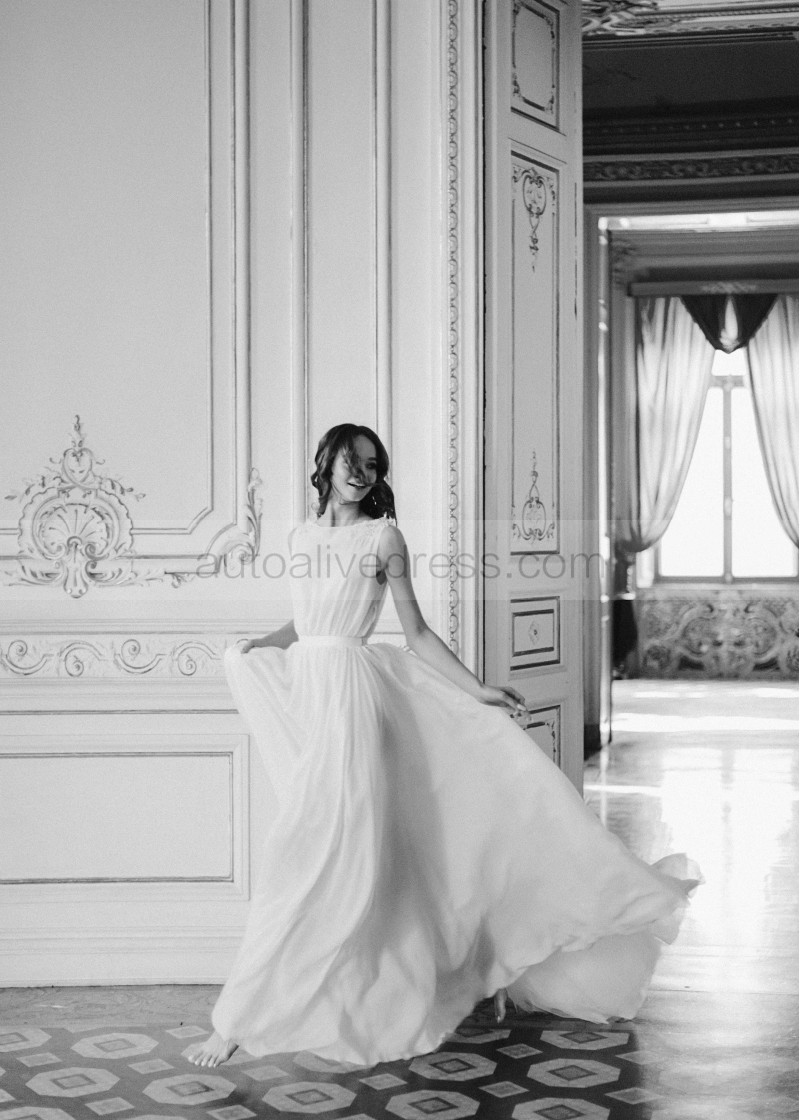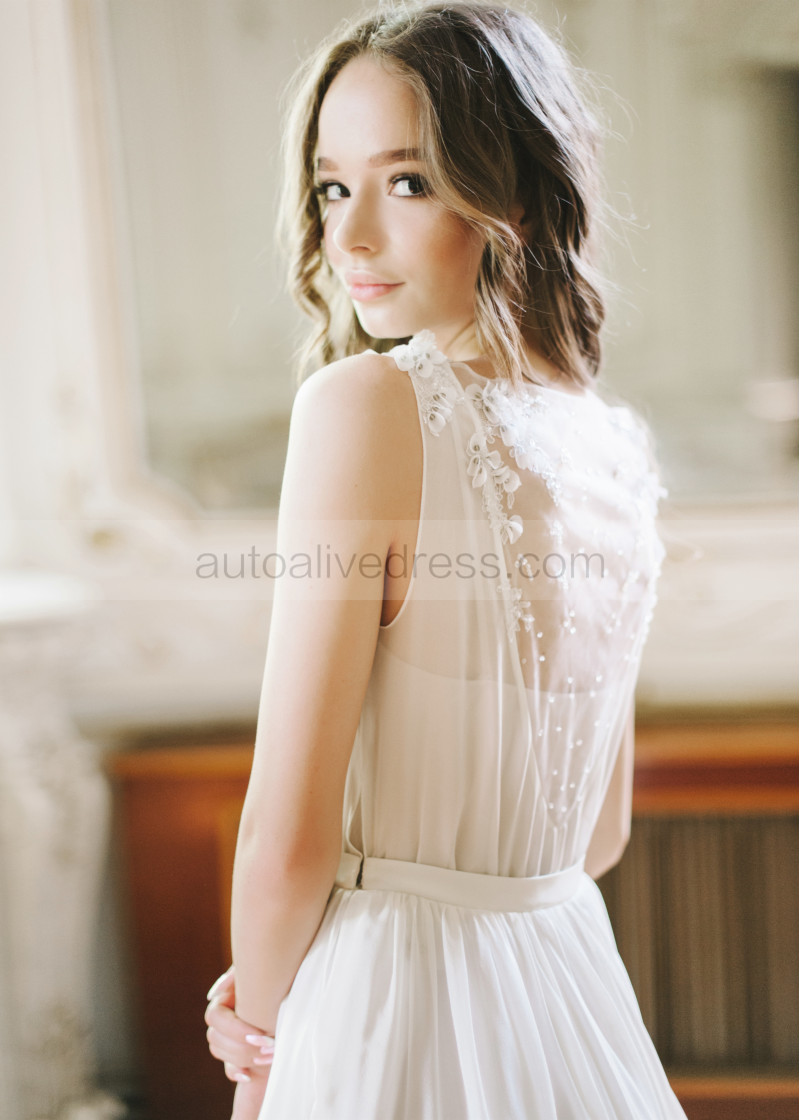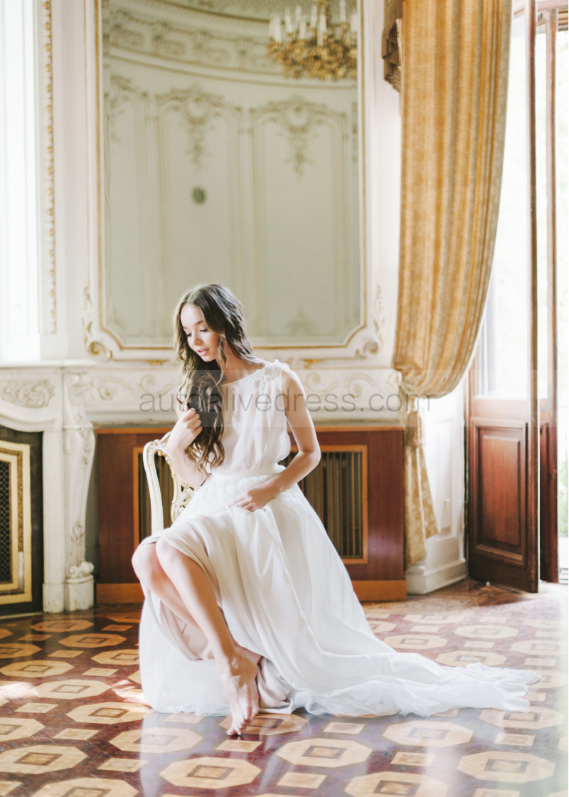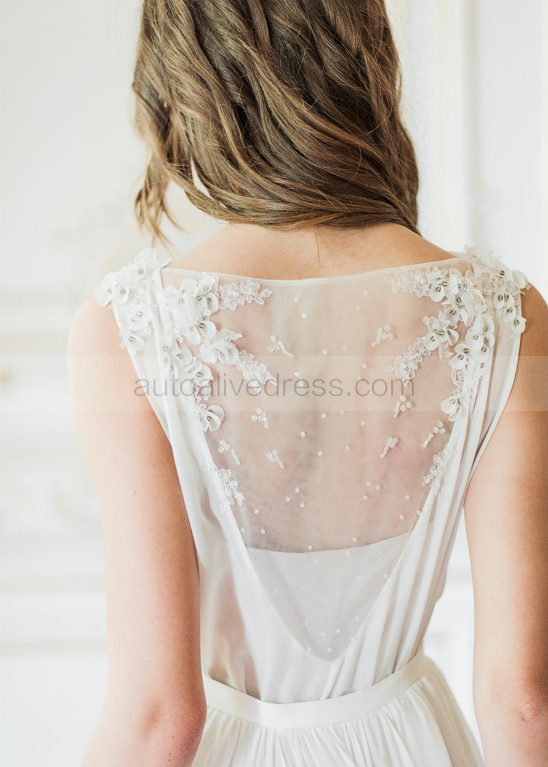Boat Neck Beaded Ivory Lace Chiffon Wedding Dress