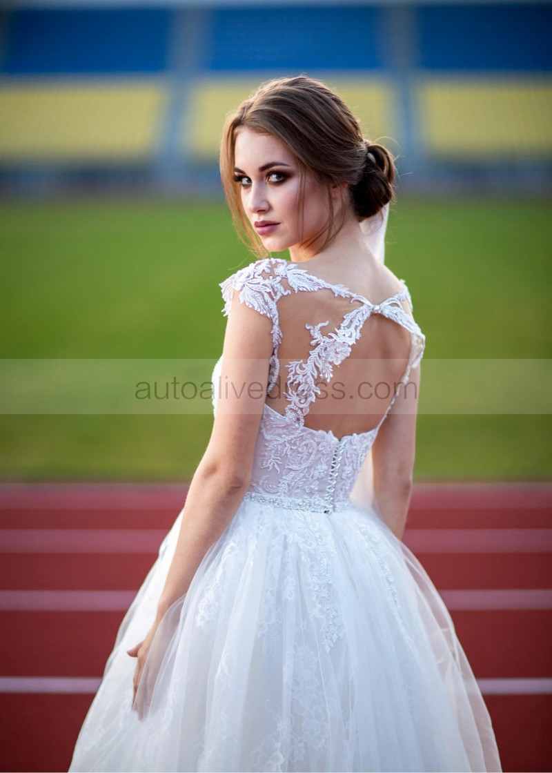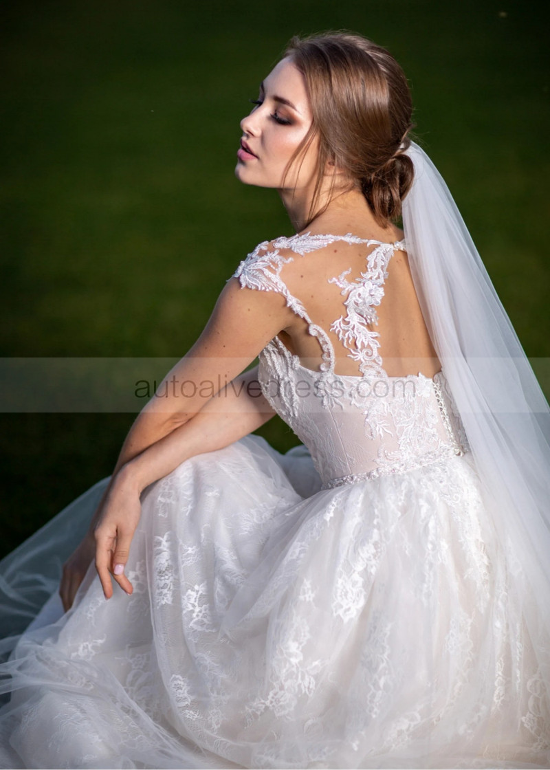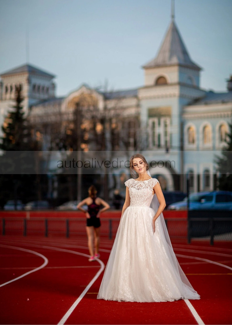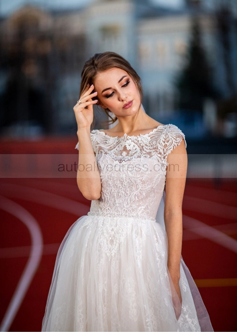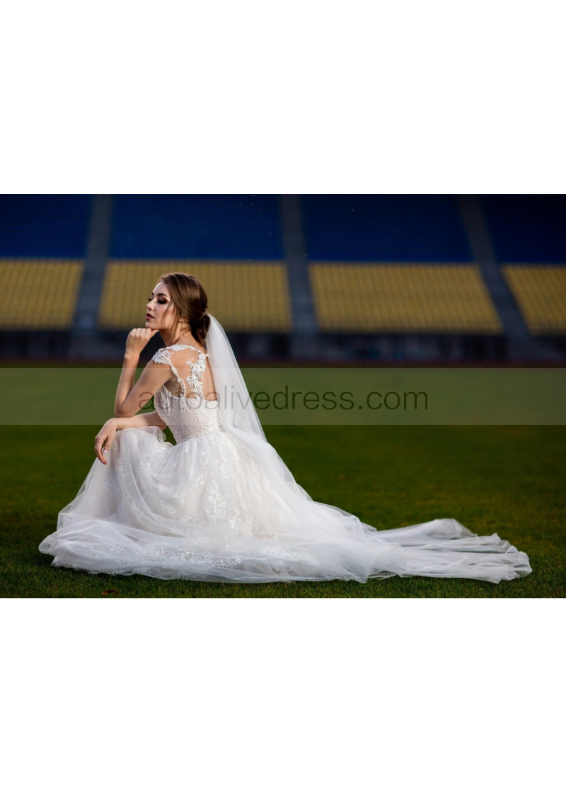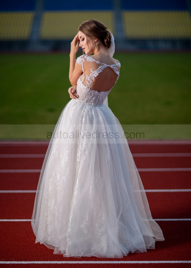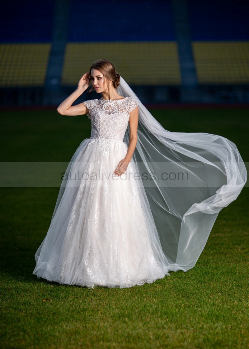 Boat Neck Ivory Lace Tulle Keyhole Back Outdoor Wedding Dress
