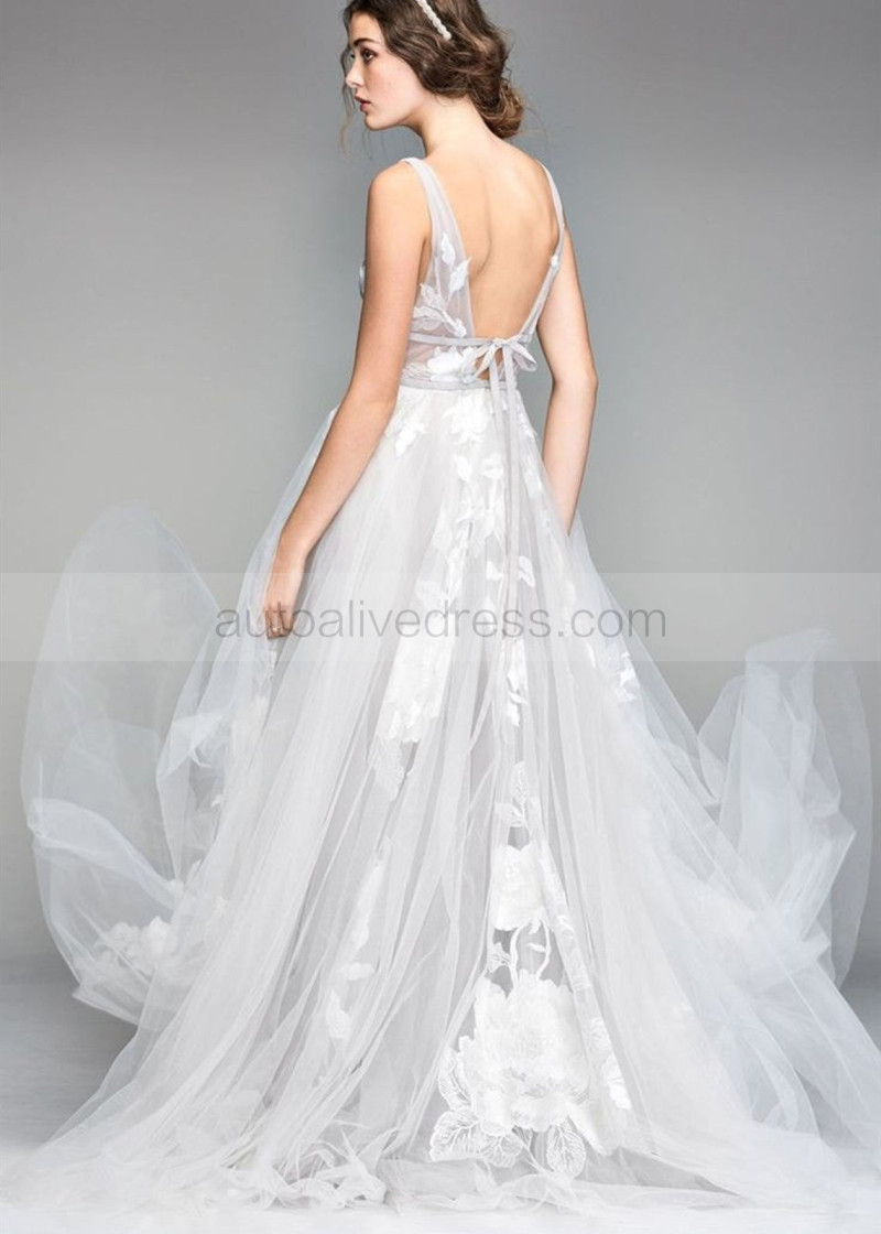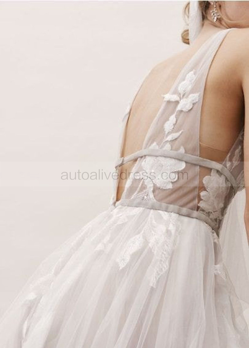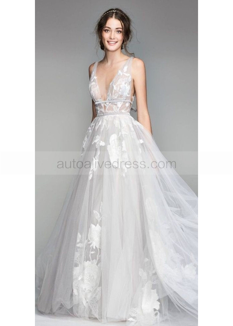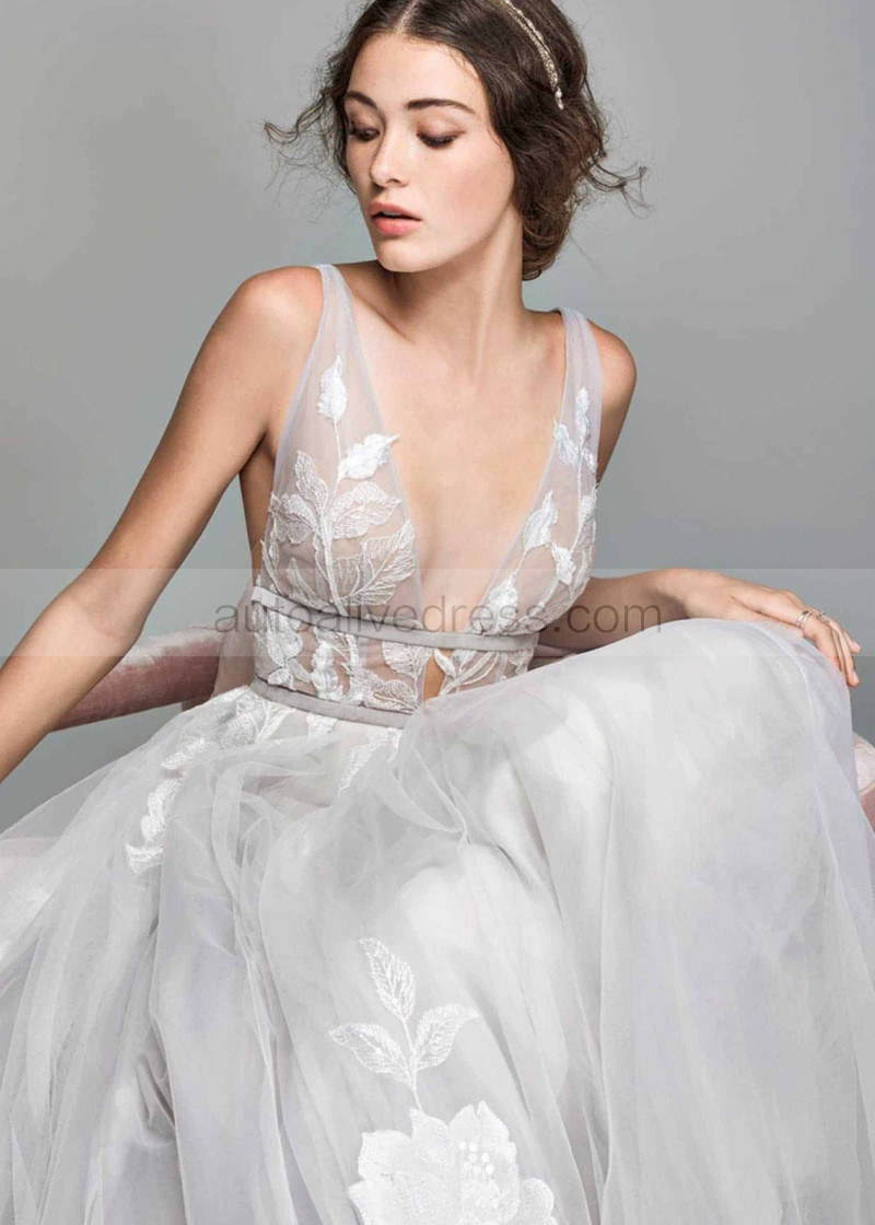 Bohemian Inspired V Neck Gray Lace Tulle Sexy Wedding Dress