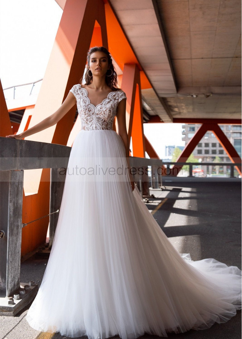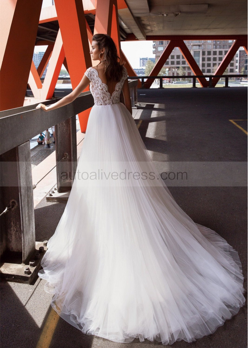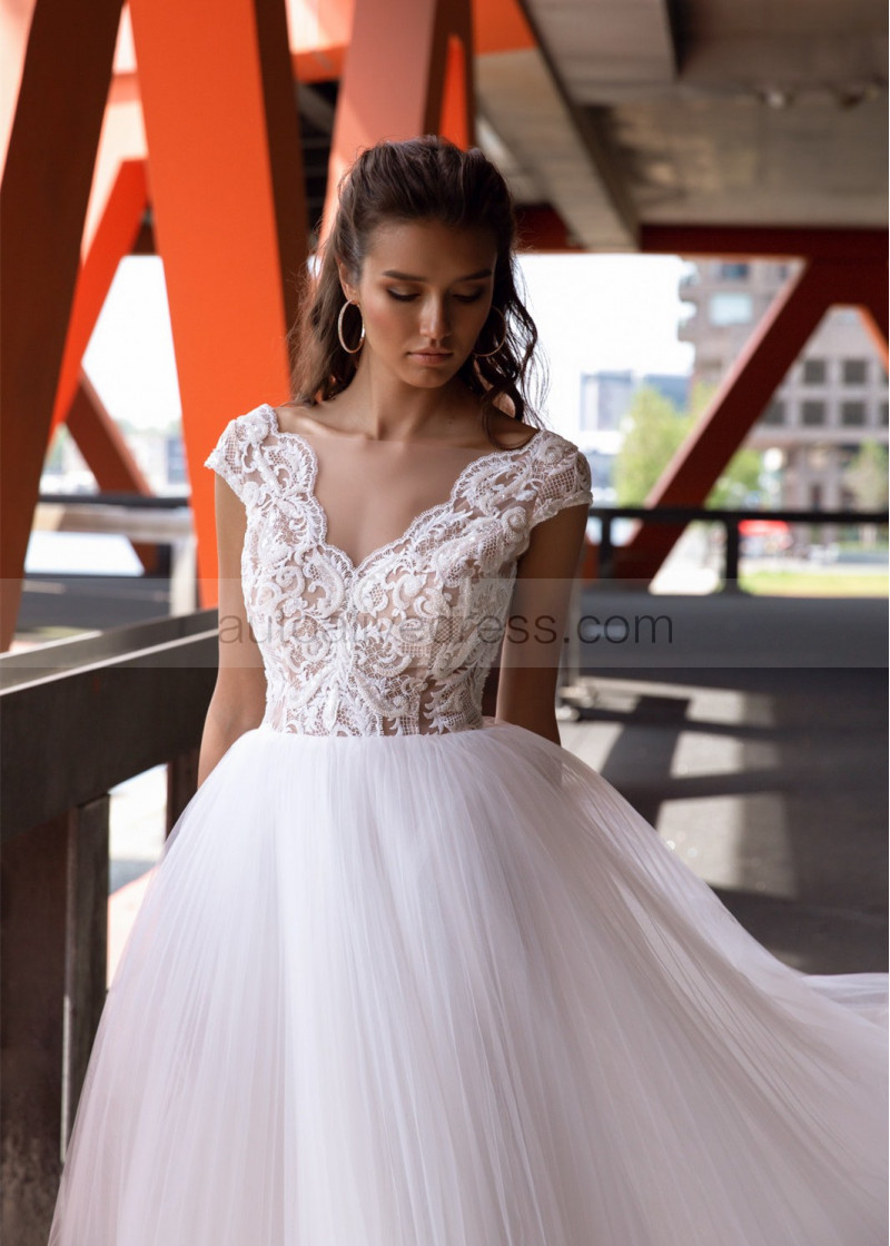 Cap Sleeve Ivory Lace Pleated Tulle Wedding Dress