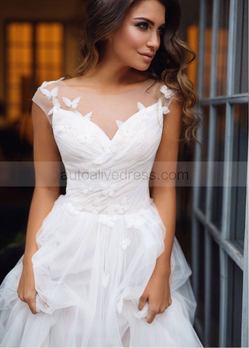 Cap Sleeve Ivory Tulle Butterfly Keyhole Back Wedding Dress
