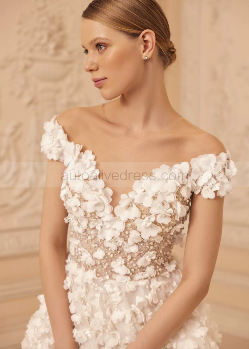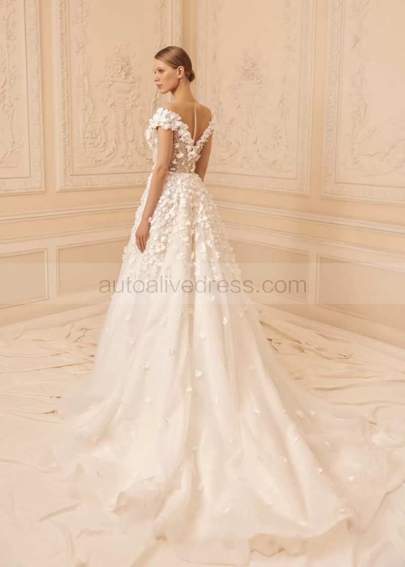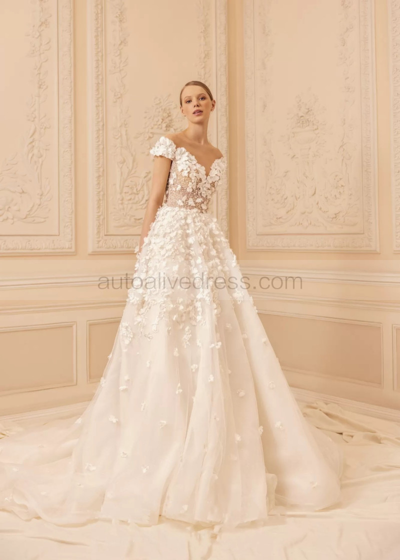 Cap Sleeves Beaded Ivory Floral Lace Tulle Wedding Dress