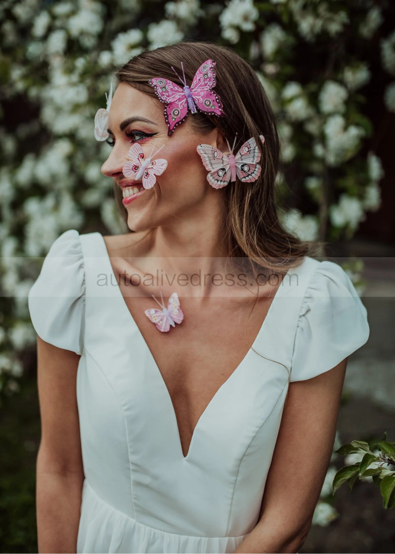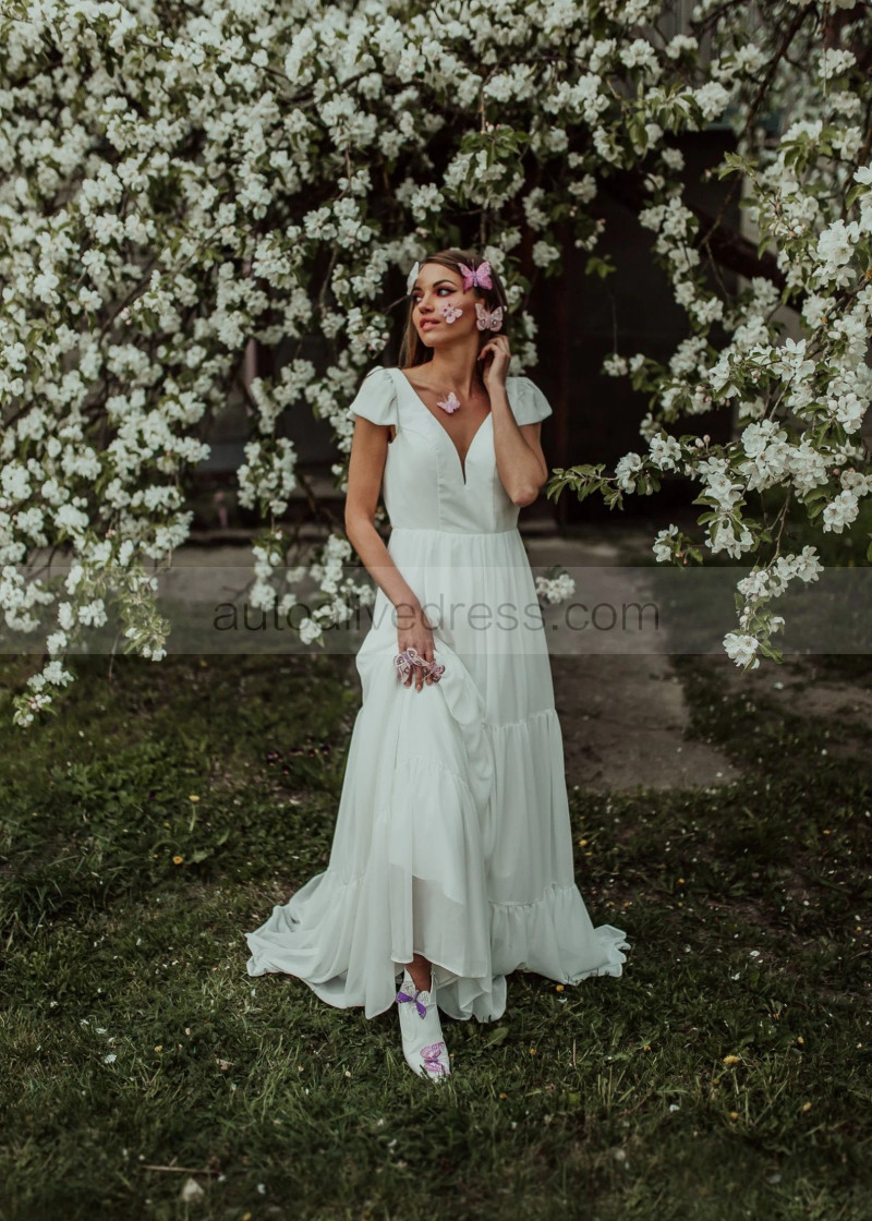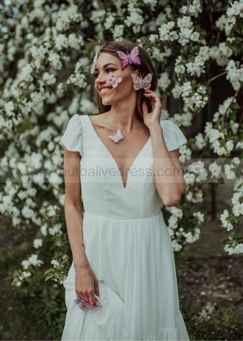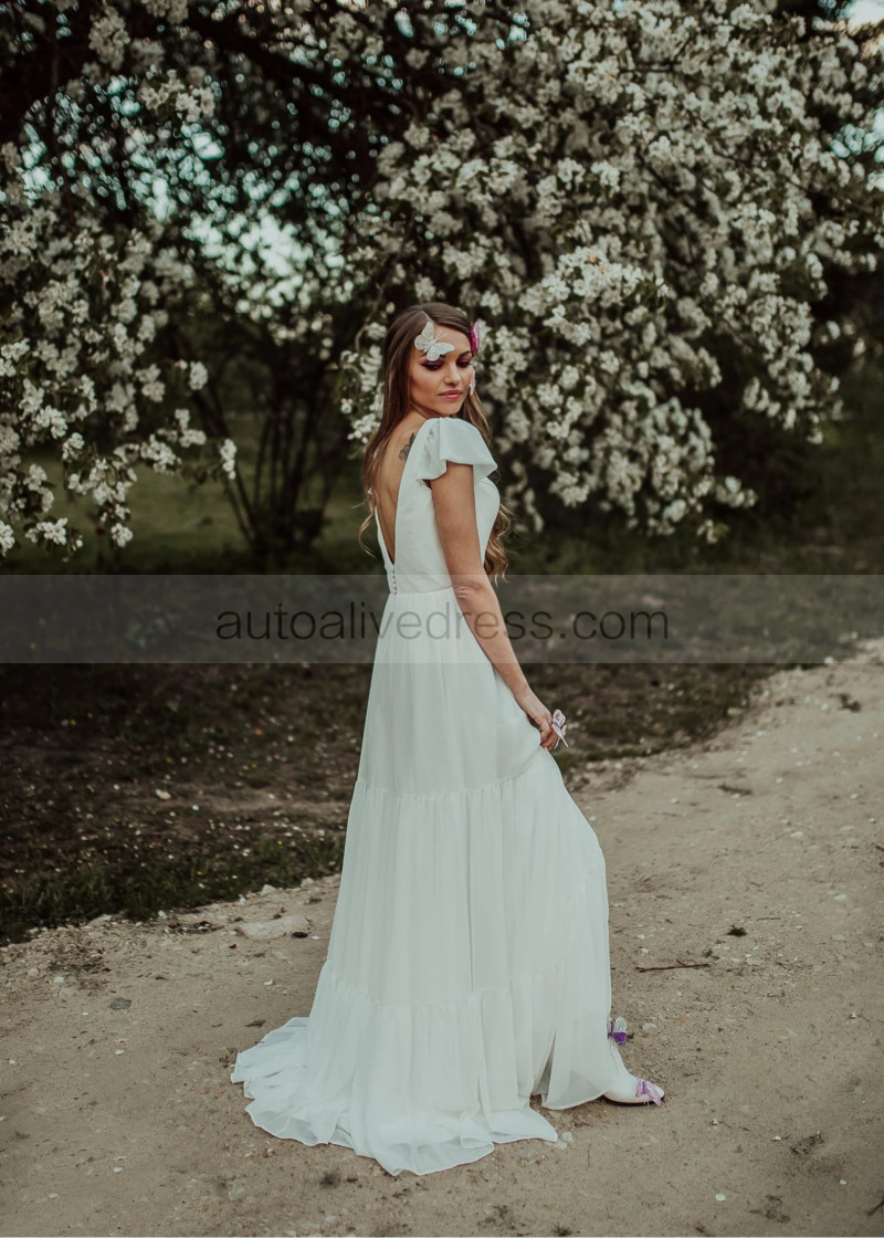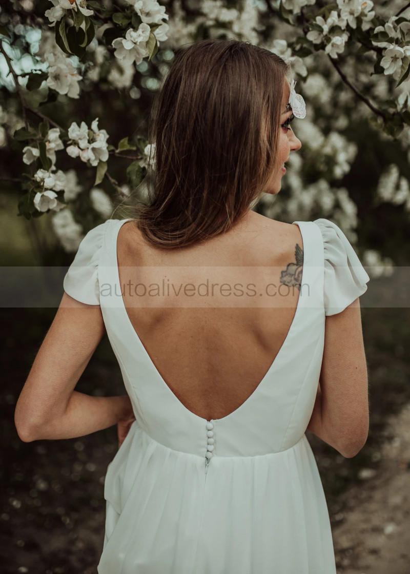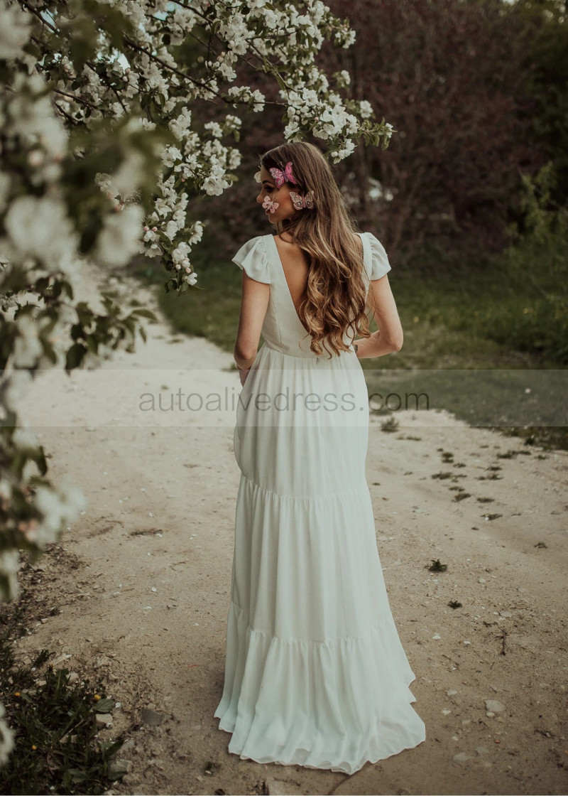 Cap Sleeves Ivory Chiffon V Back Bohemian Wedding Dress