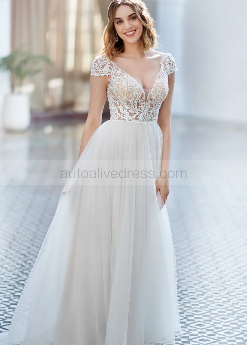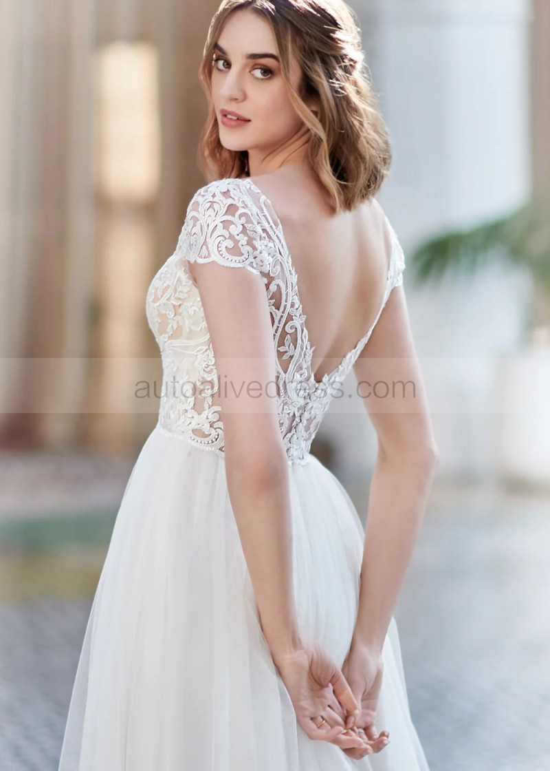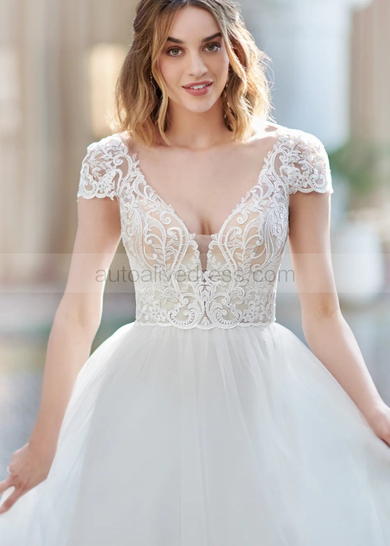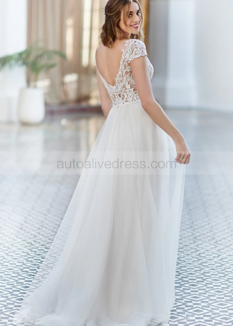 Cap Sleeves Ivory Embroidered Lace Tulle Modern Wedding Dress