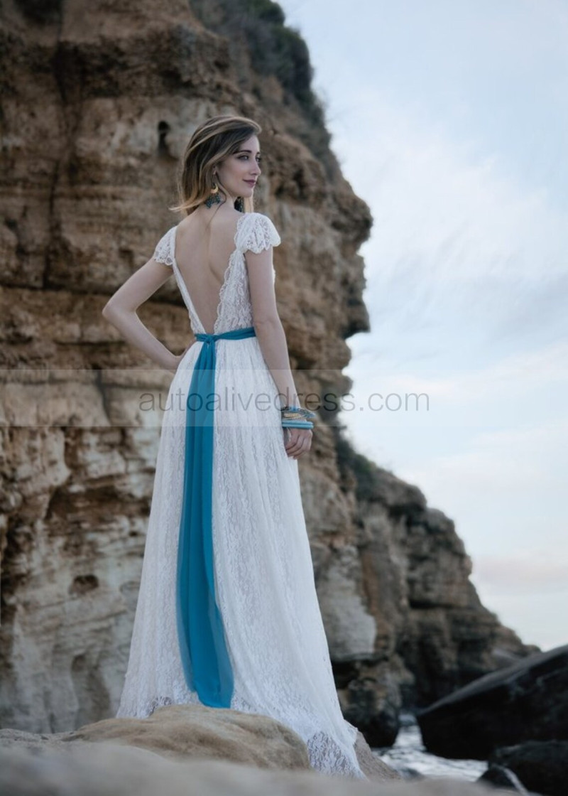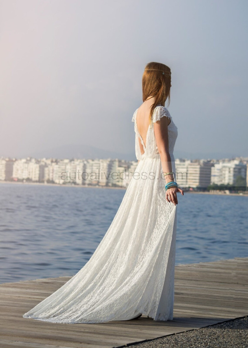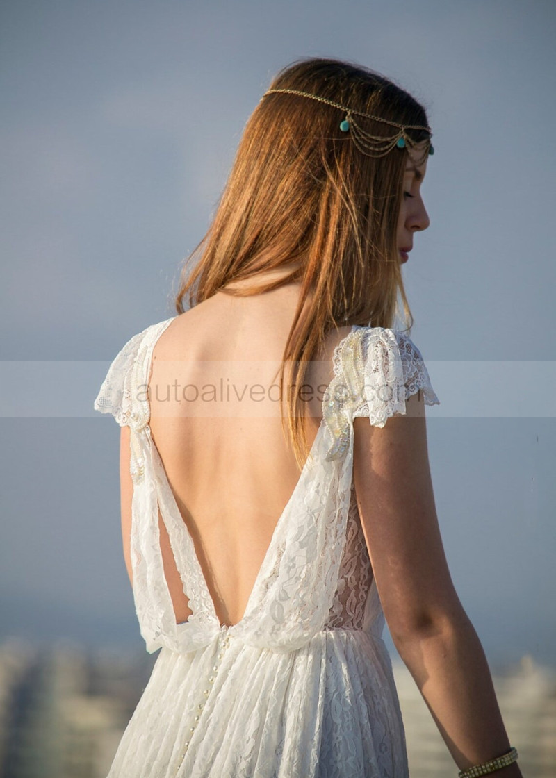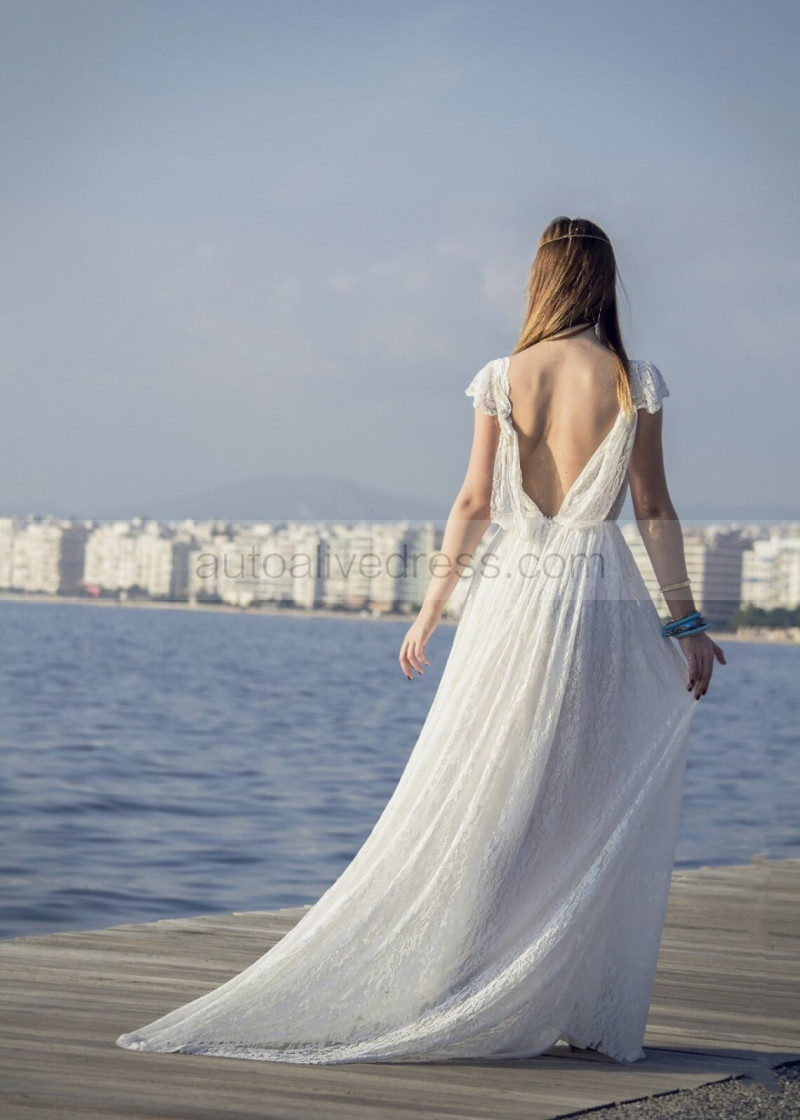 Cap Sleeves Ivory Lace Backless Stunning Wedding Dress