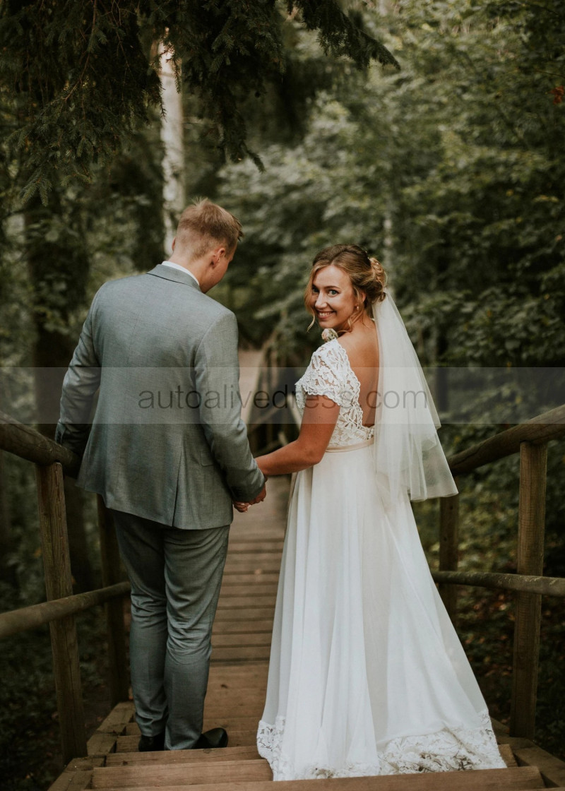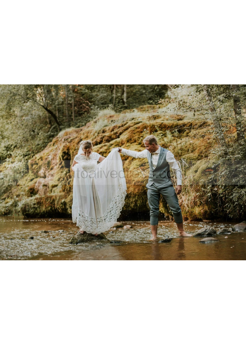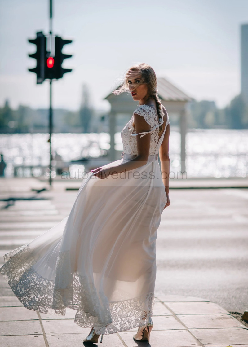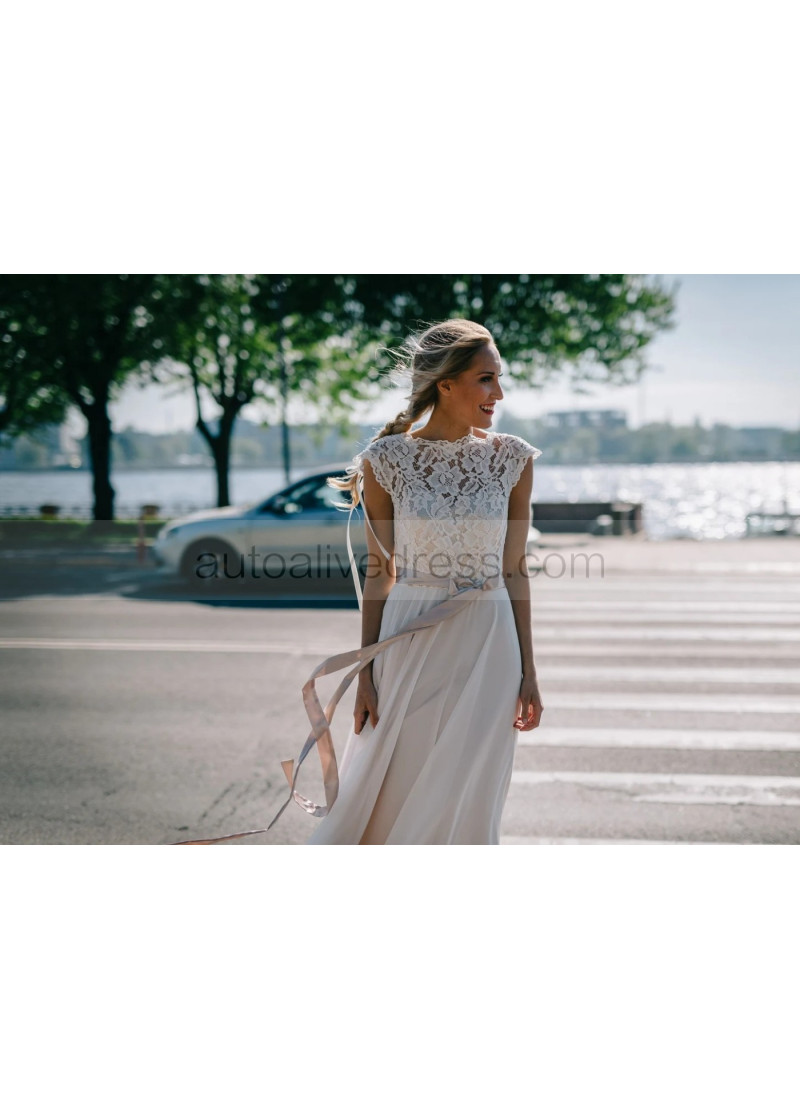 Cap Sleeves Ivory Lace Chiffon Blush Lining Airy Wedding Dress