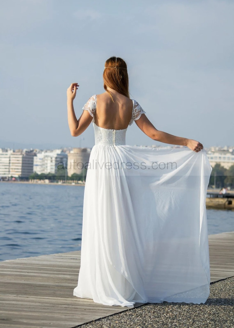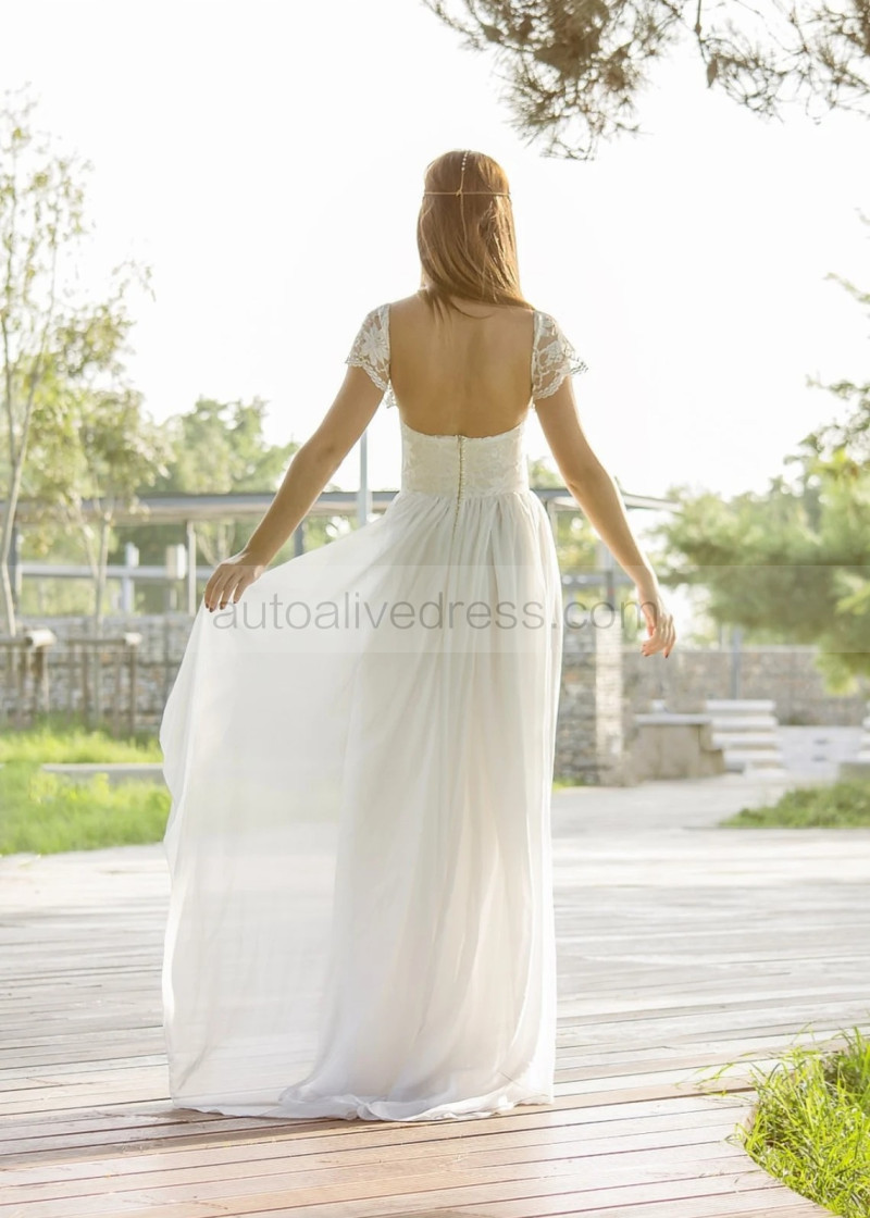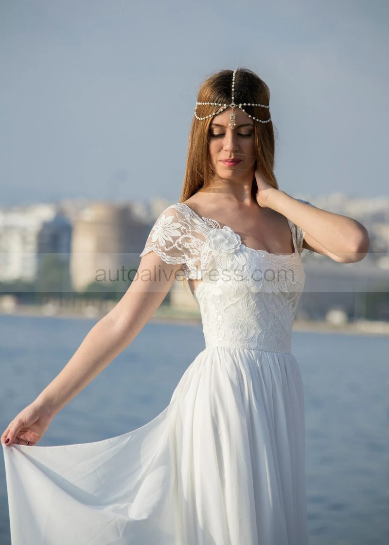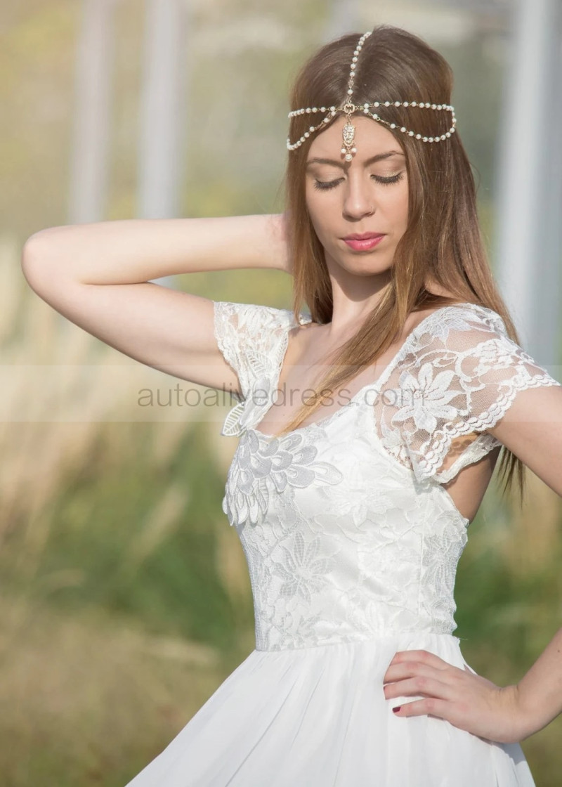 Cap Sleeves Ivory Lace Chiffon Modern Boho Wedding Dress