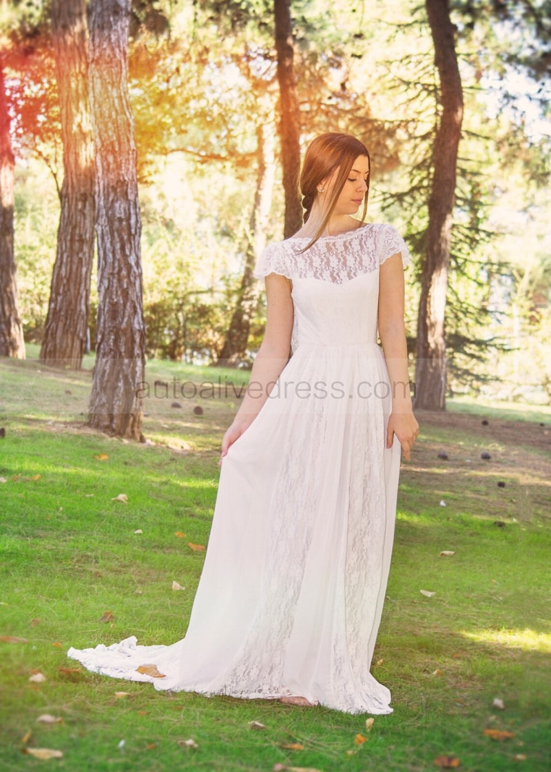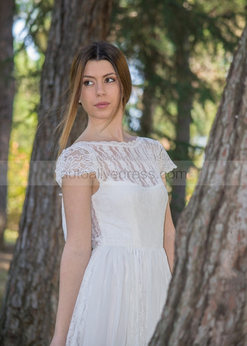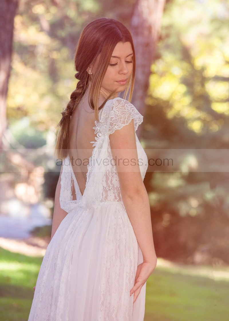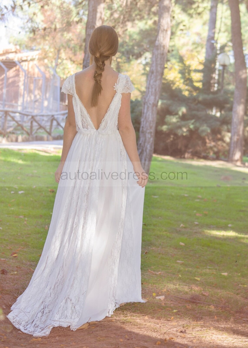 Cap Sleeves Ivory Lace Chiffon Vintage Outdoor Wedding Dress