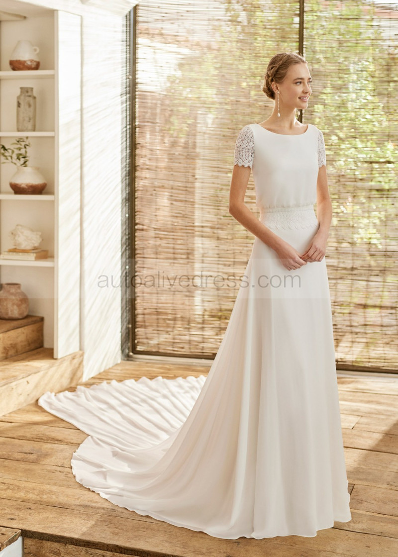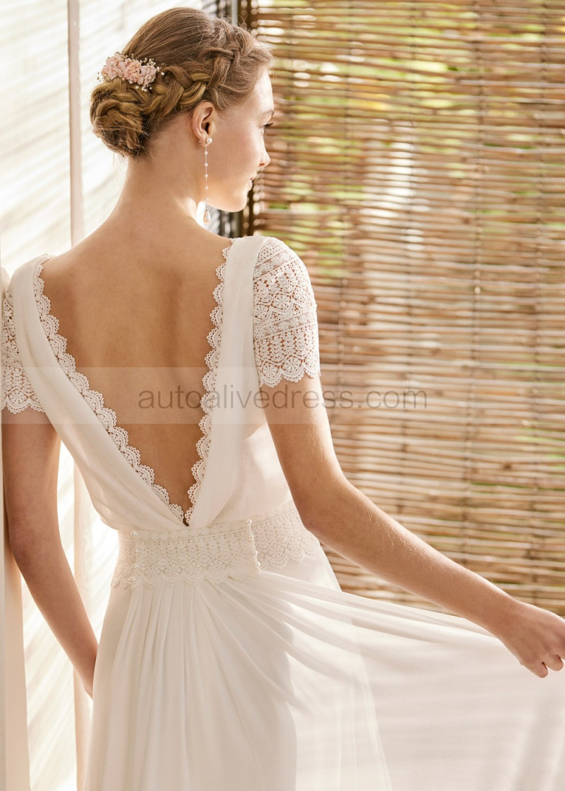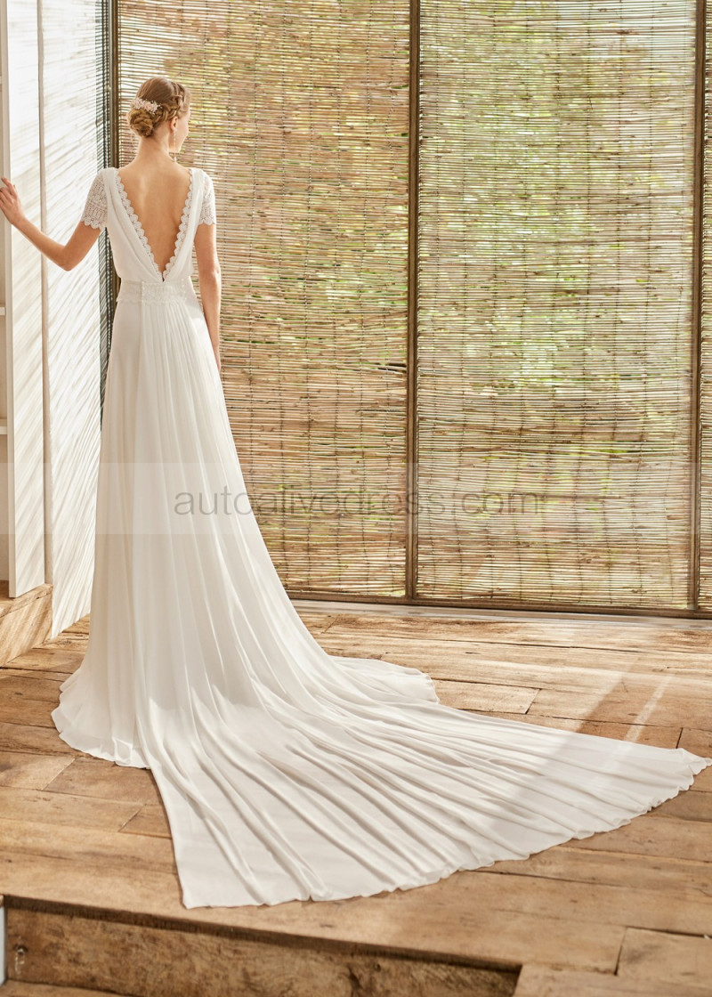 Cap Sleeves Ivory Lace Chiffon Wedding Dress With Detachable Train