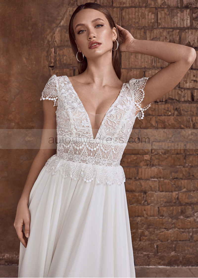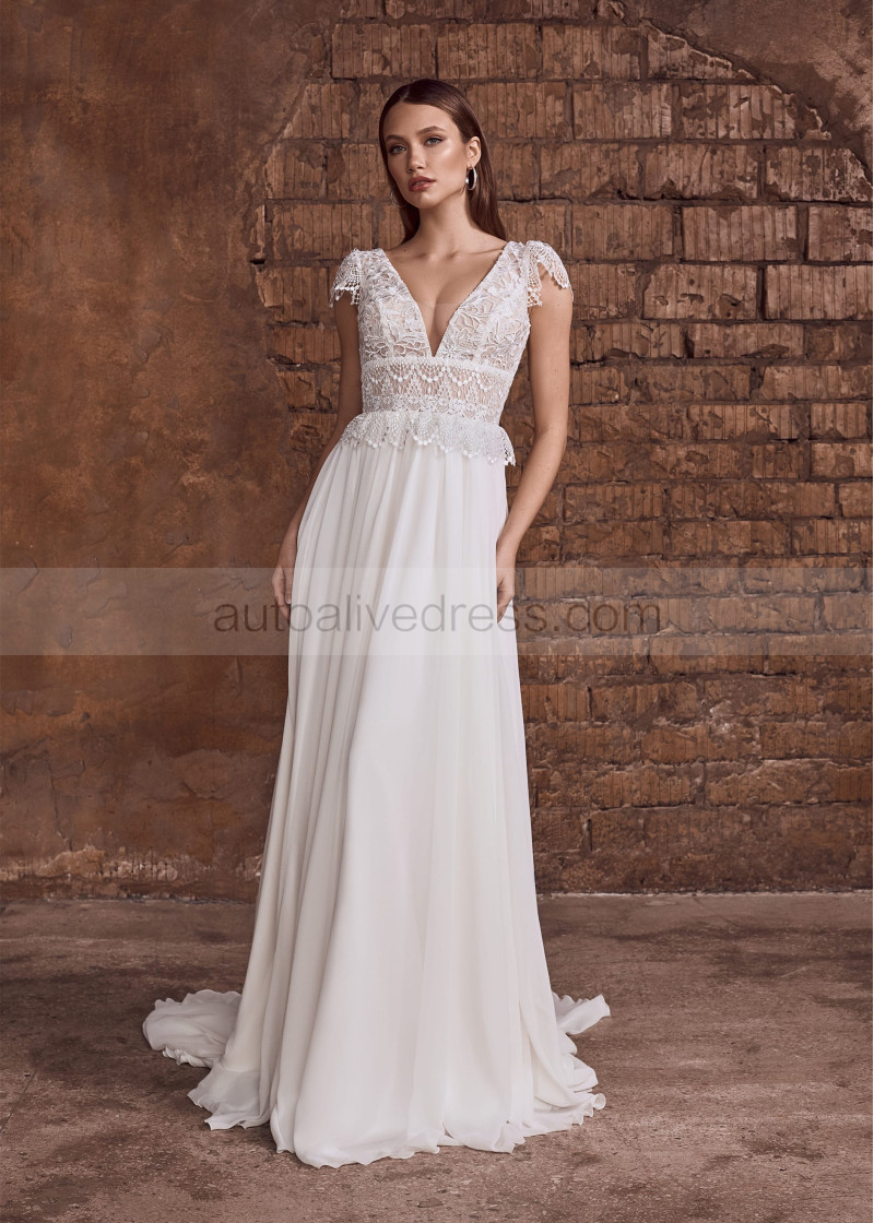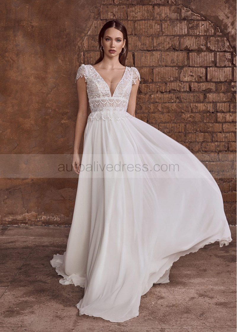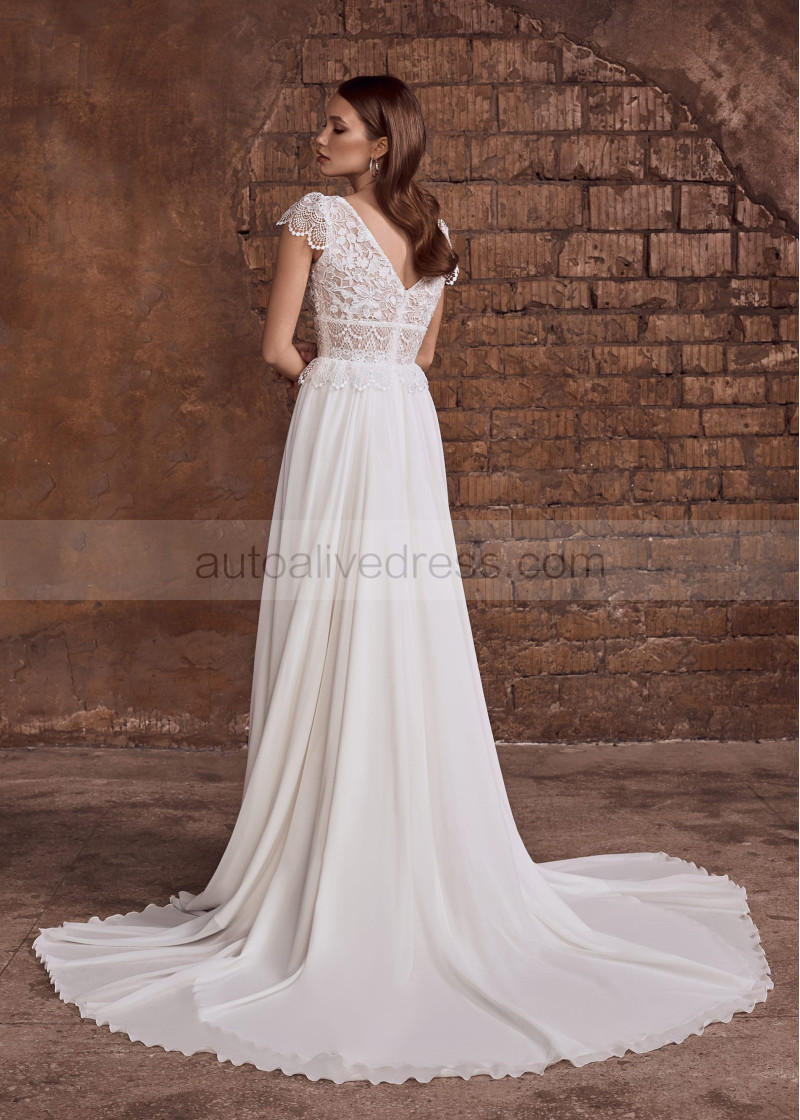 Cap Sleeves Ivory Lace Chiffon Wedding Dress