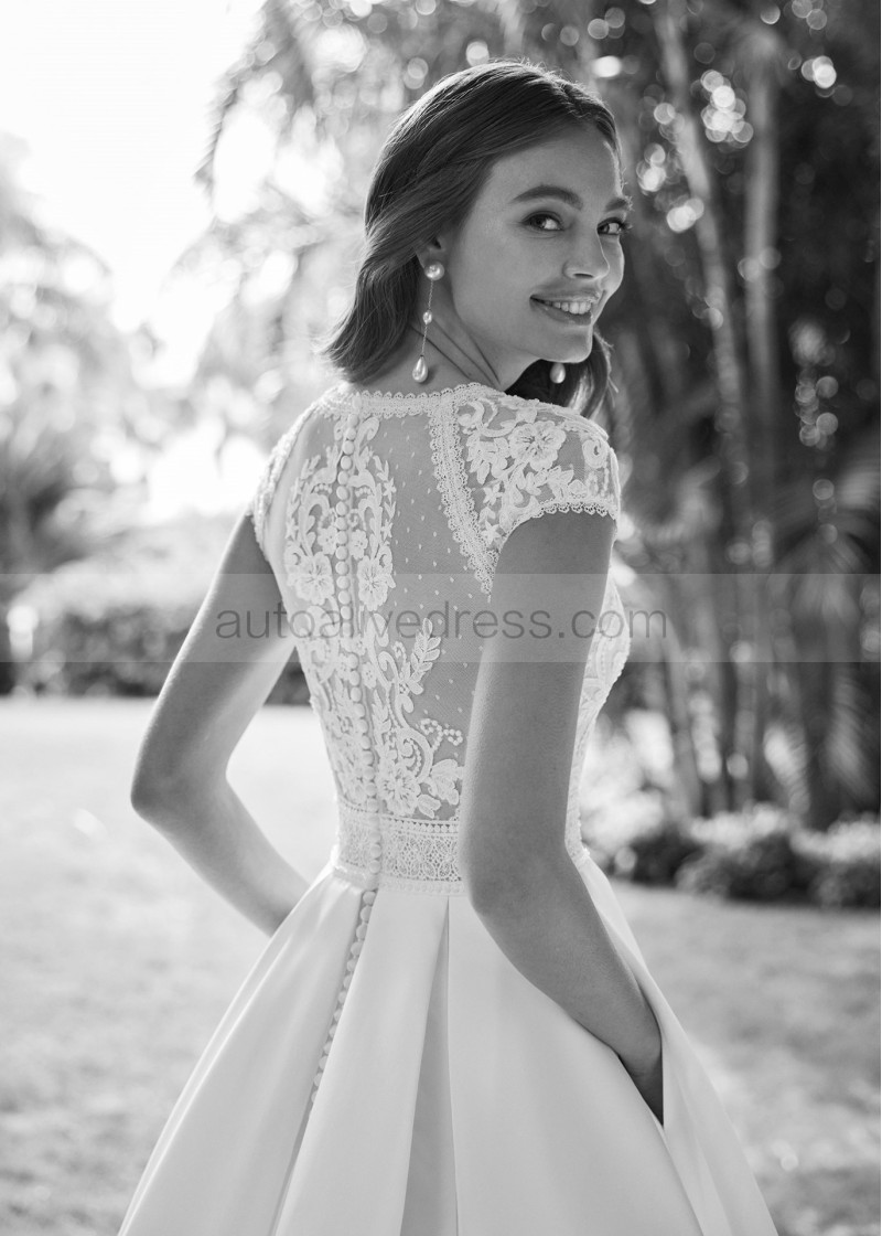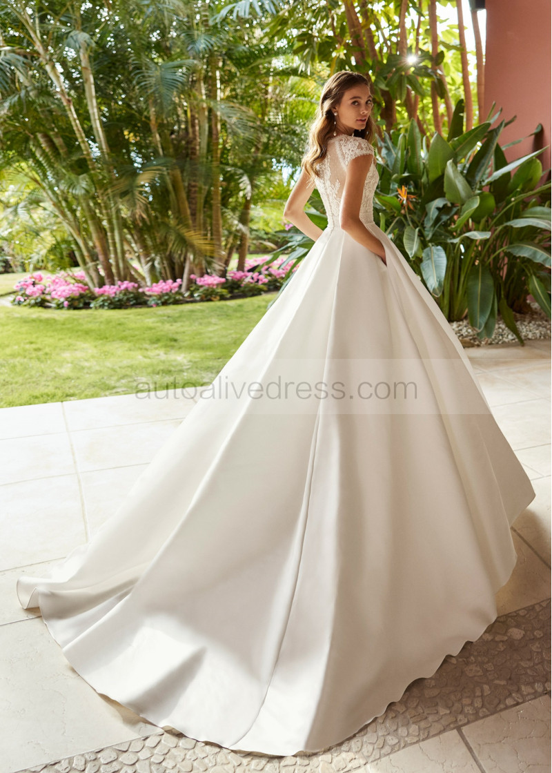 Cap Sleeves Ivory Lace Satin Royal Wedding Dress With Pockets