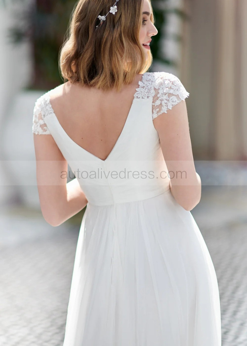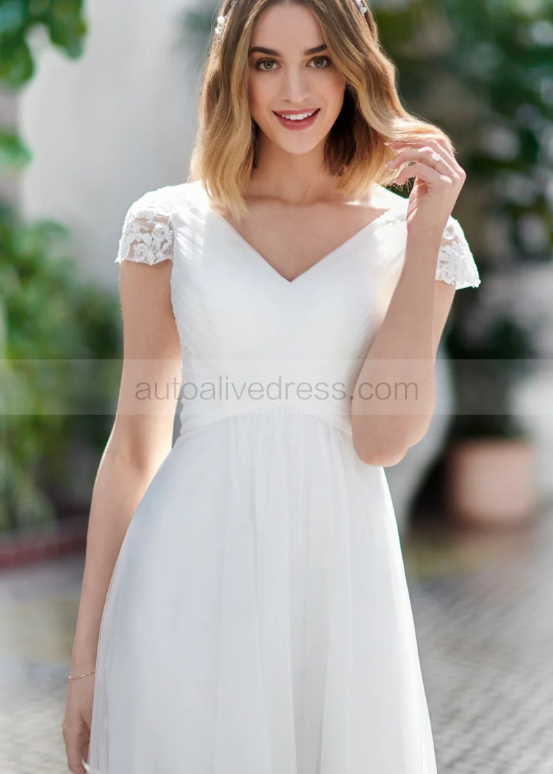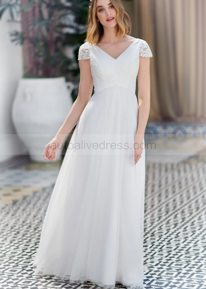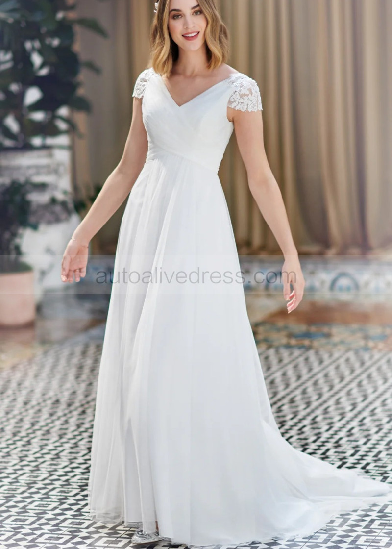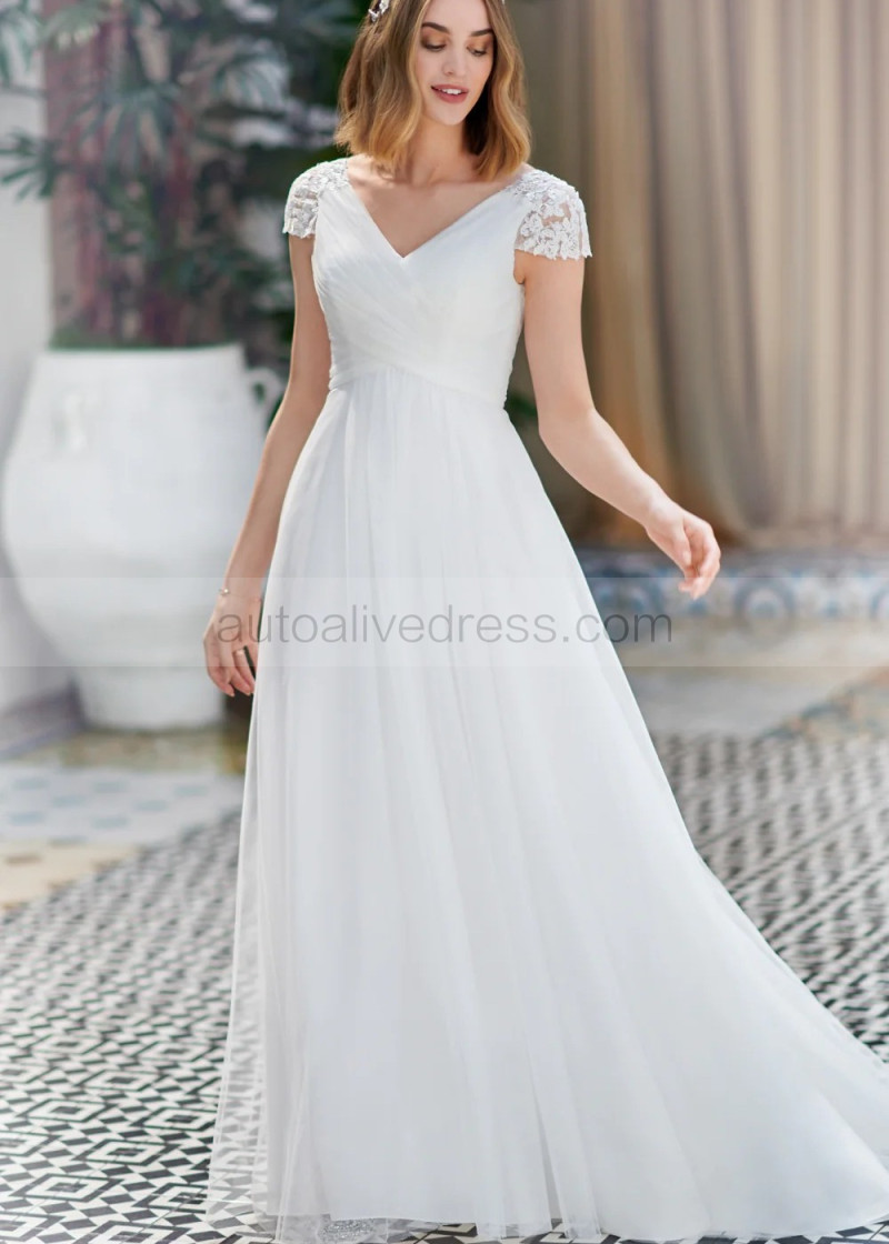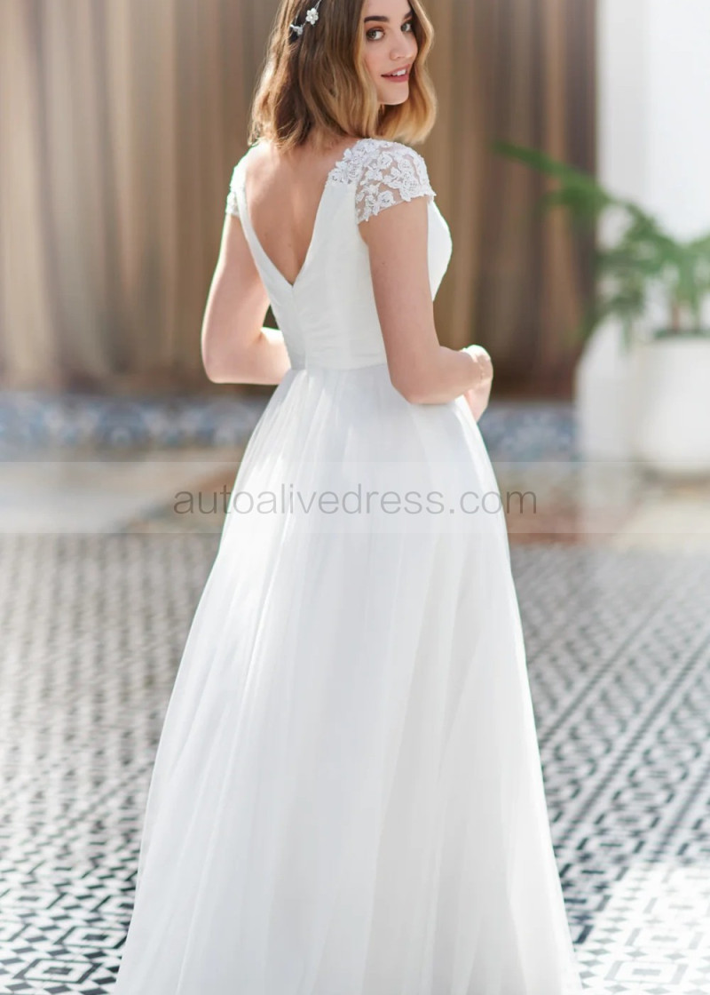 Cap Sleeves Ivory Lace Tulle Chic Wedding Dress