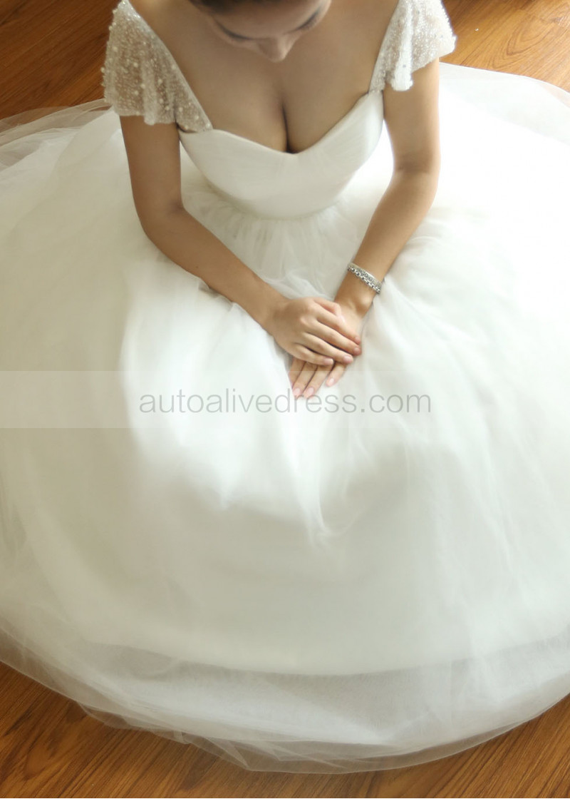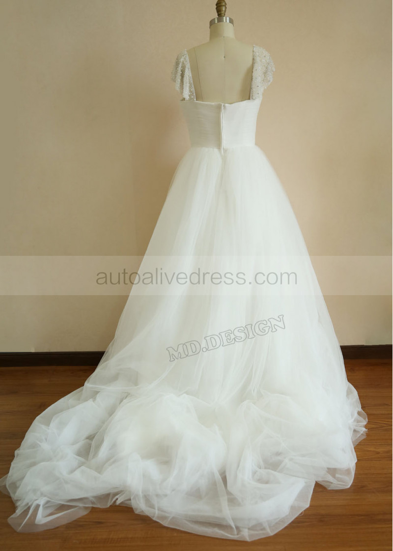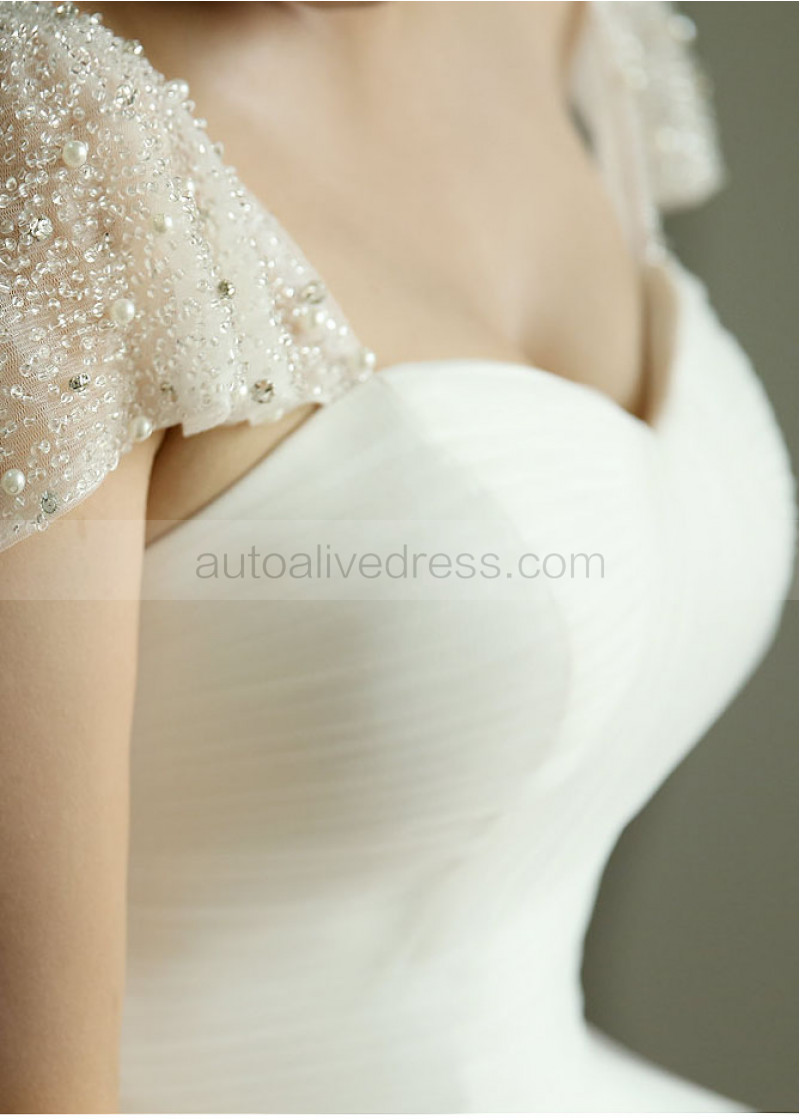 Cap Sleeves Ivory Tulle Pleated Shimmering Wedding Dress