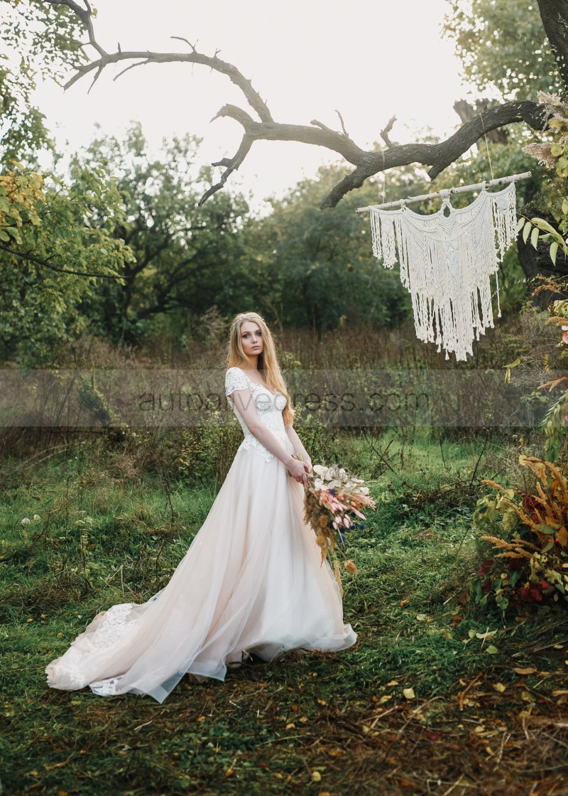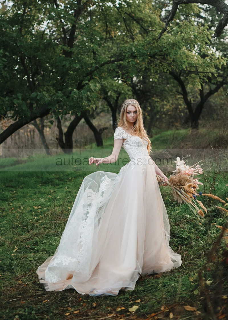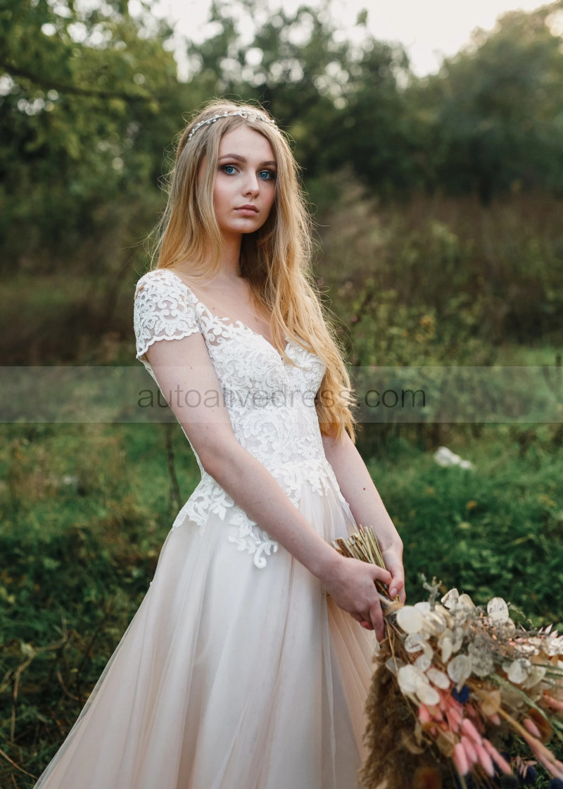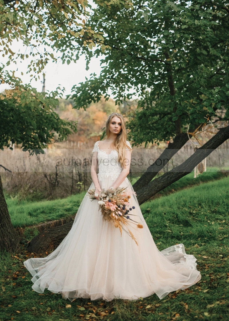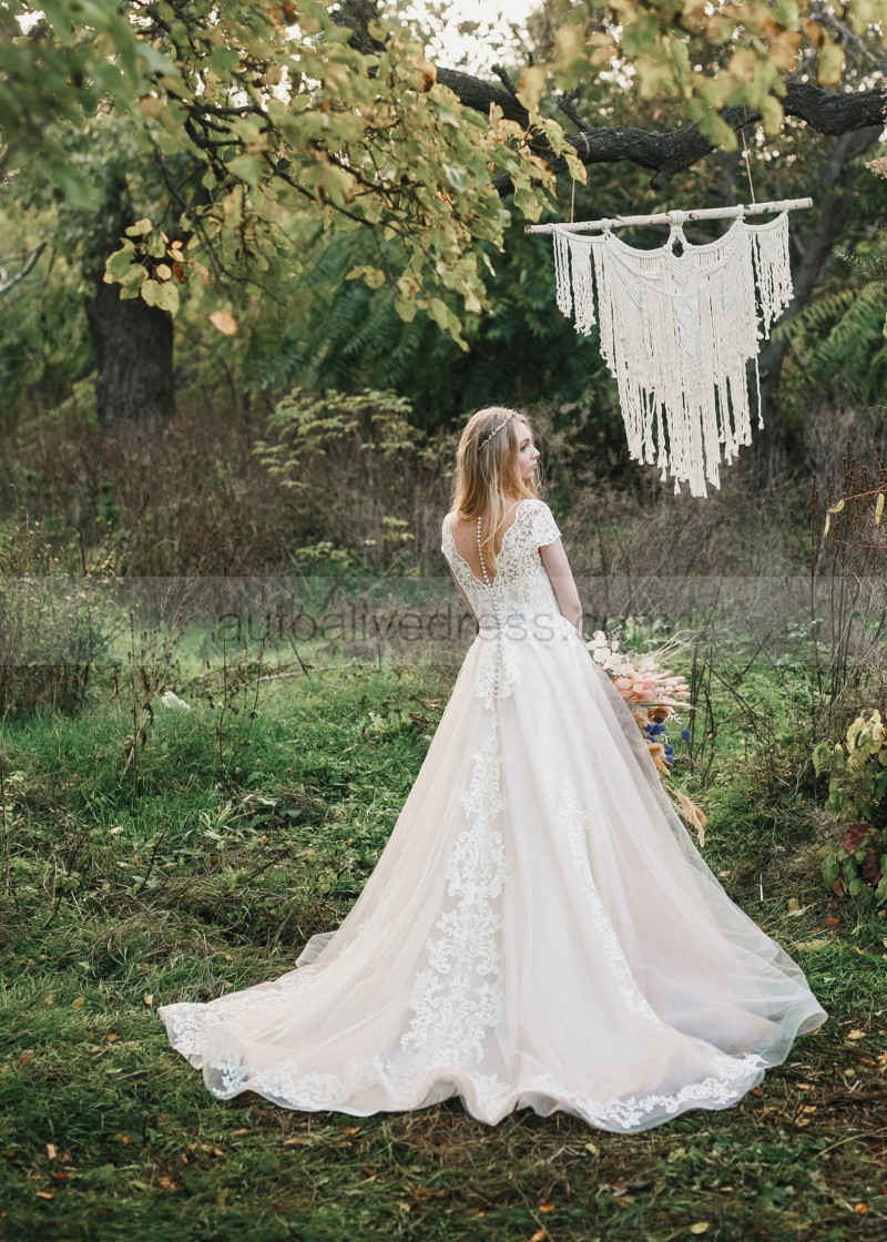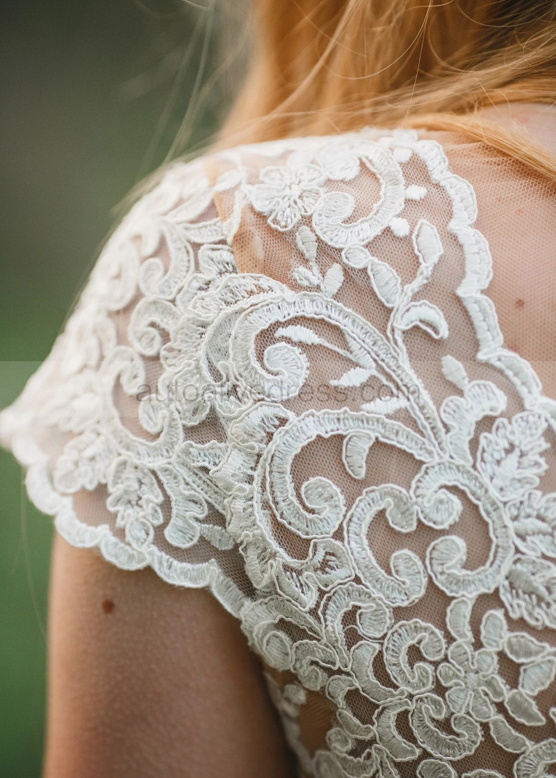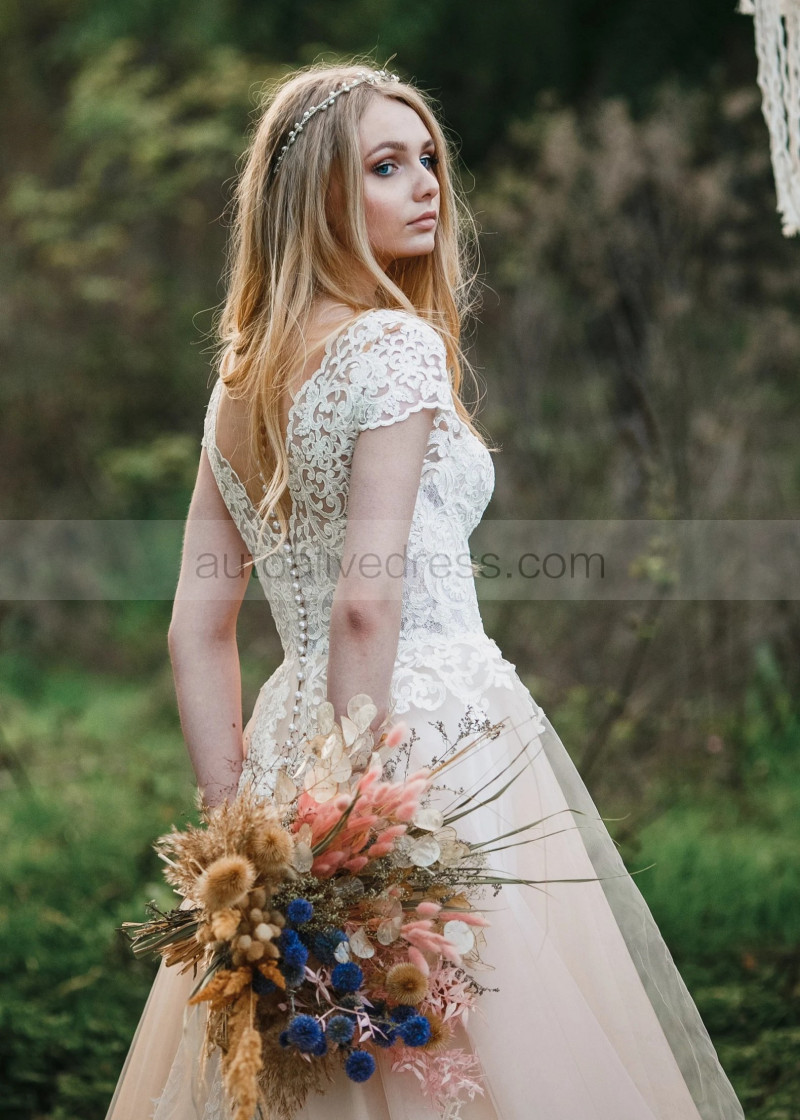 Cap Sleeves Lace Tulle Pearl Buttons Back Chic Wedding Dress