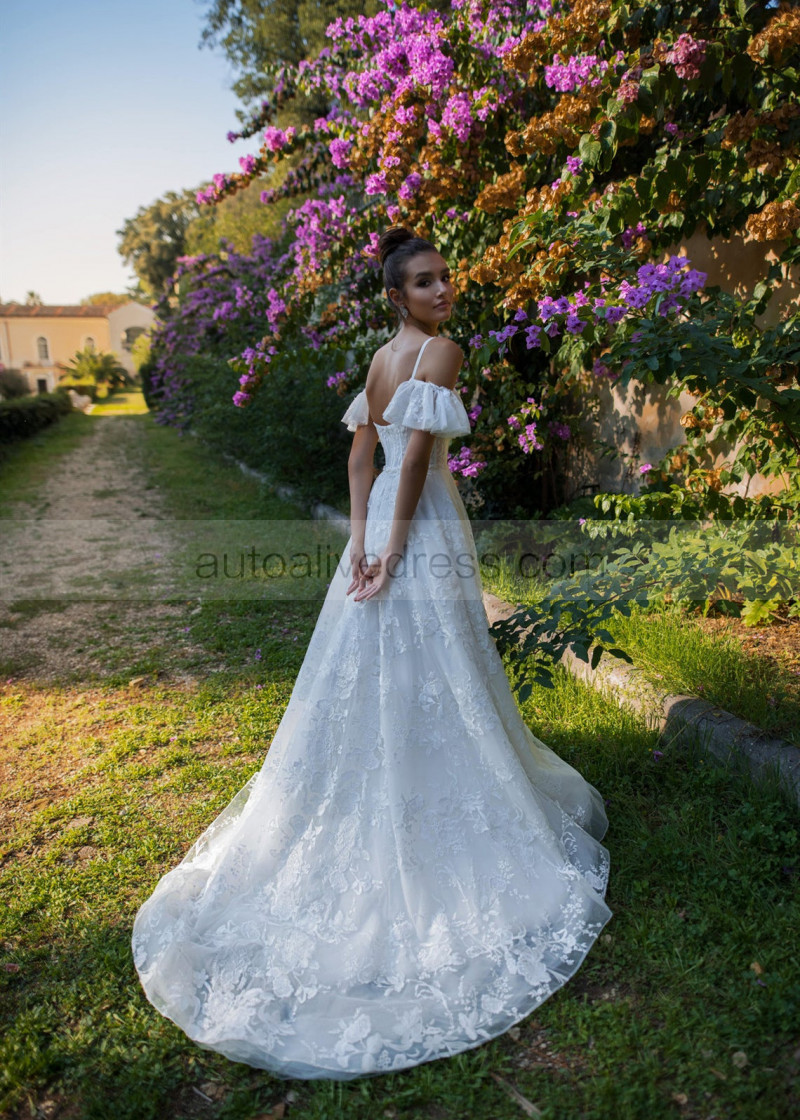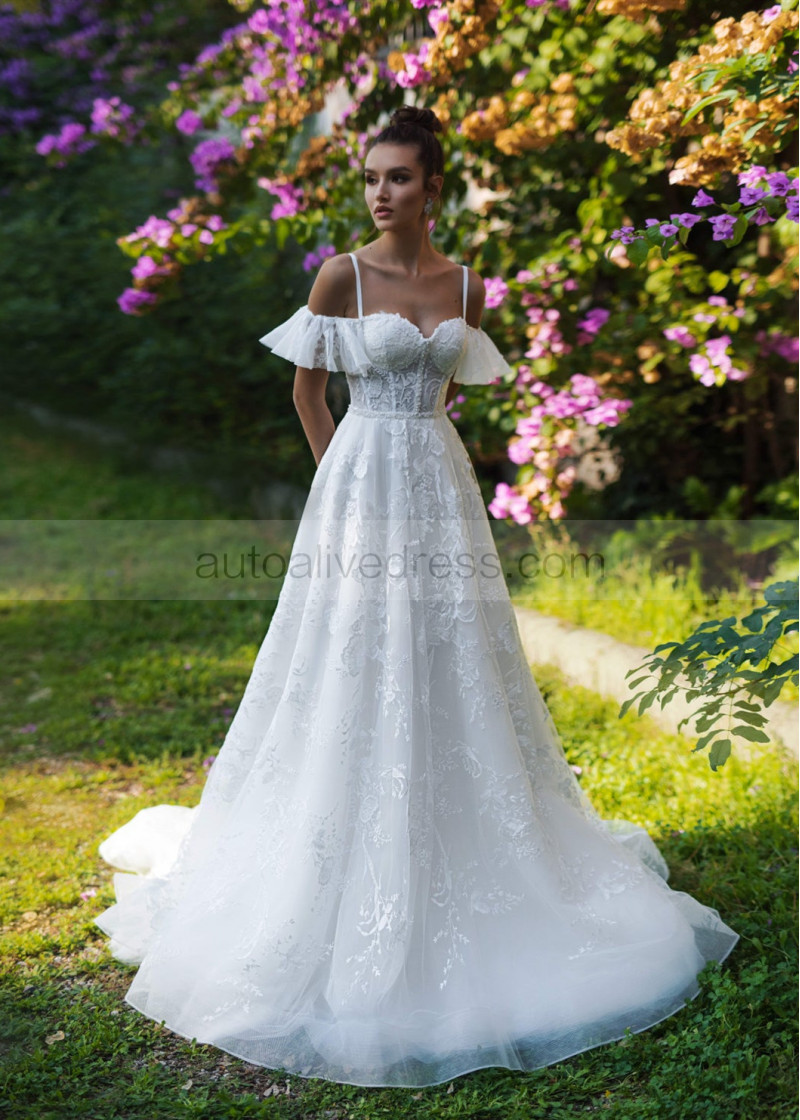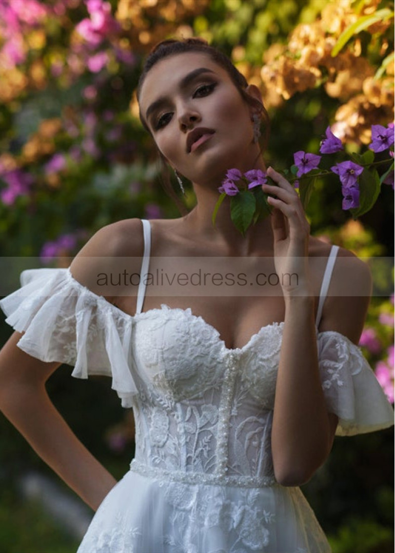 Cold Shoulder Beaded White Lace Tulle Rustic Wedding Dress