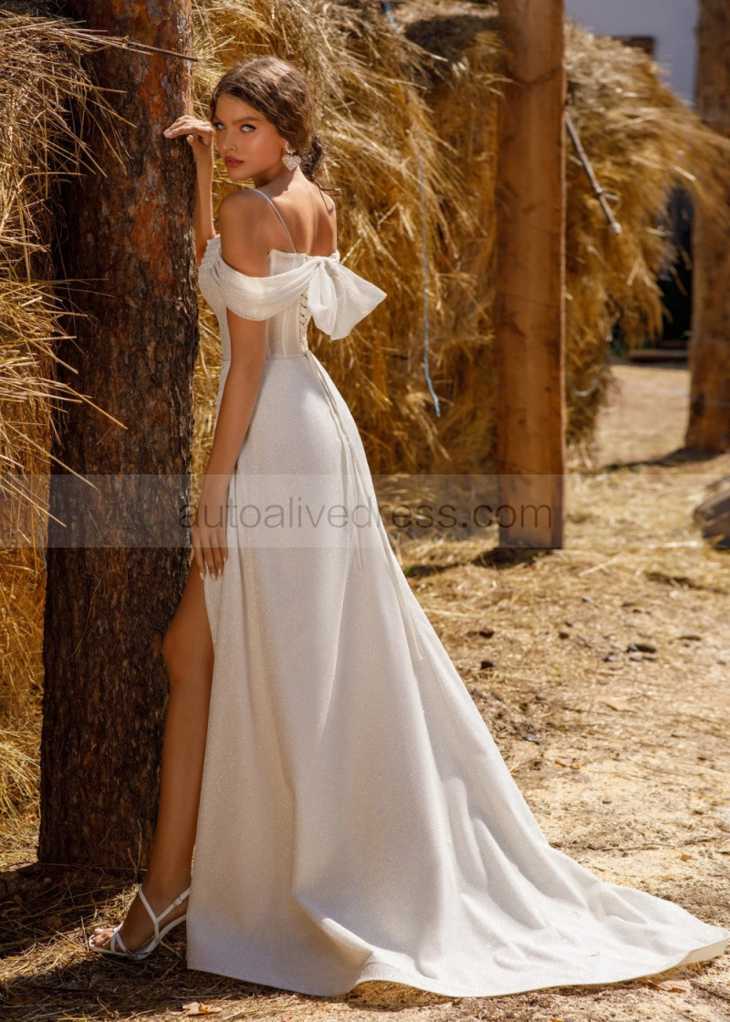 Cold Shoulder Ivory Glitter Tulle High Slit Wedding Dress