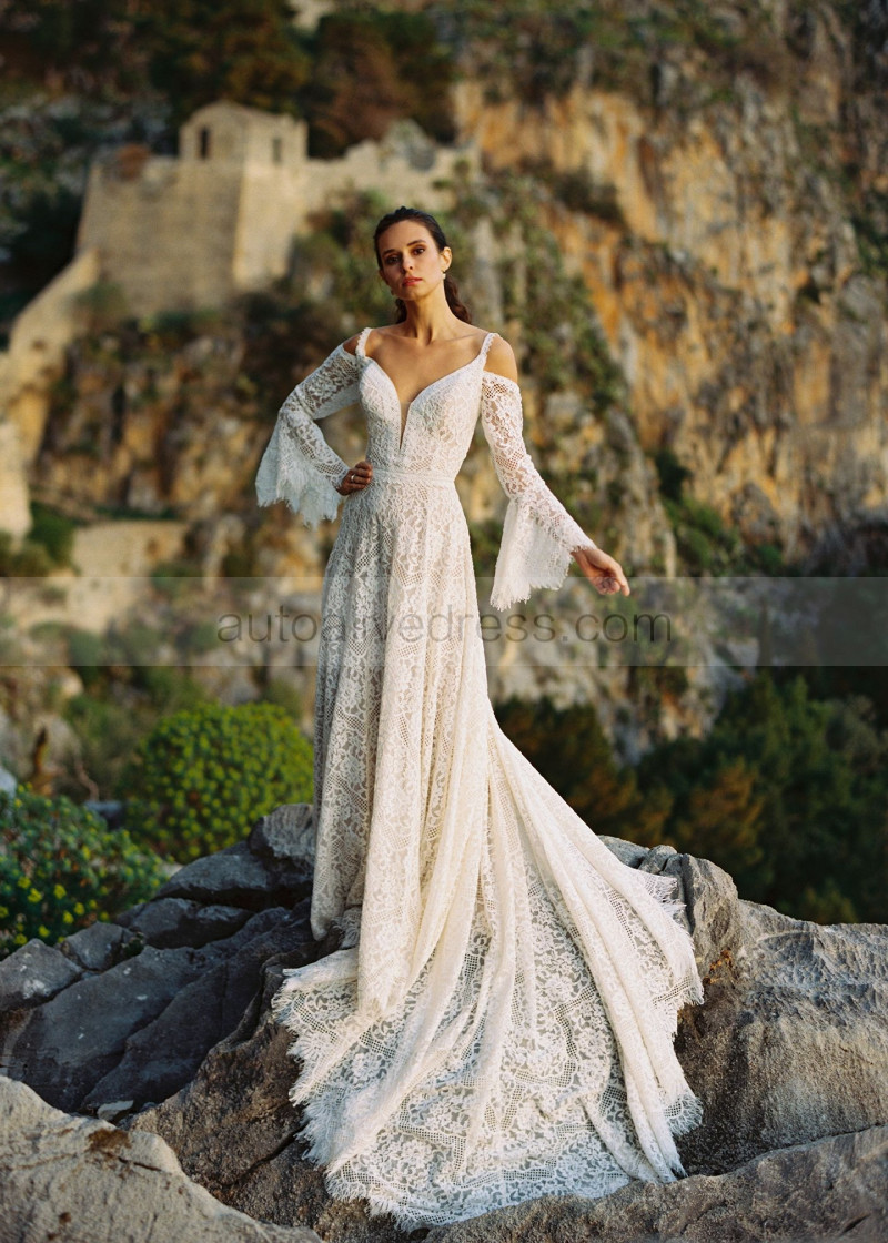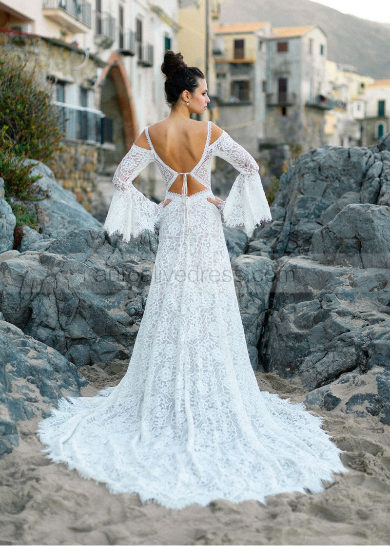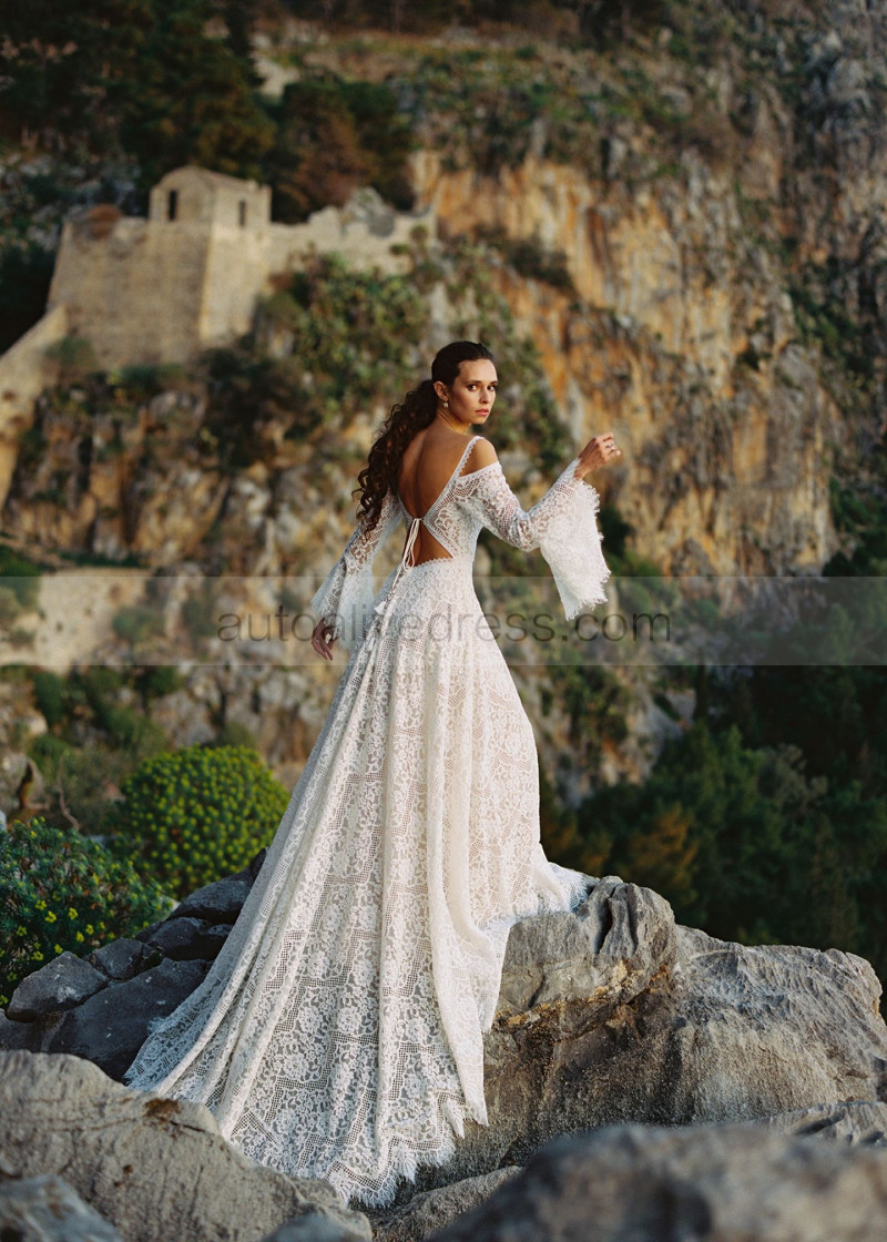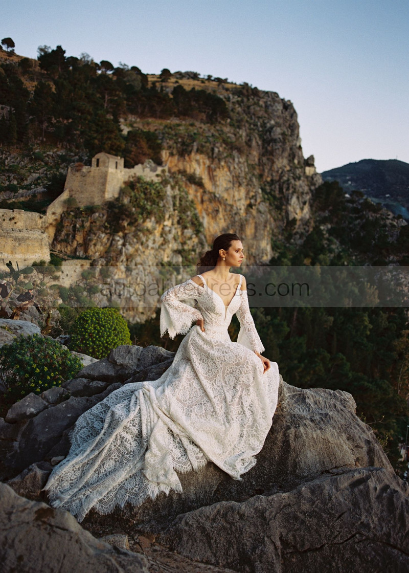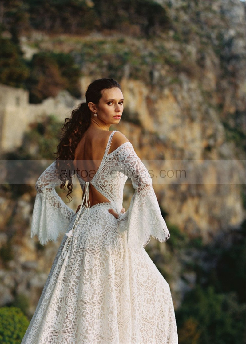 Cold Shoulder Ivory Lace Tie Back Wedding Dress