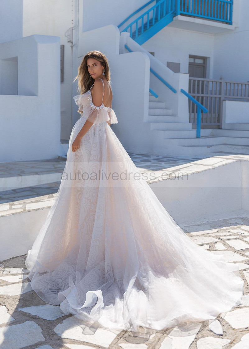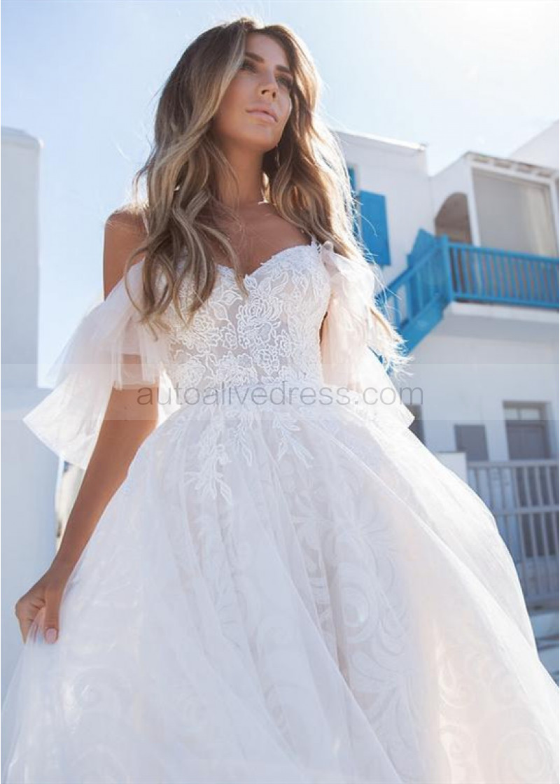 Cold Shoulder Ivory Lace Tulle Boho Wedding Dress