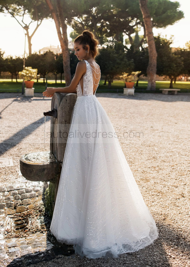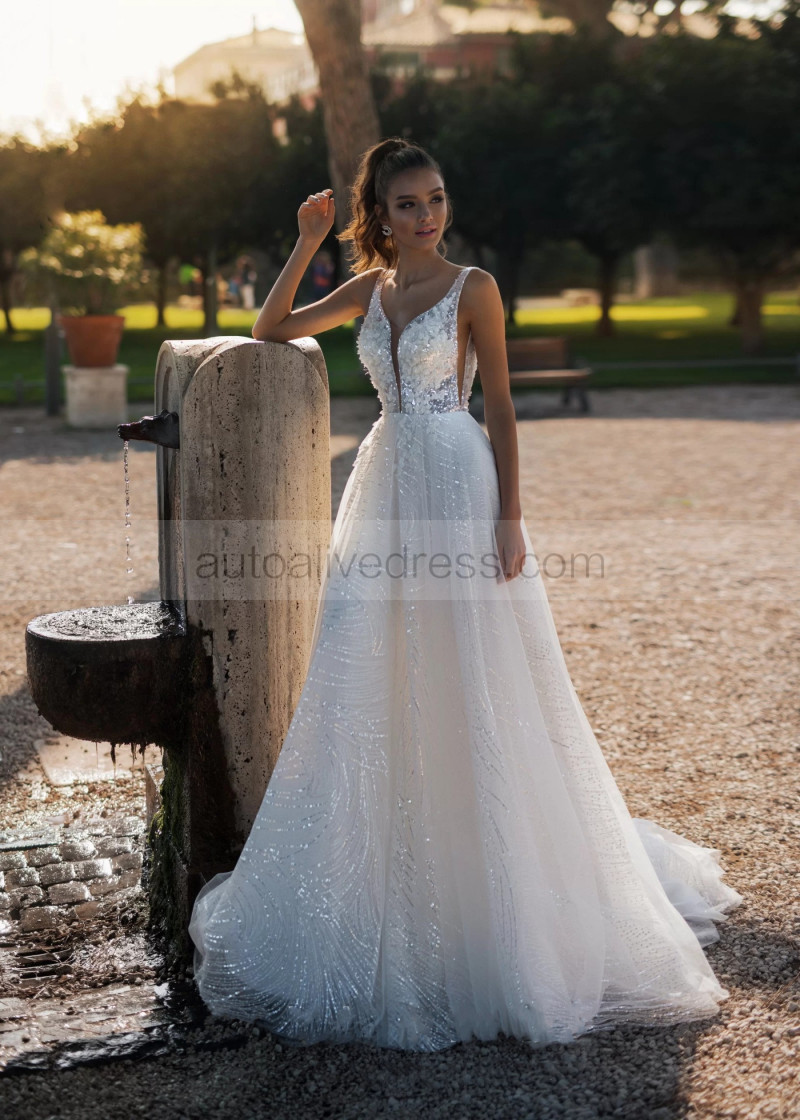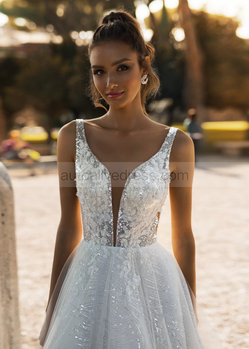 Deep V Neck Beaded Sequined Lace Tulle Wedding Dress