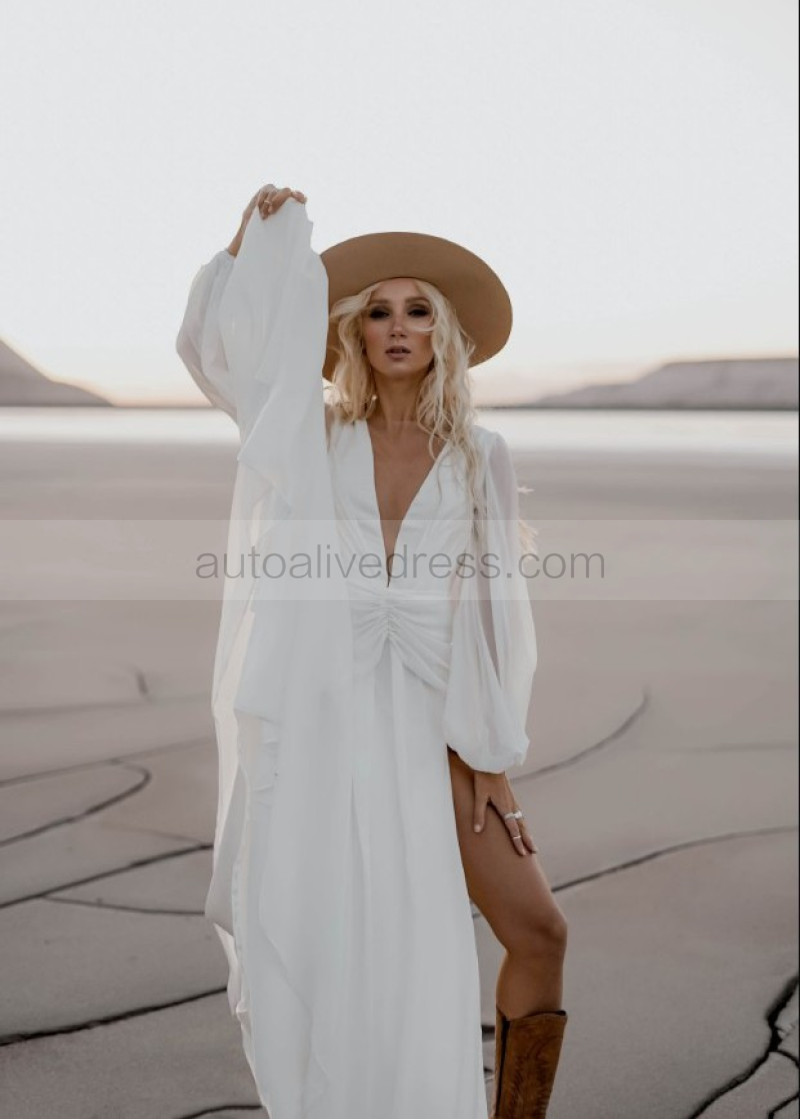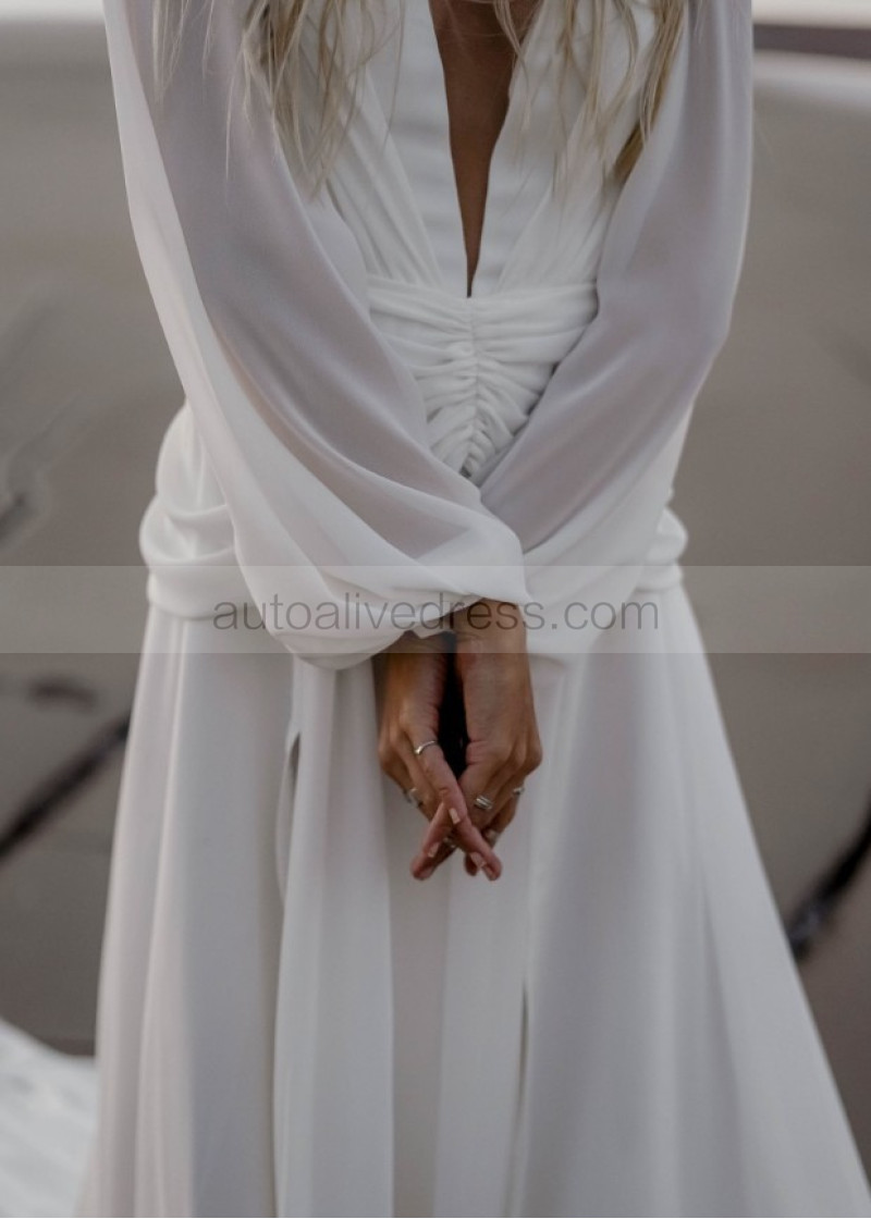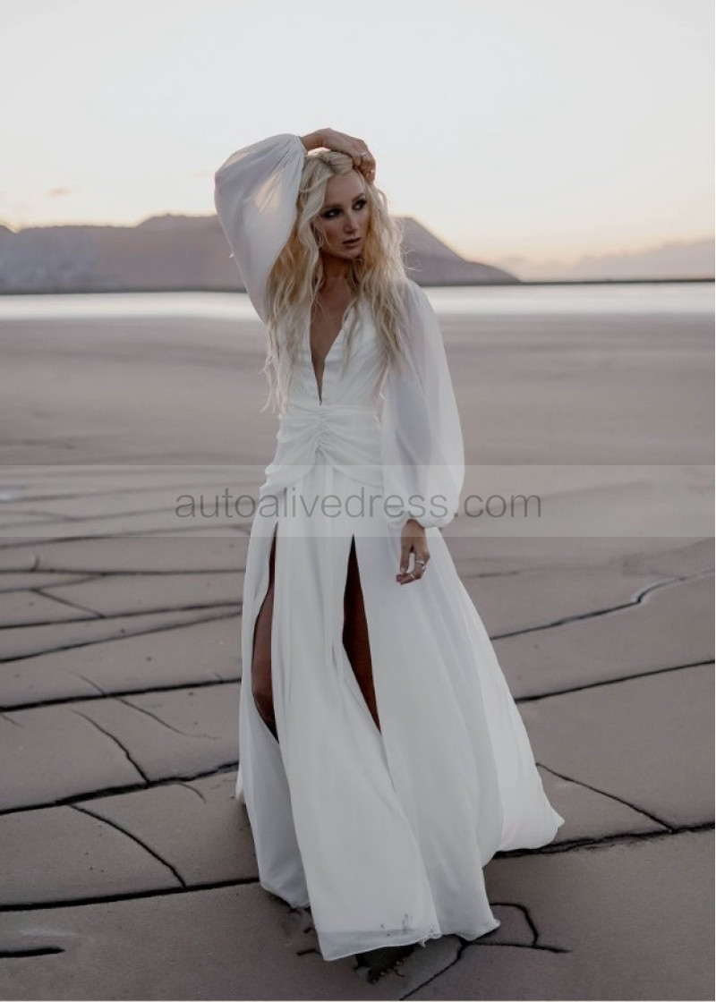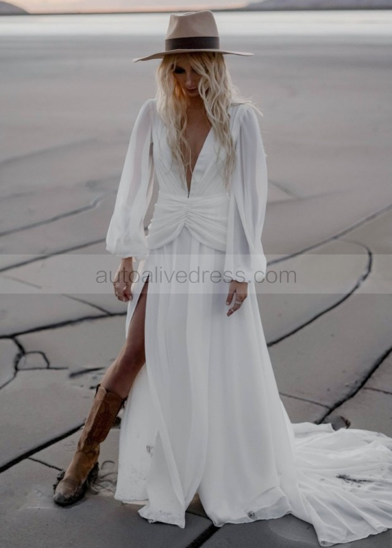 Deep V Neck Ivory Chiffon Slit Wedding Dress