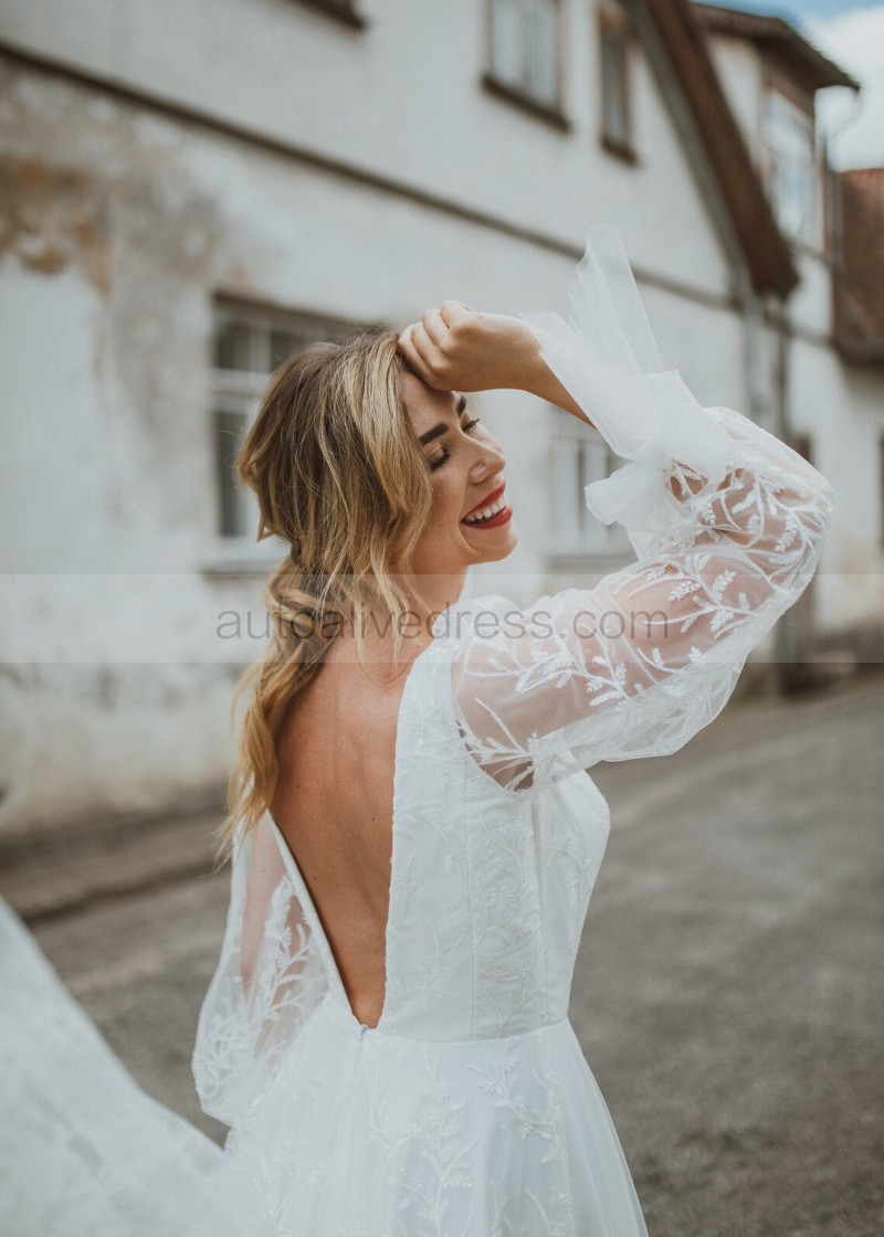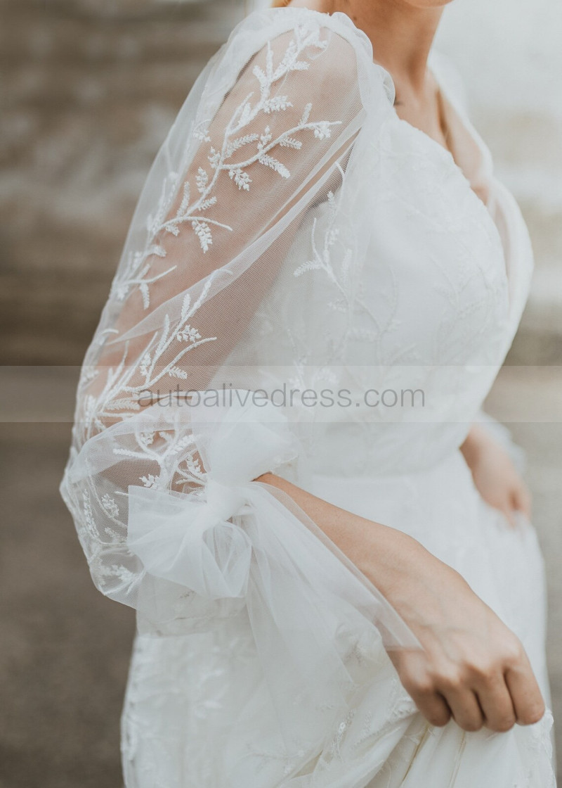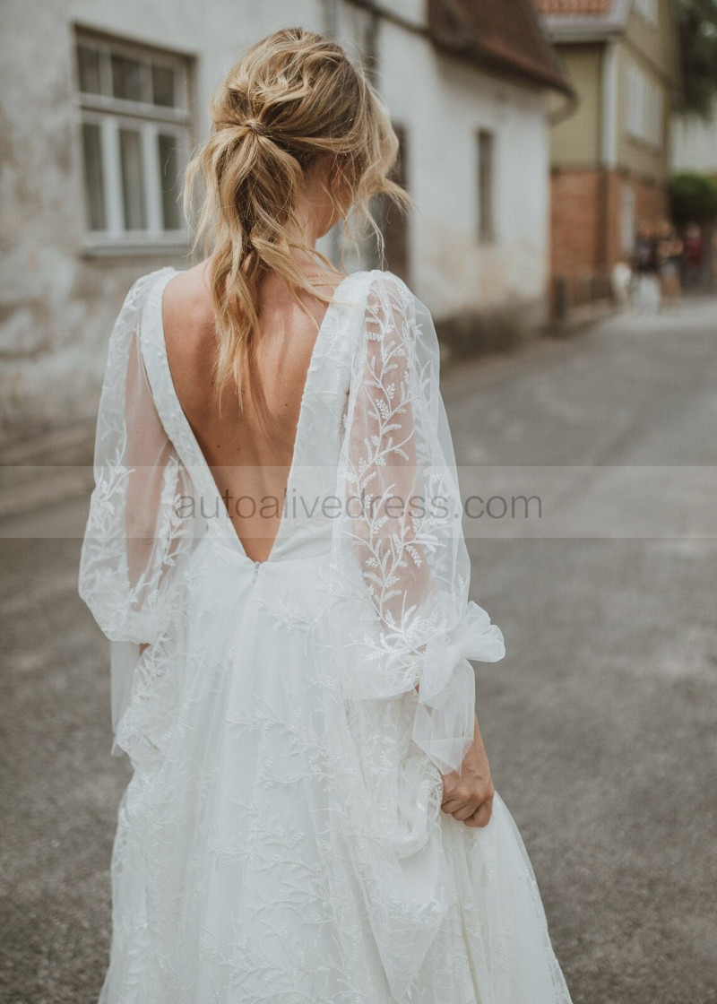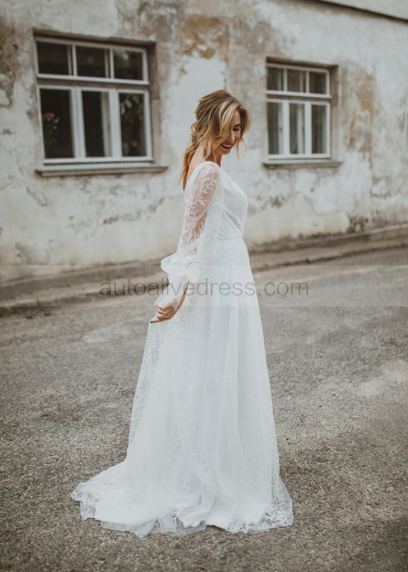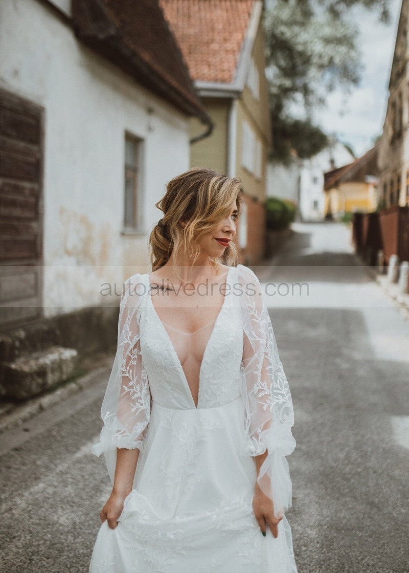 Deep V Neck Ivory Lace Tulle Romantic Wedding Dress