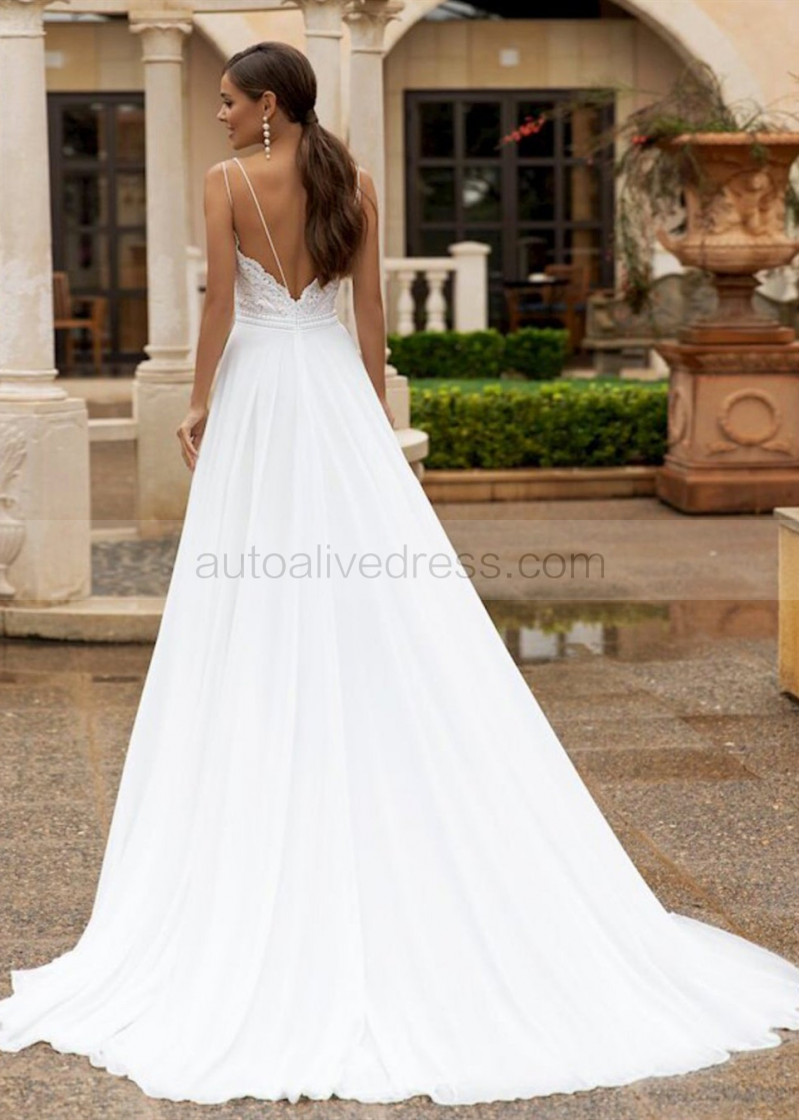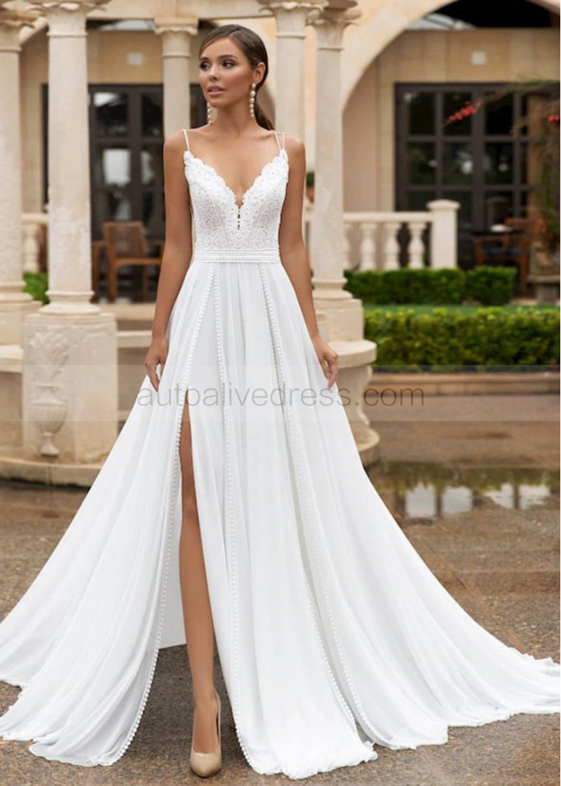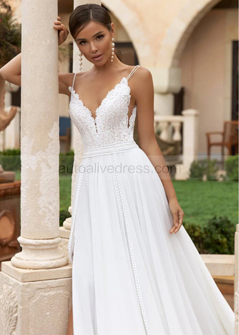 Double Strap White Lace Chiffon Side Split Boho Wedding Dress