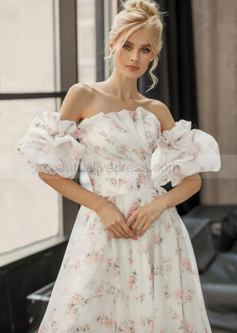 Floral Print Organza Wedding Dress With Removable Puff Sleeves