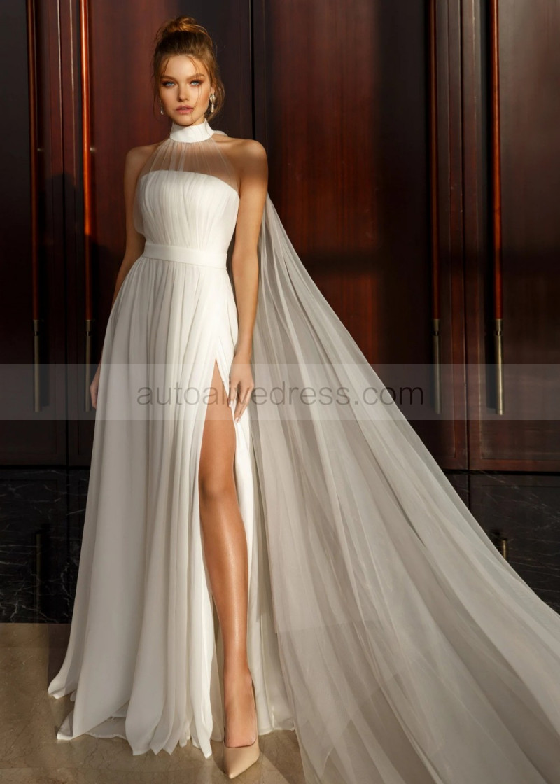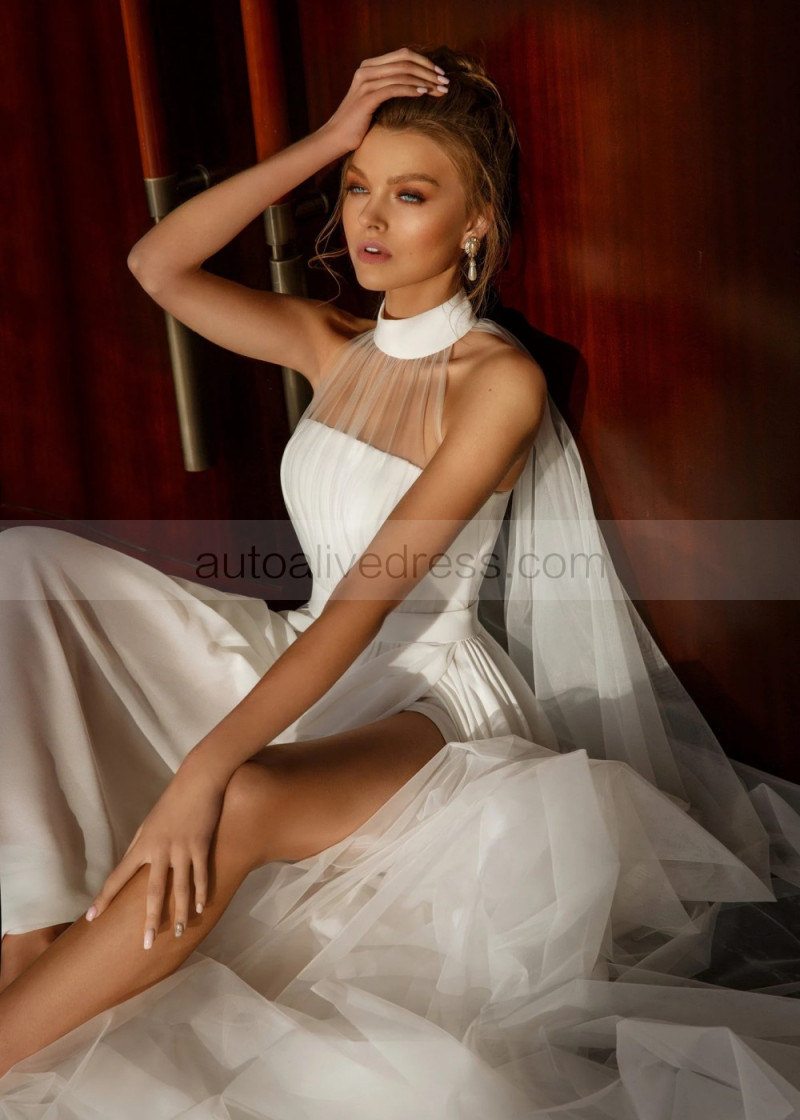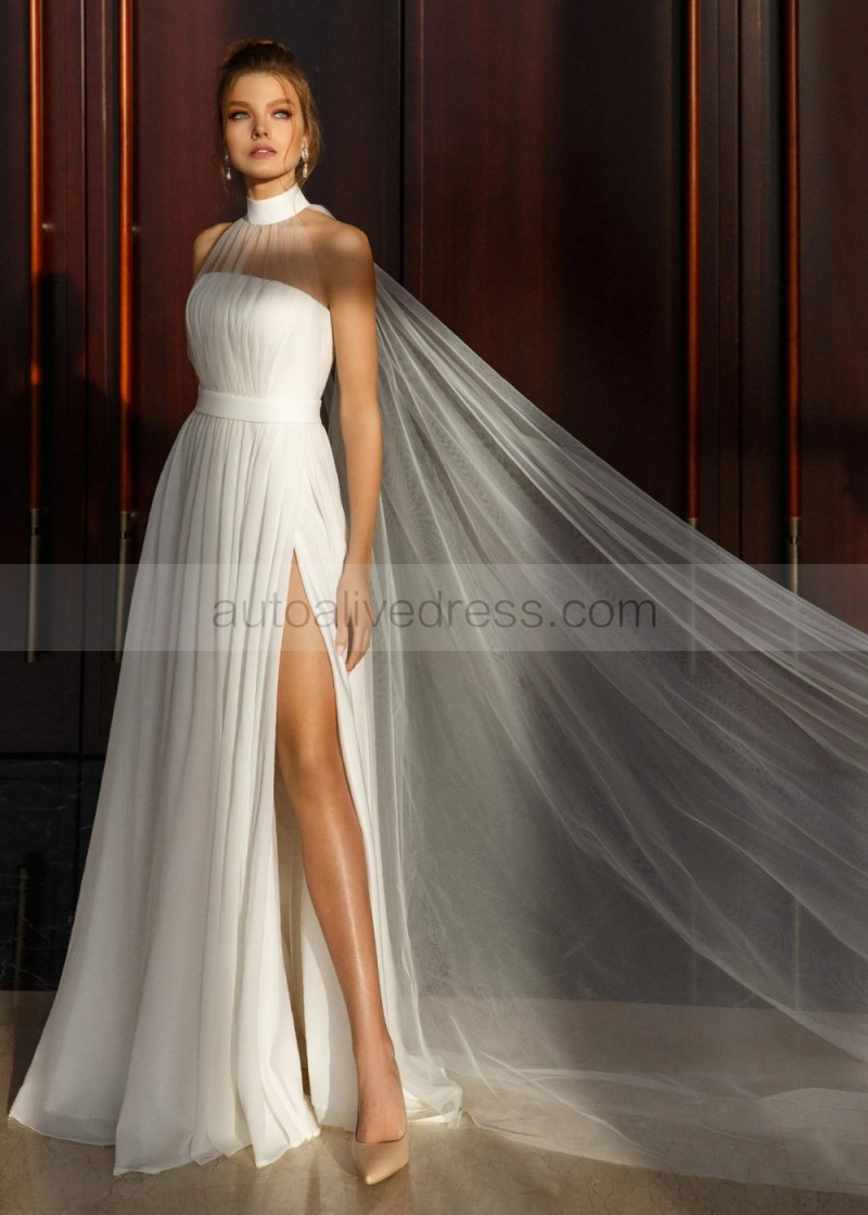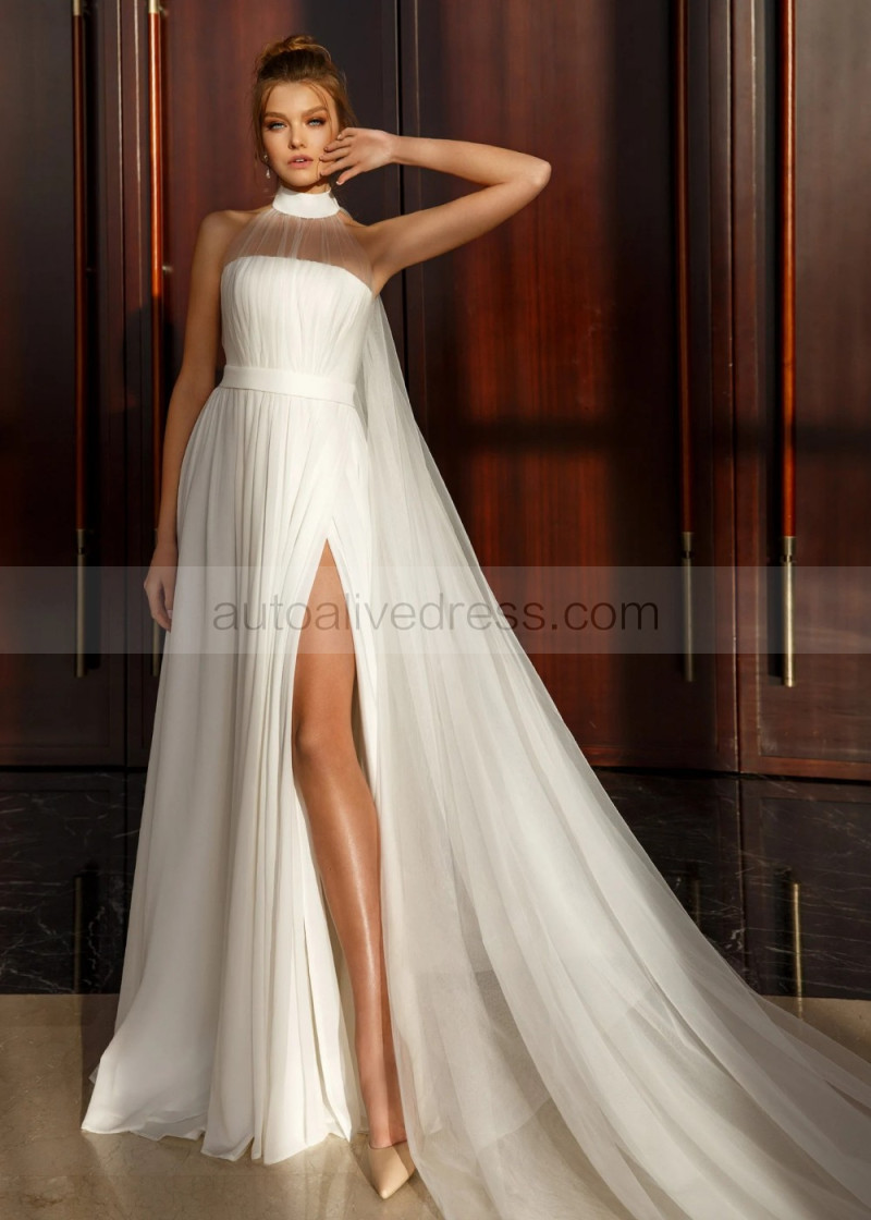Halter Ivory Chiffon Tulle Slit Wedding Dress