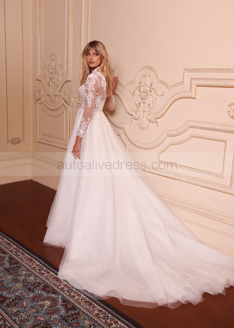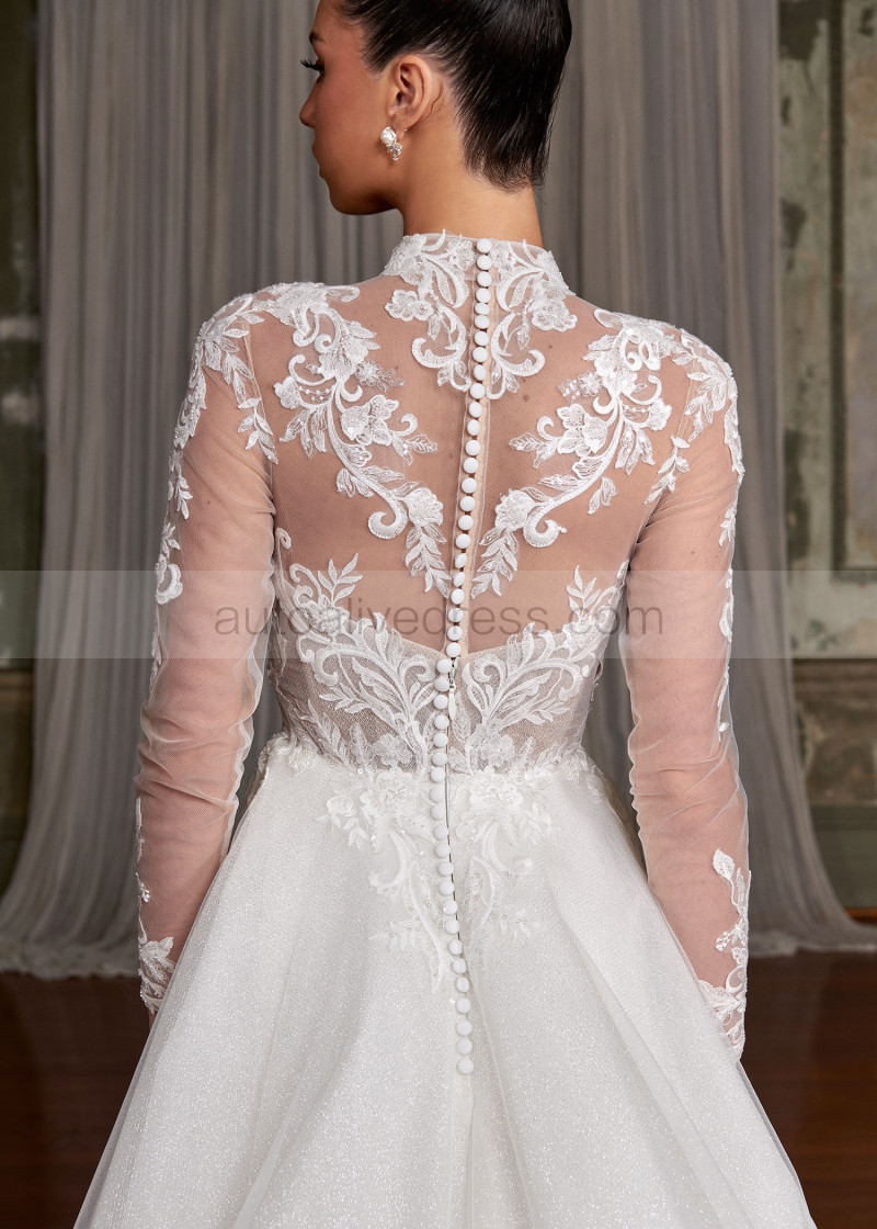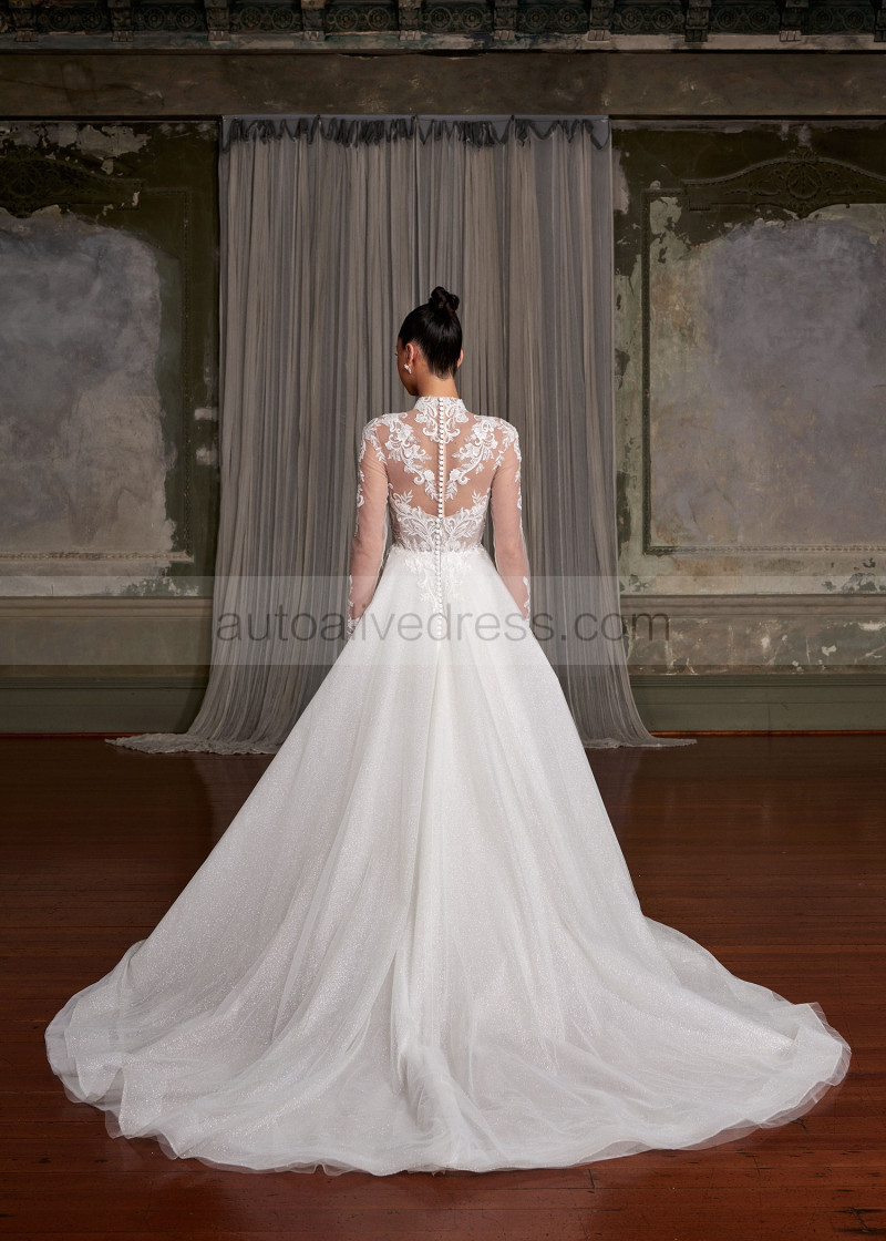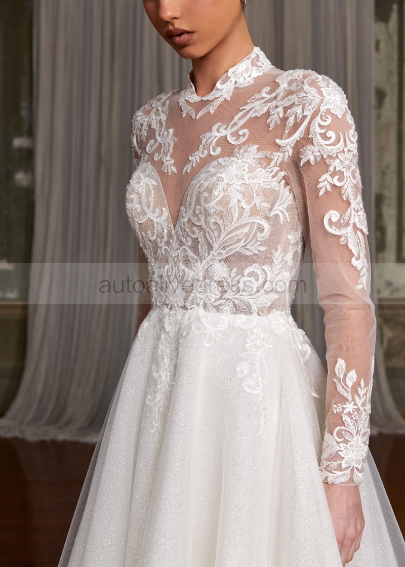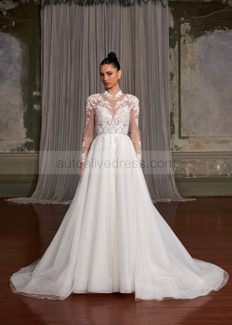 High Neck Ivory Lace Glitter Tulle Stunning Wedding Dress