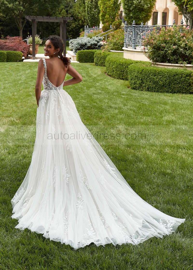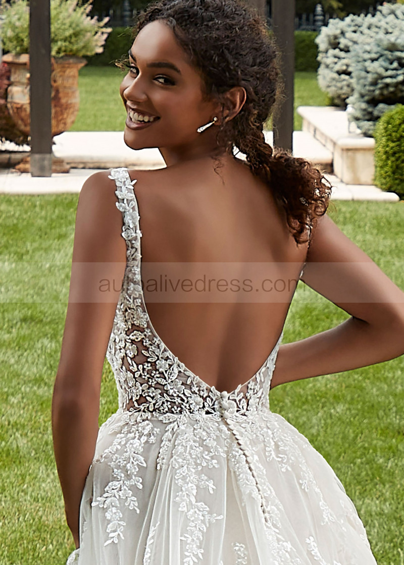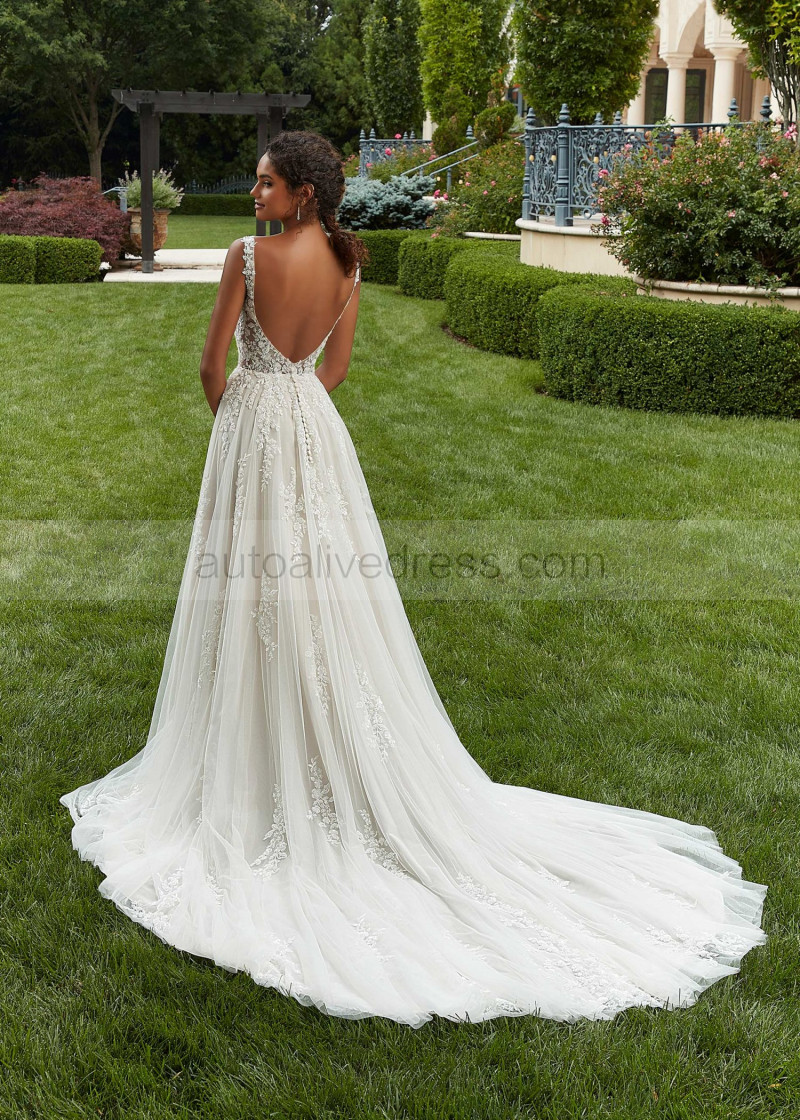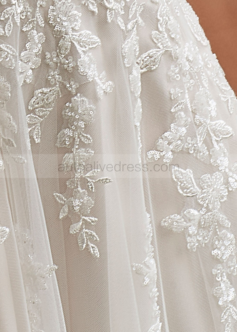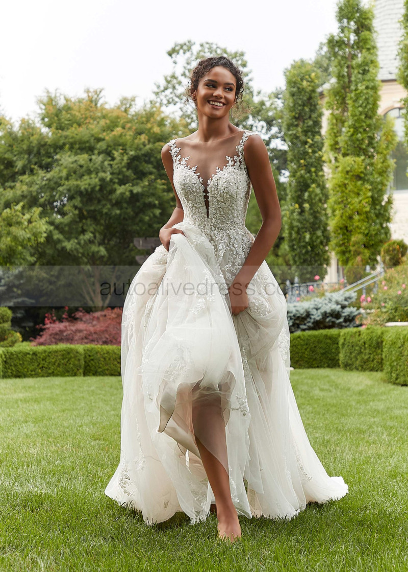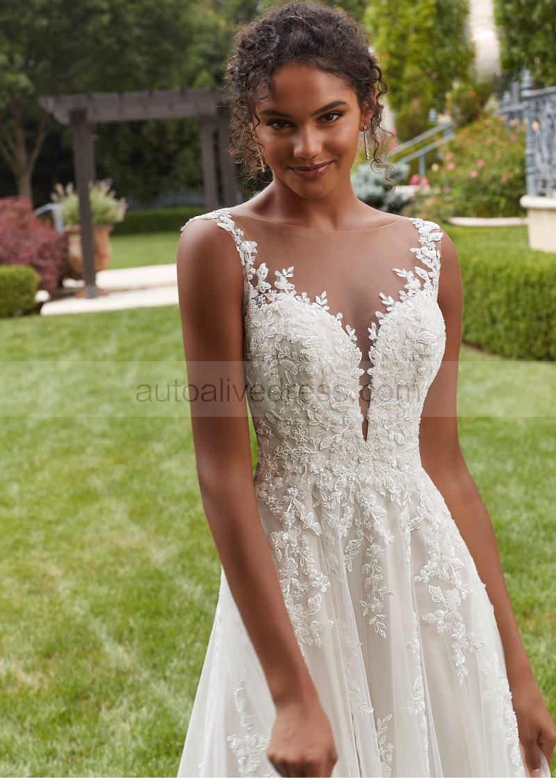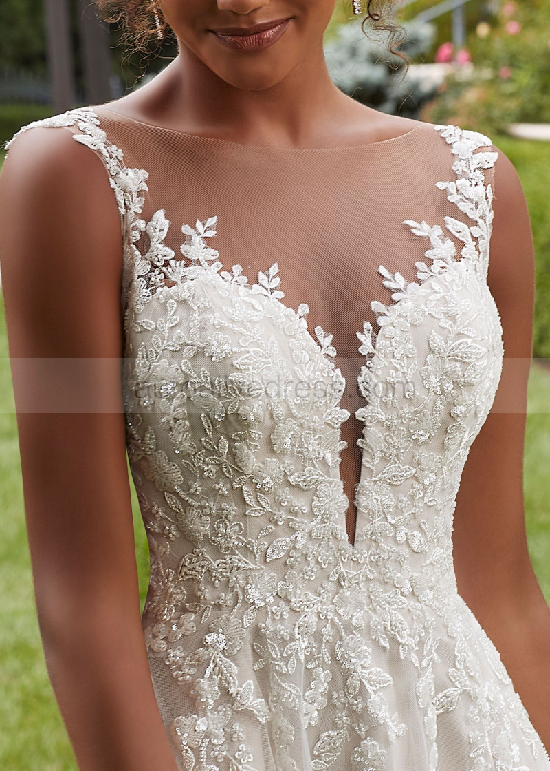 Illusion Neck Beaded Ivory Lace Tulle Sparkly Wedding Dress