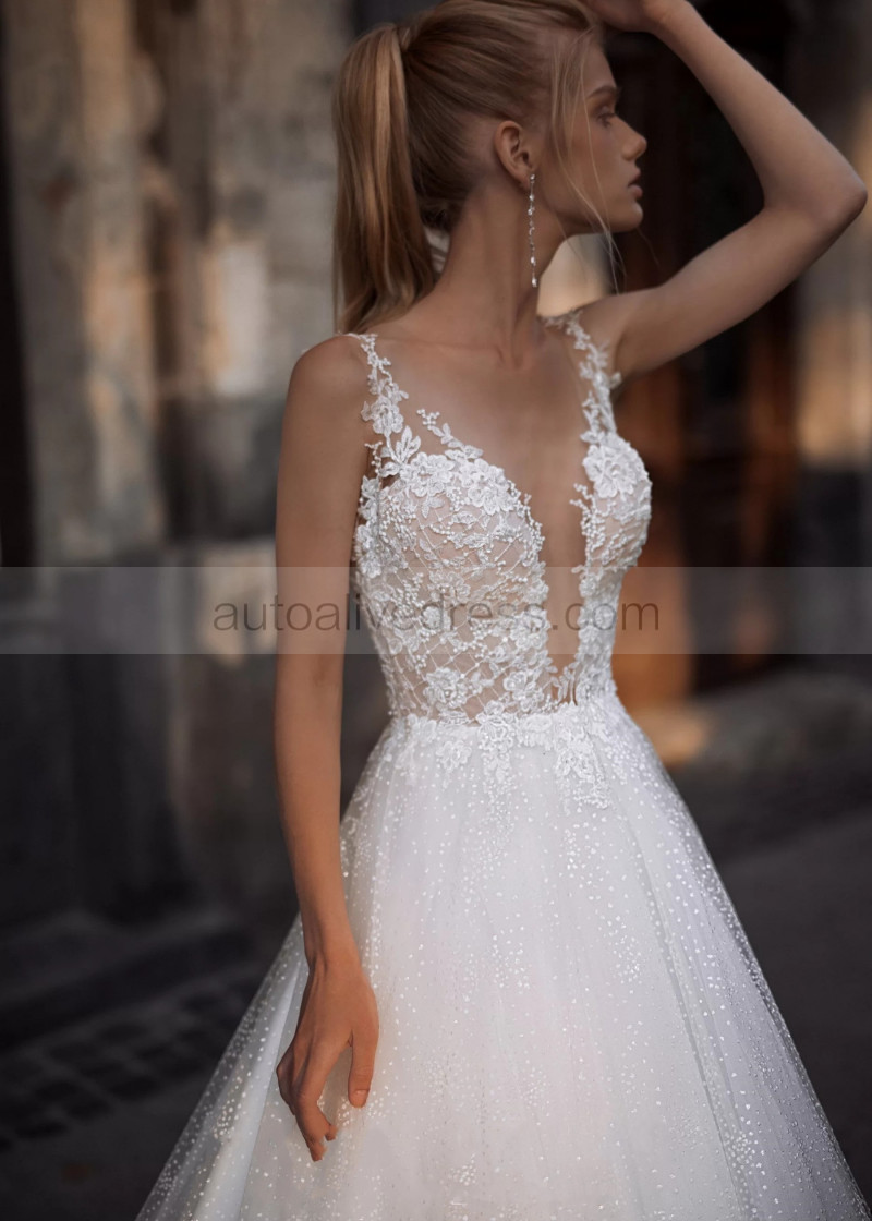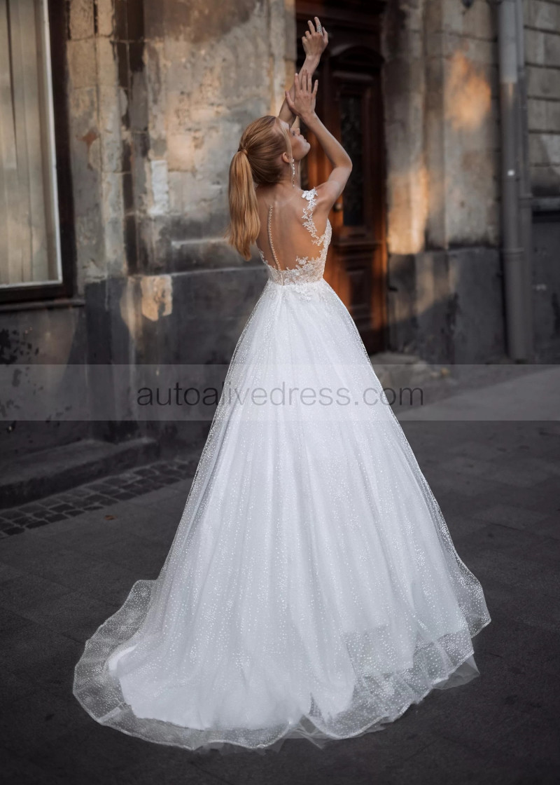 Illusion Neck Ivory Lace Glitter Tulle Wedding Dress