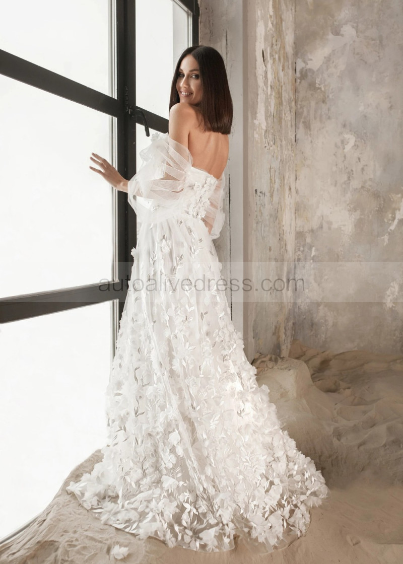 Ivory 3D Flowers Lace Tulle Slit Fairy Wedding Dress
