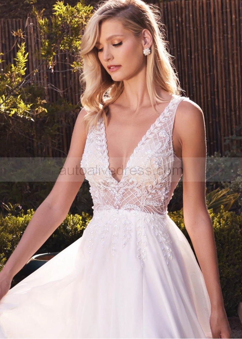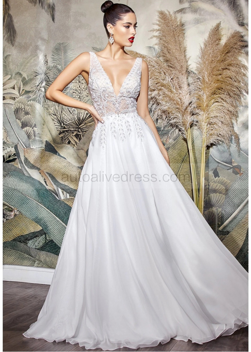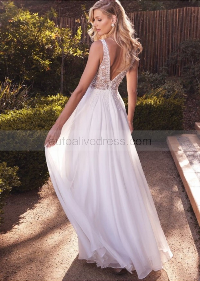 Ivory Beaded Chiffon Slit Sexy Wedding Dress