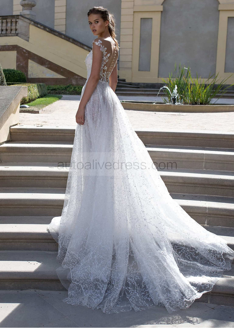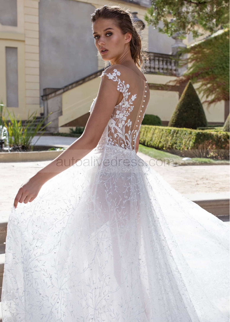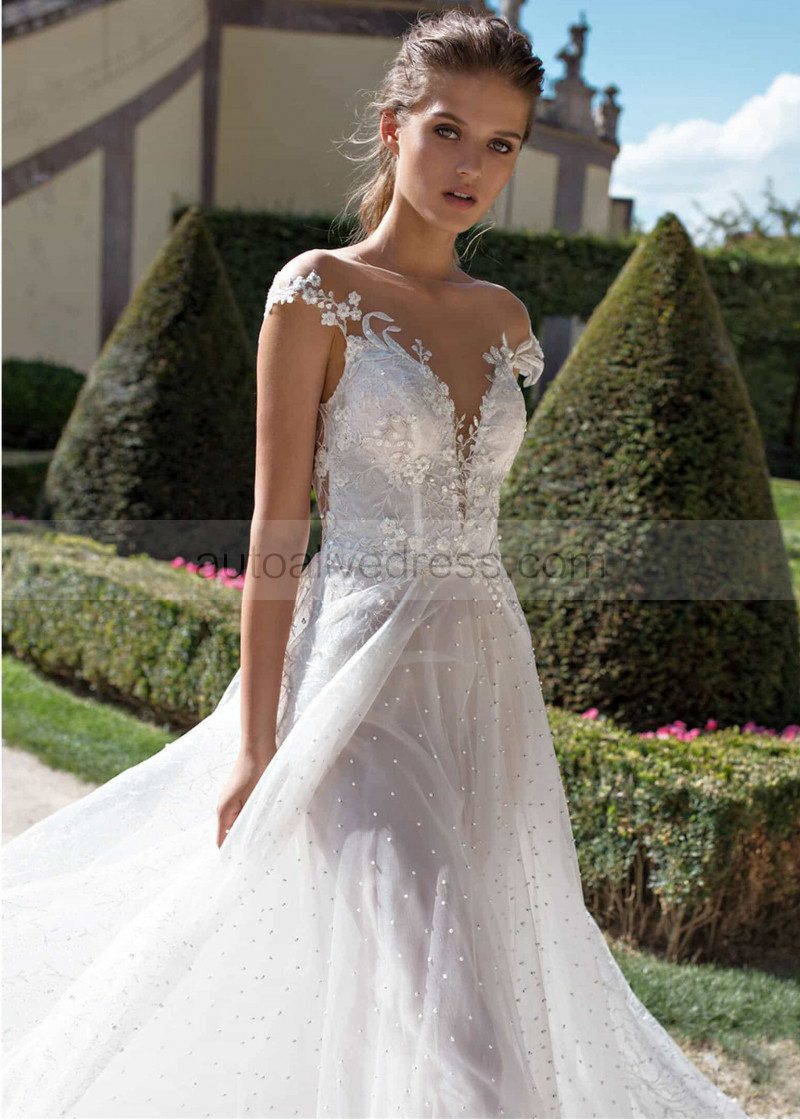 Ivory Beaded Floral Lace Sheer Back Wedding Dress