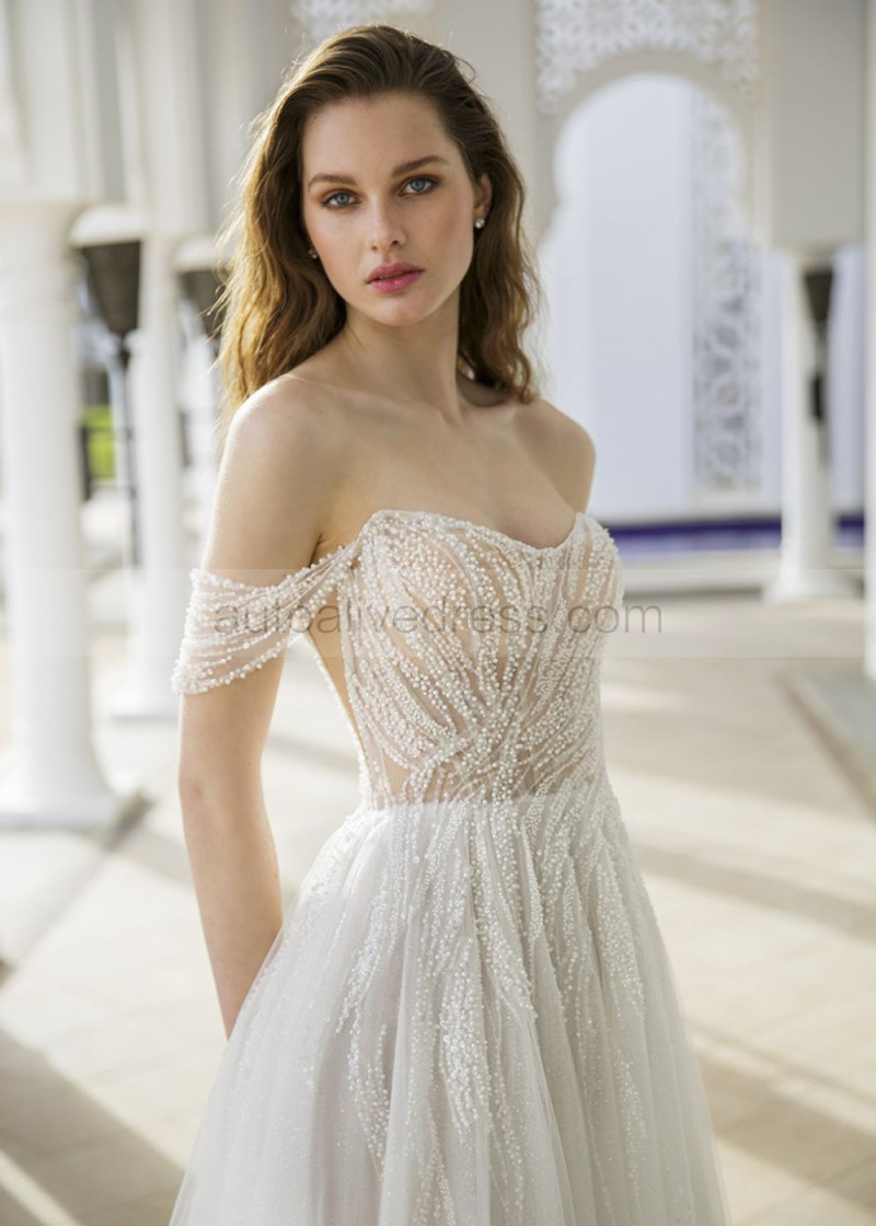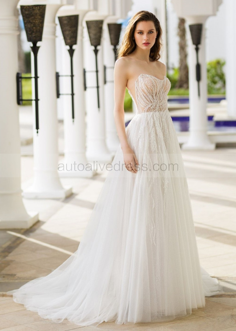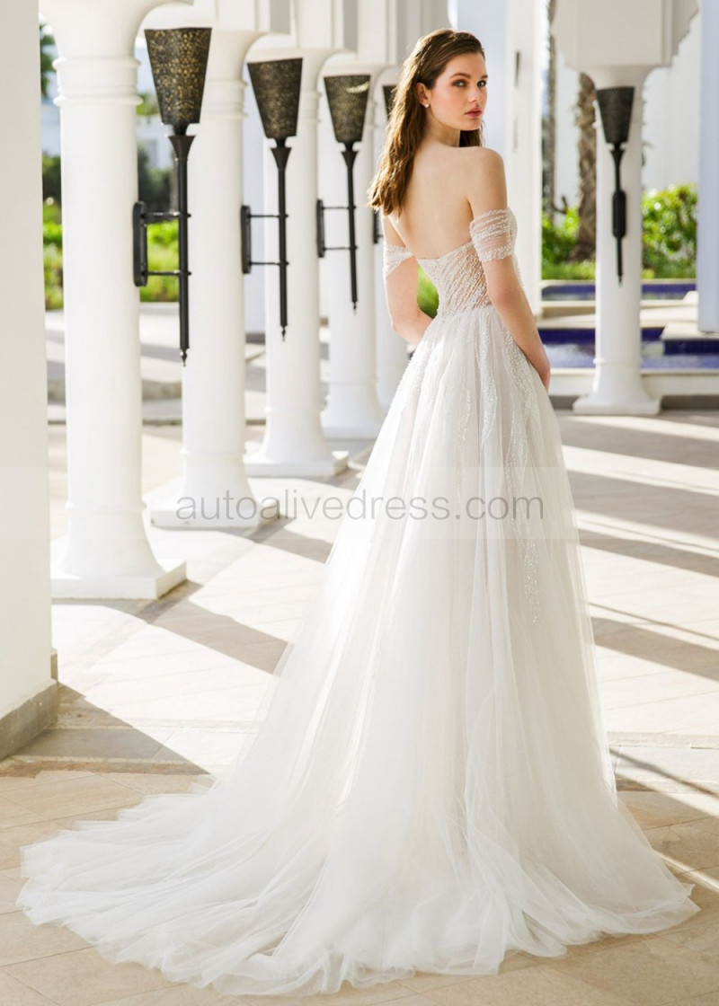 Ivory Beaded Lace Glitter Tulle Wedding Dress With Detachable Straps