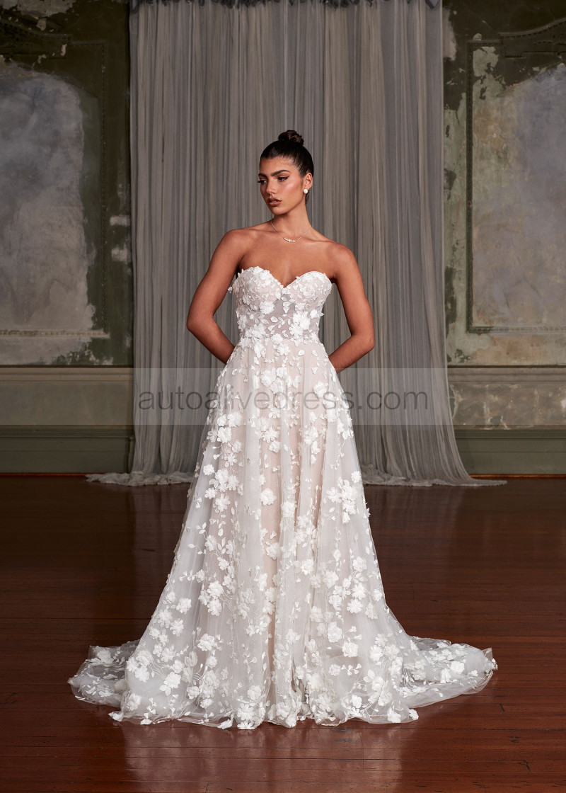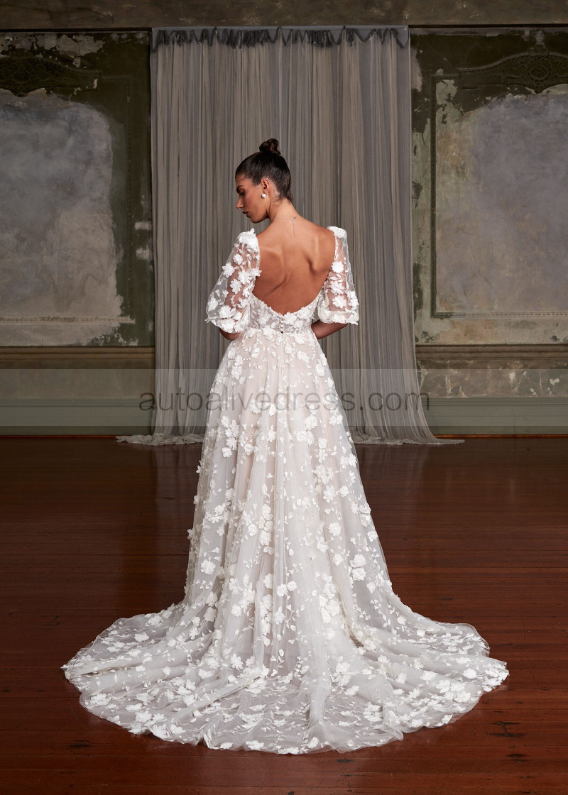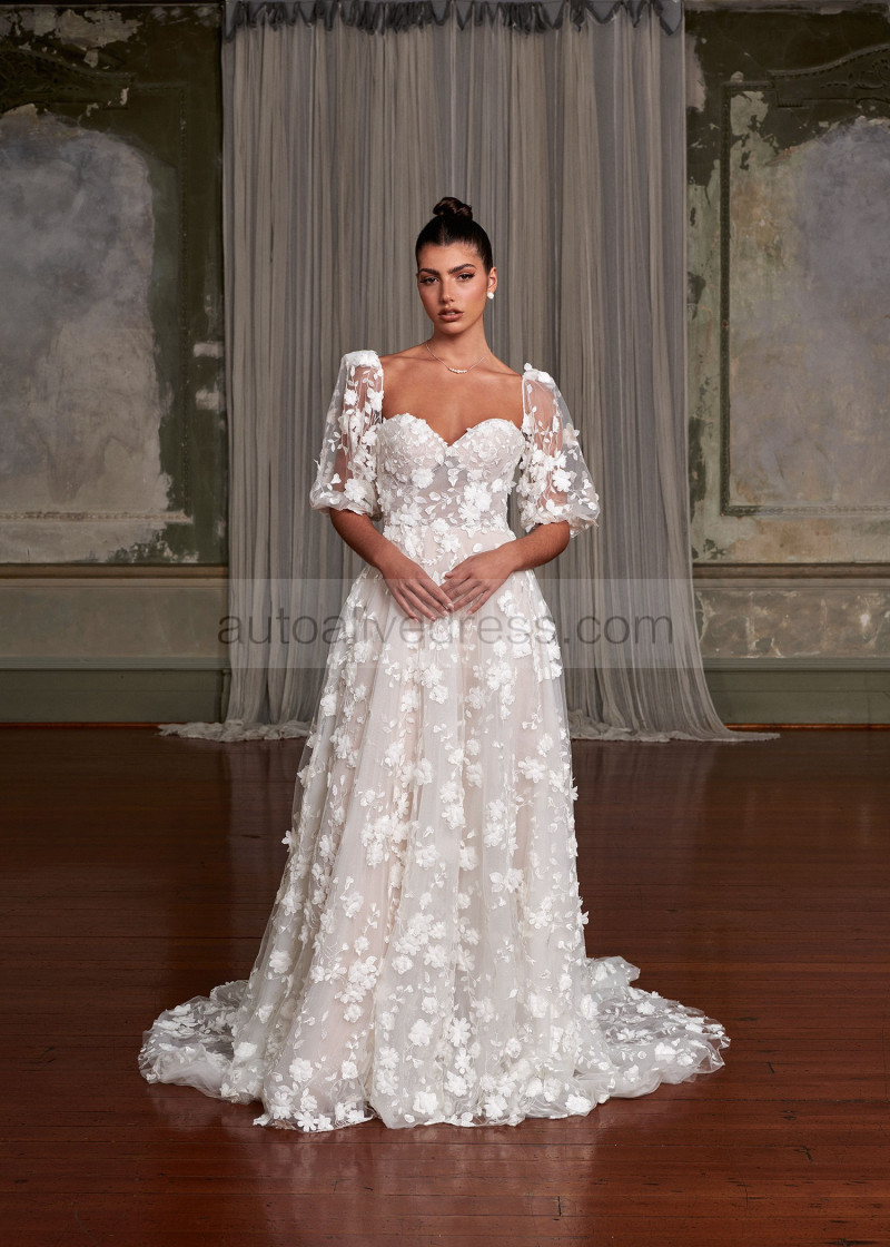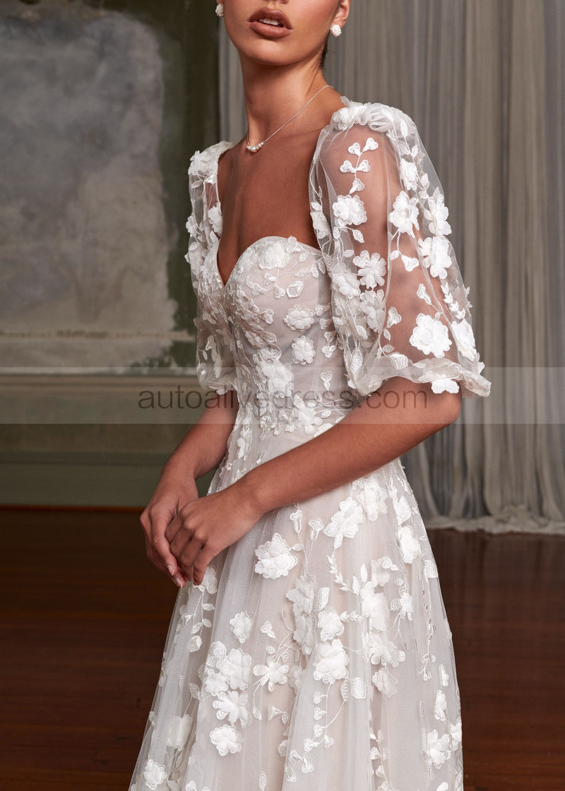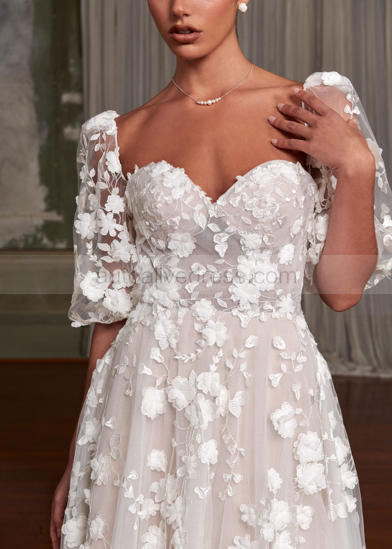 Ivory Embroidered Lace Tulle Fairytale Wedding Dress With Detachable Sleeves