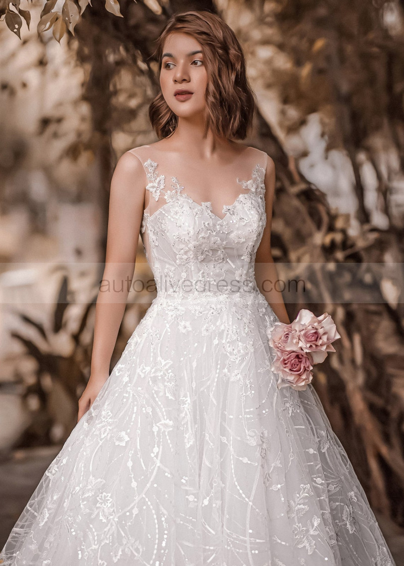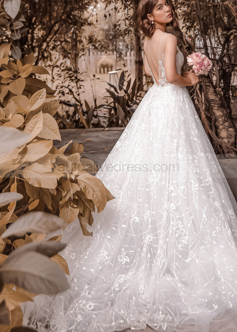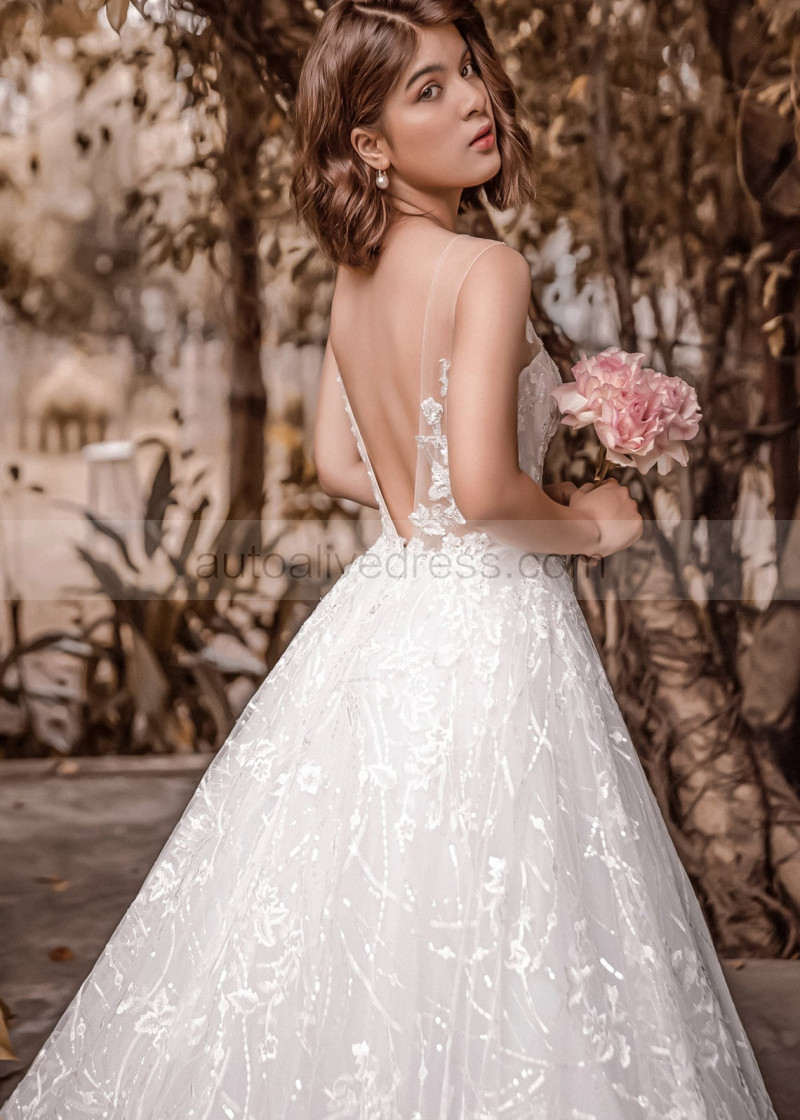 Ivory Floral Lace Tulle Open Back Wedding Dress