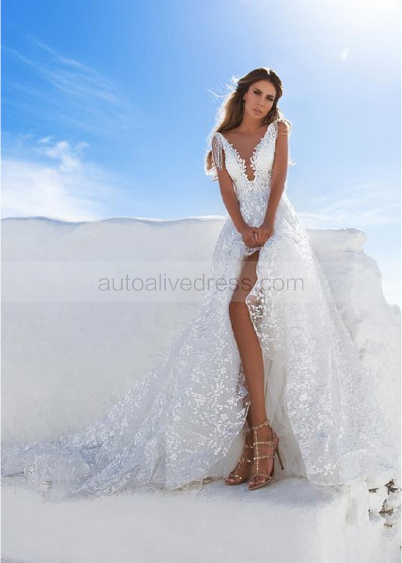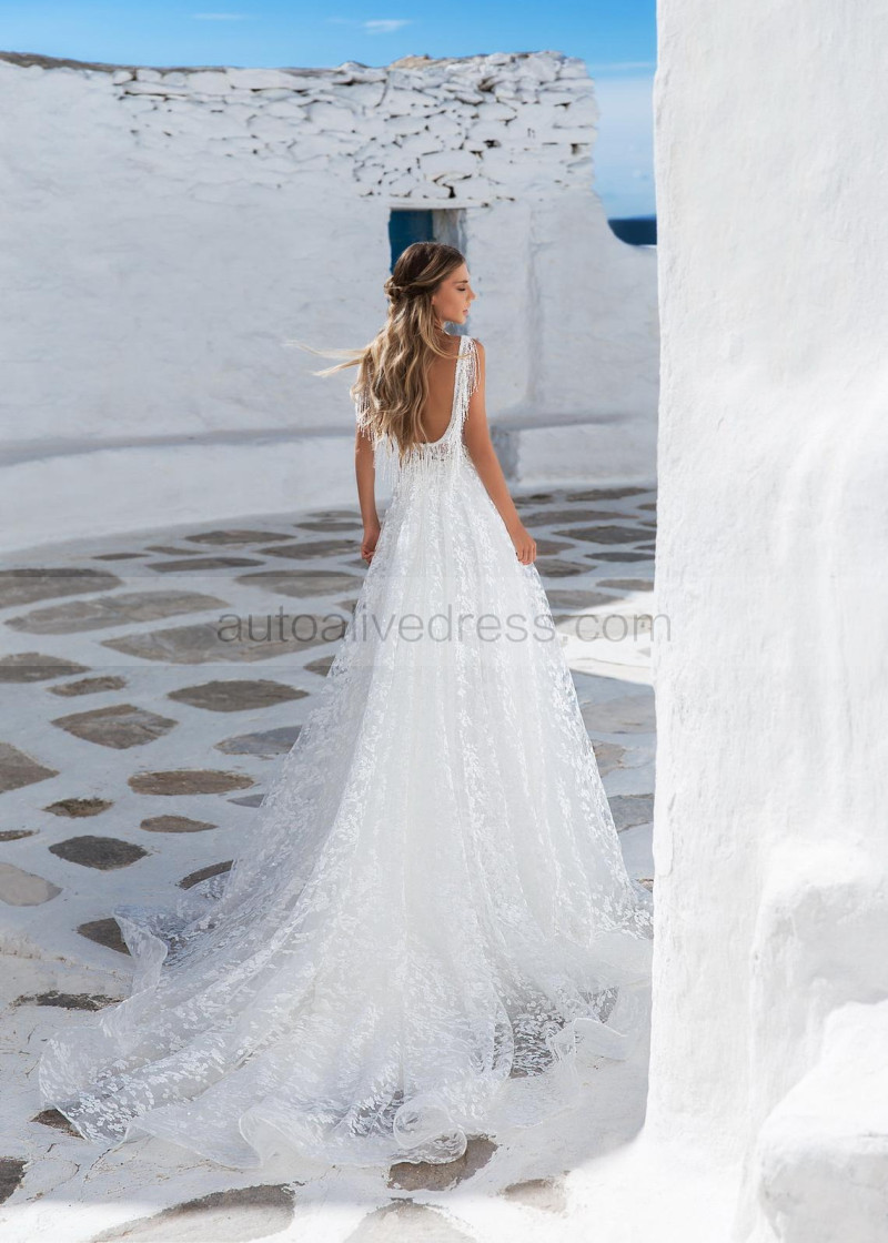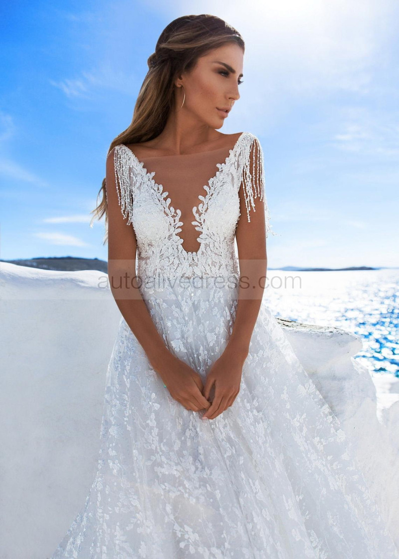 Ivory Floral Lace Tulle U Back Sparkling Wedding Dress