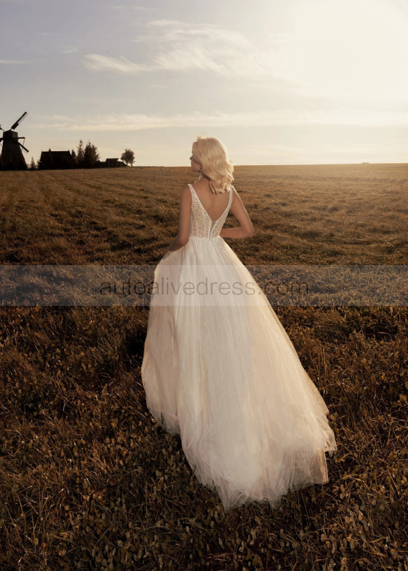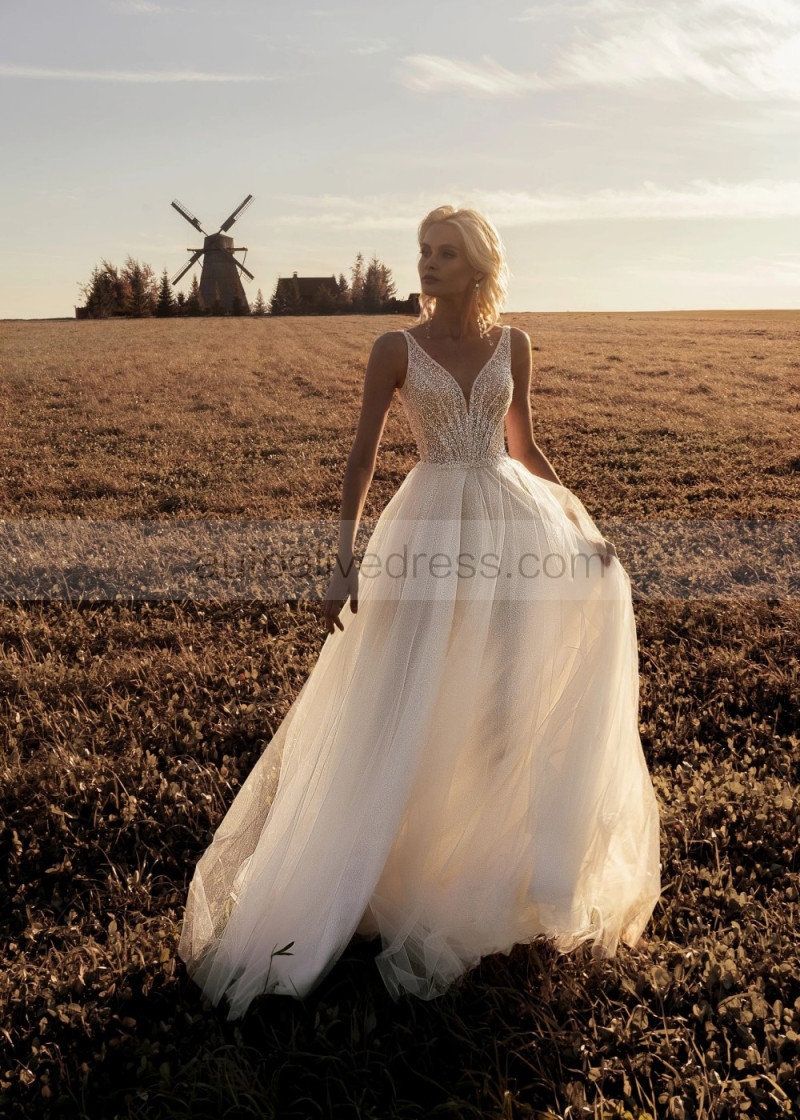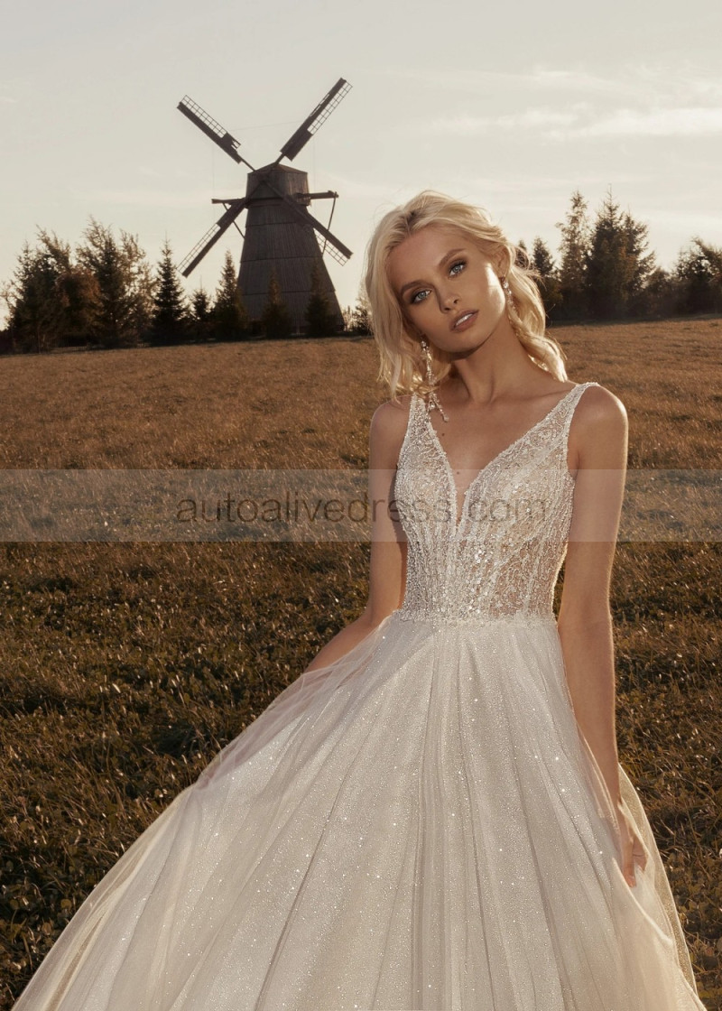 Ivory Glitter Lace Tulle Modern Wedding Dress
