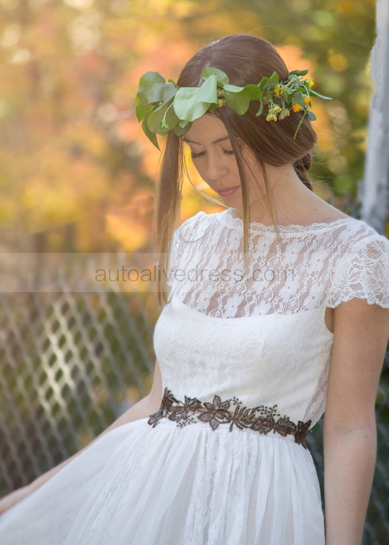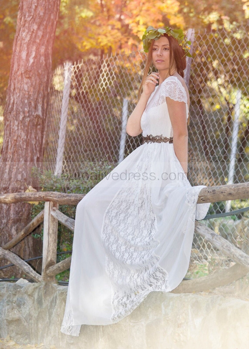 Ivory Lace Chiffon Open Back Hippie Wedding Dress