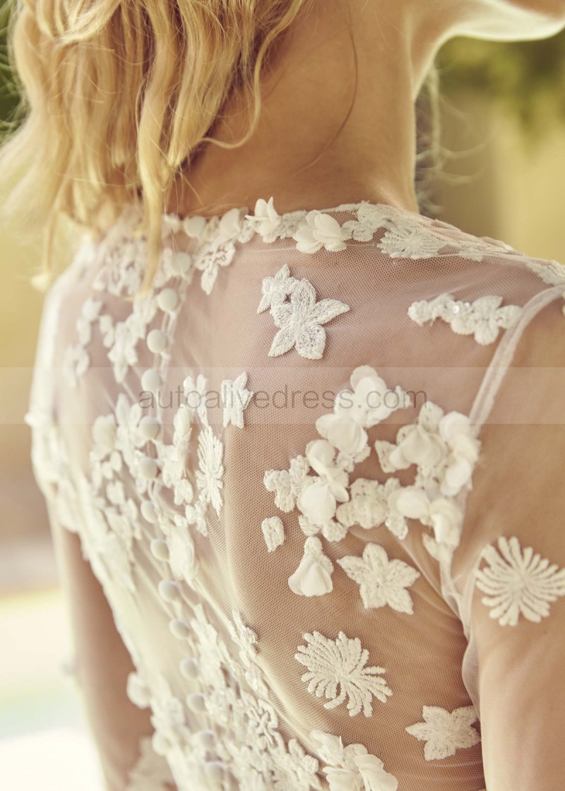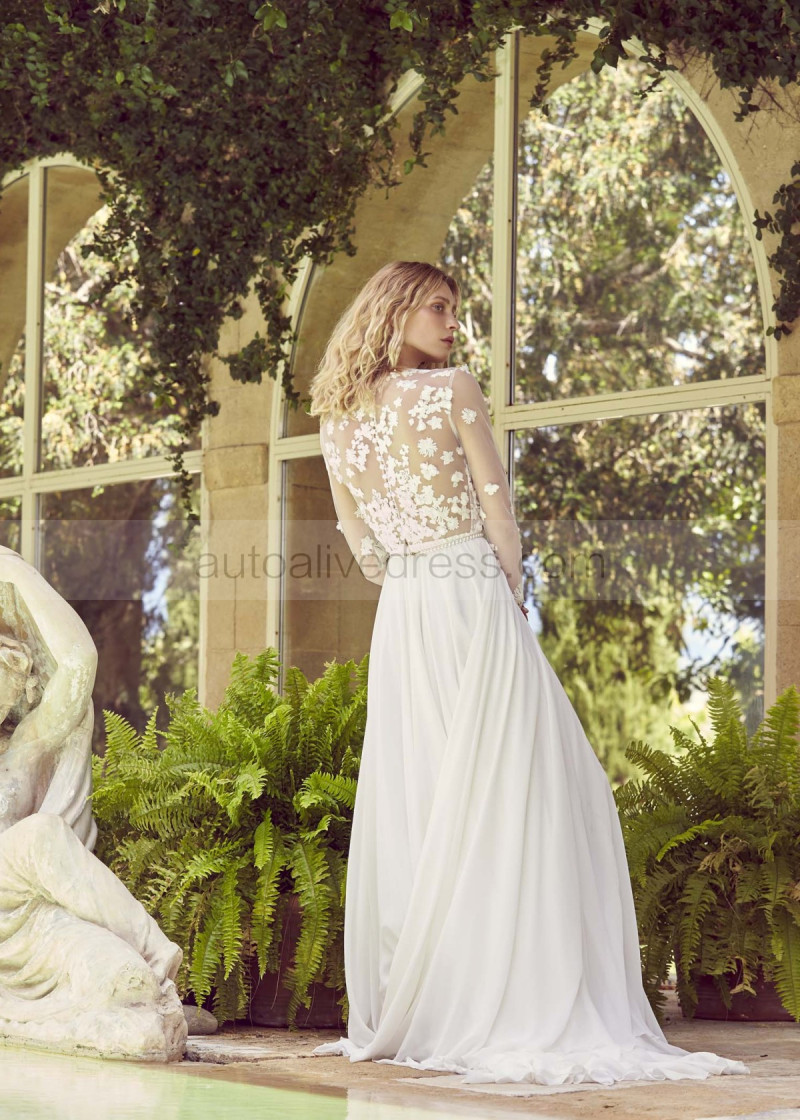 Ivory Lace Chiffon Pearl Embellished Tender Wedding Dress