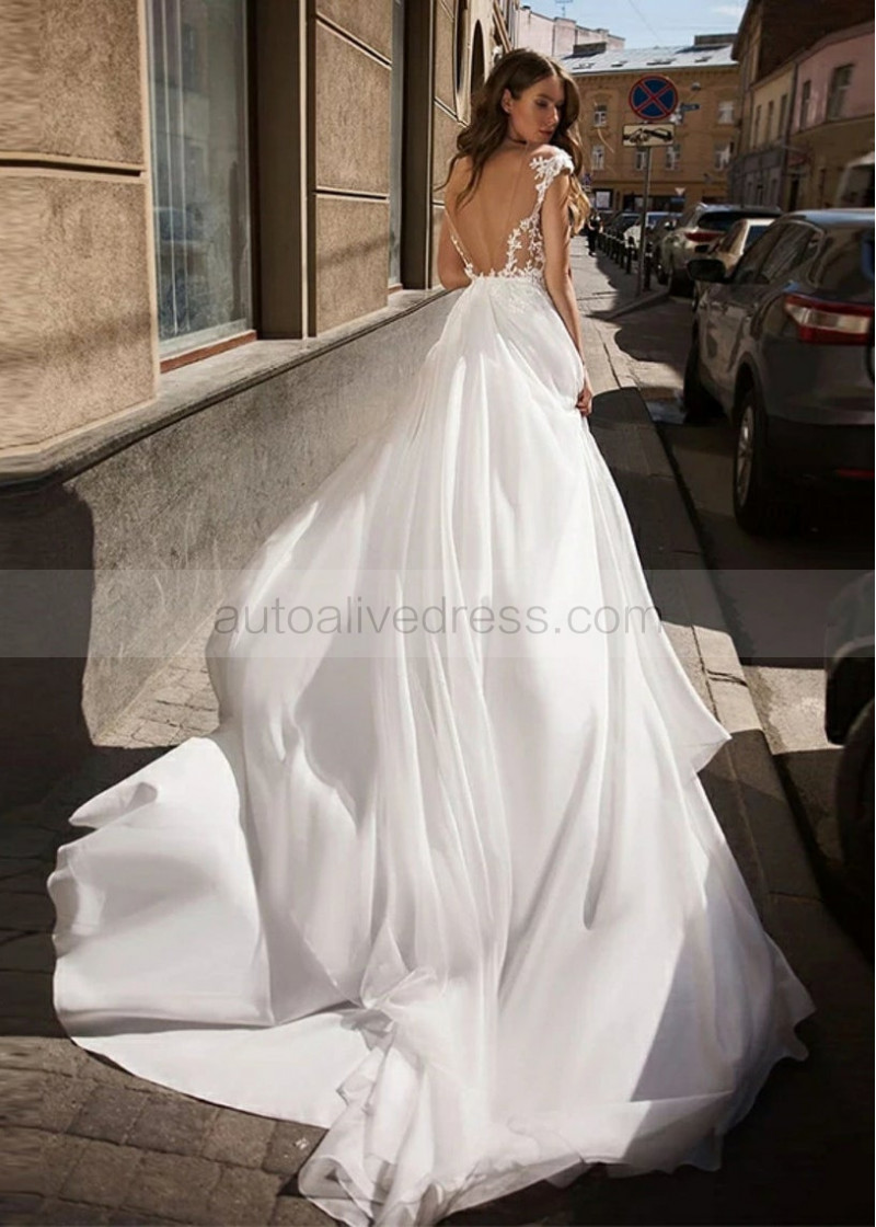 Ivory Lace Chiffon Side Slit Summer Beach Wedding Dress