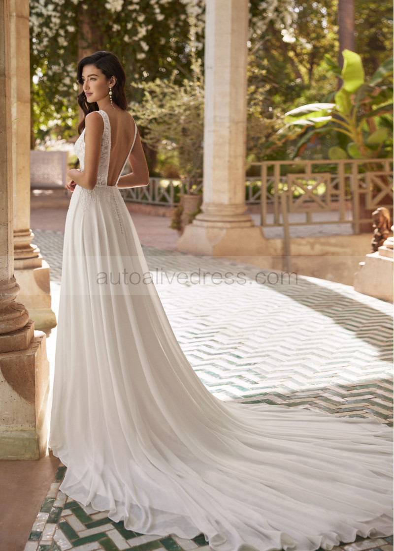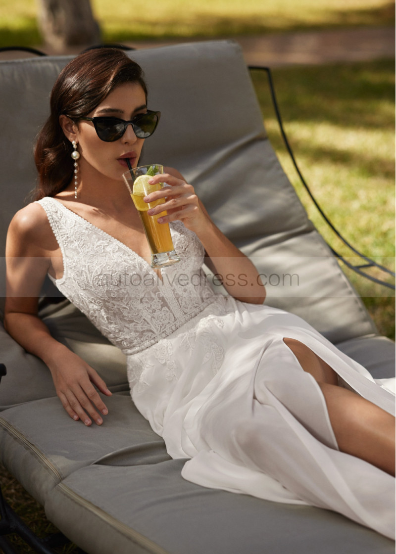 Ivory Lace Chiffon Slit Sexy Boho Beach Wedding Dress